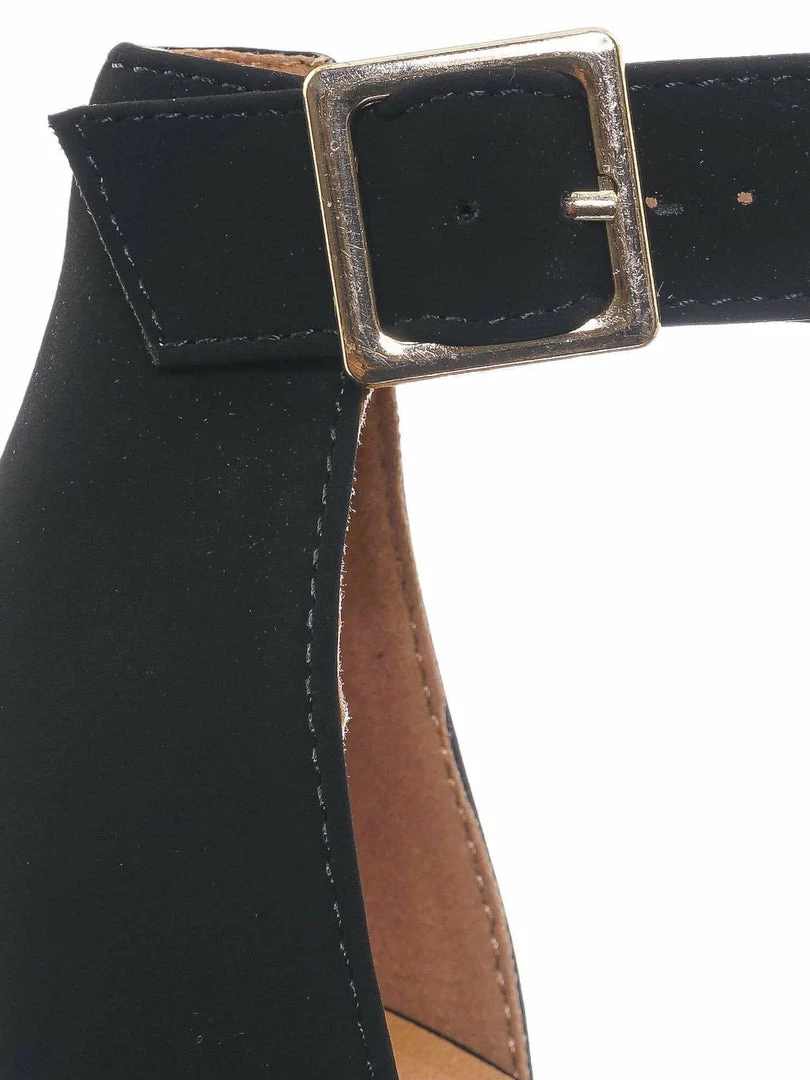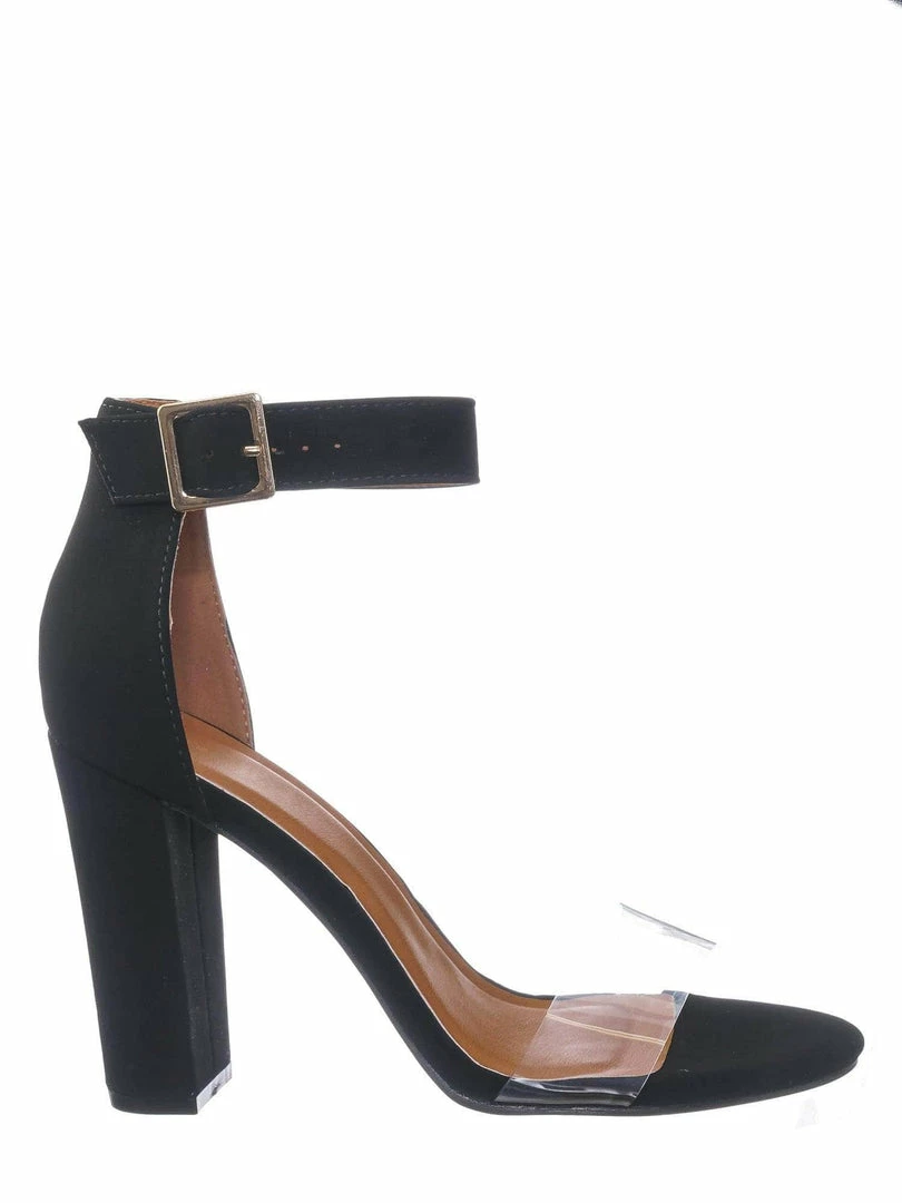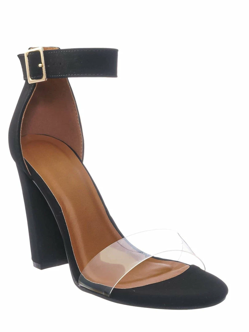 Product Detail : These high heels features a flexible clear/Lucite front strap, rounded open toe, pin needle buckle closure, chunky block heel, two piece construction, man made outsoles and lightly padded insoles.