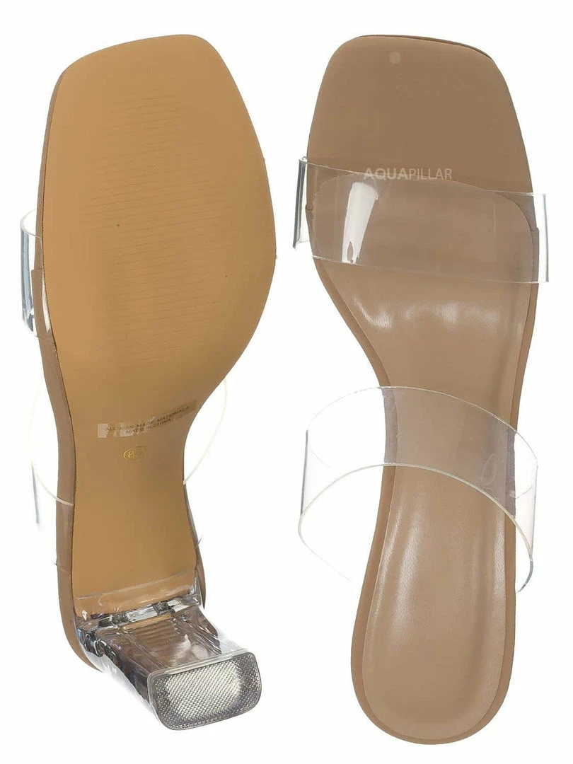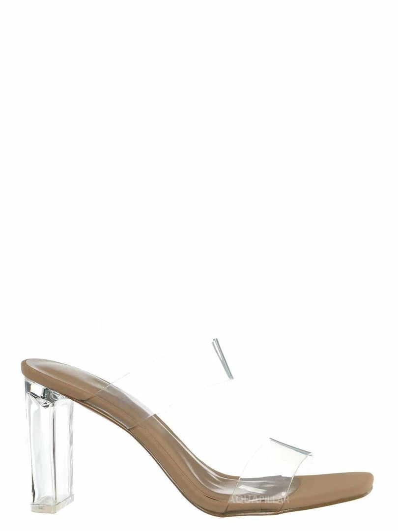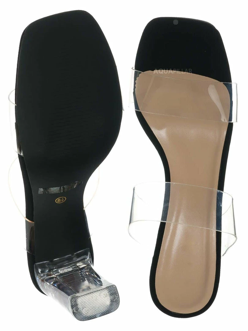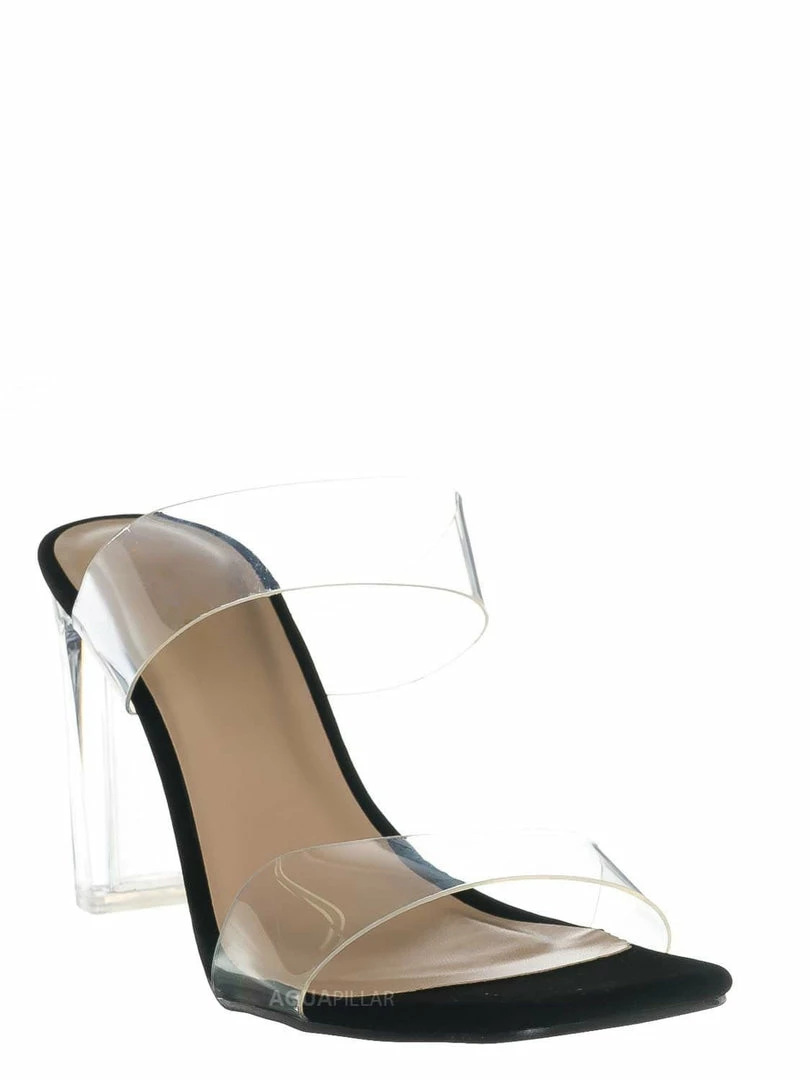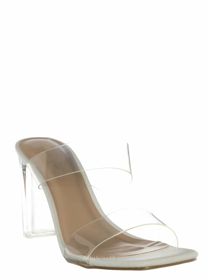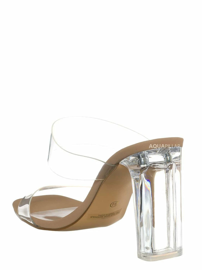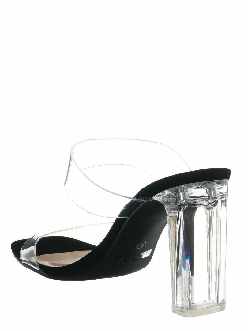 Product Detail : This high-heel “glass” slipper features an acrylic glass high heel and double Lucite vinyl band. The slide-in mule construction makes it easy to slip in and out of the heel.