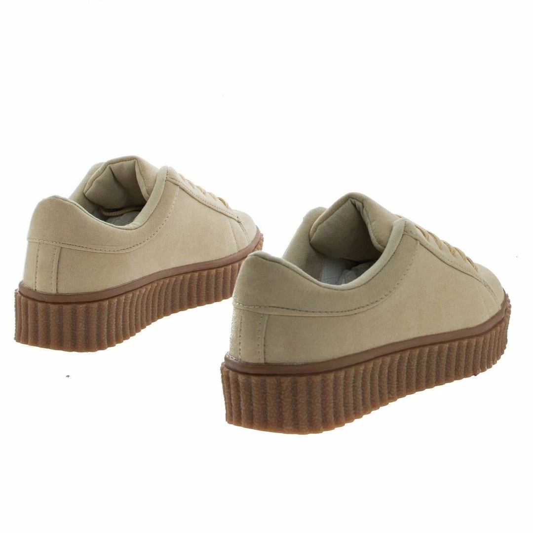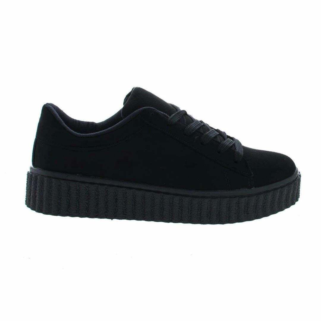 Classic sneaker with 1 inch rubber platform sole. (Please note that these measurements are based on a size 7). Style fits true to size. Available in Black, Natural (listed as Beige), Burgundy (listed as Red)etc. All man made materials. By Wild Diva