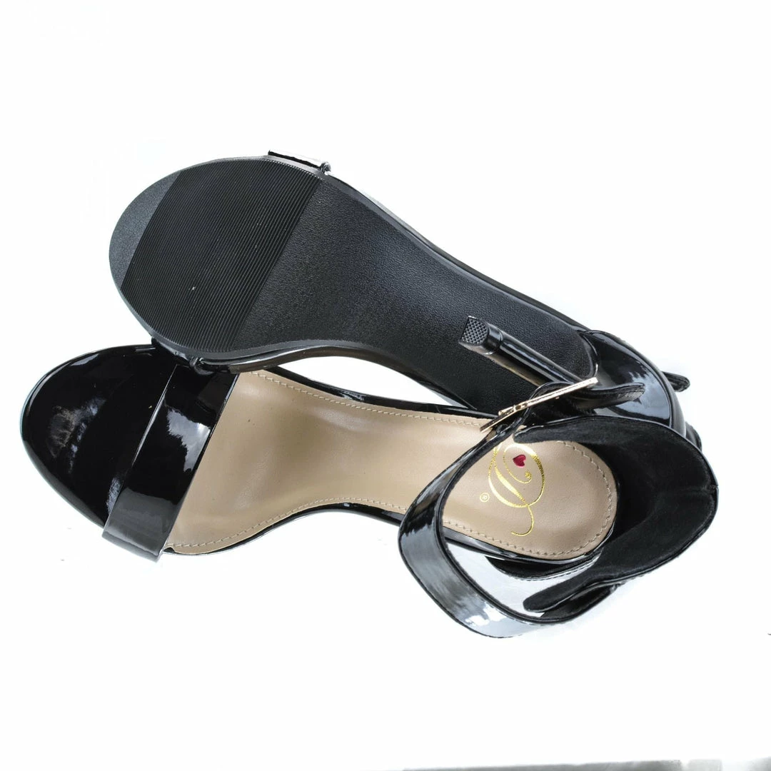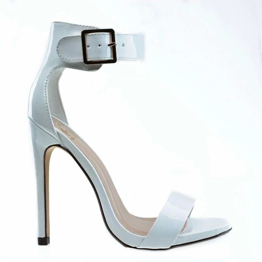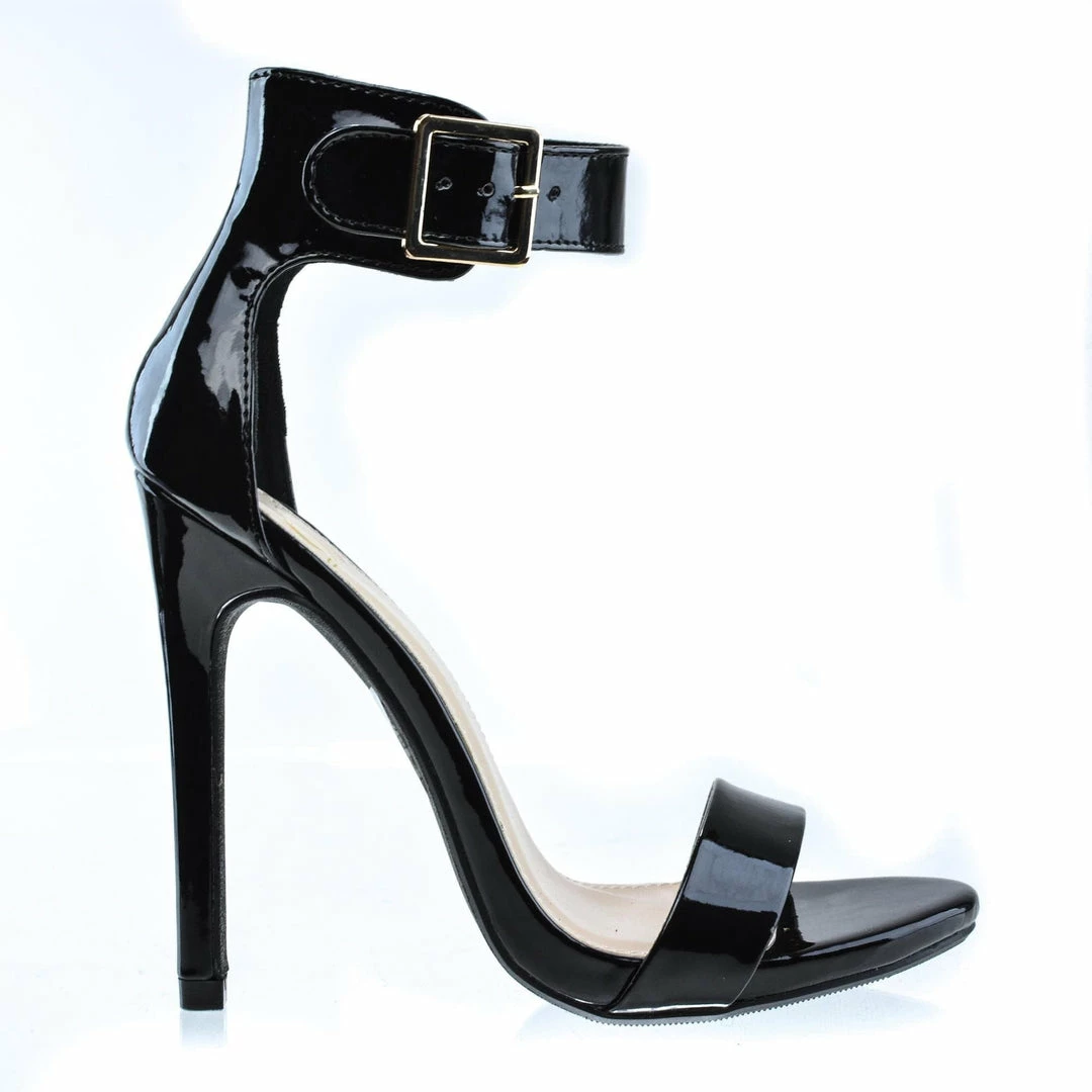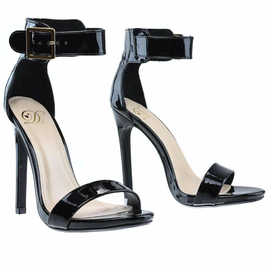 Simple yet elegant high heel dress sandal for prom, dinner or any classy evening events. They feature an open toe, a slight stitch trim, an elegant sculpted look, a gold buckle adjustable ankle strap, a cushioned insole, and am approximate 4.5 inch stiletto heel. These classy stiletto dress sandals come in Black Pat, White Pat, Salmon Pat (Pink), Dk Beige Pat, Black Lami, Gold Pu, Lipstick Lami (Red), Silver Pu, Black Flower, Hot Pink Pat, Multi Flower Pu, Red Pat, Gold Glitter, Silver Glitter, etc. Fit true to size. All man made materials. By Delicious