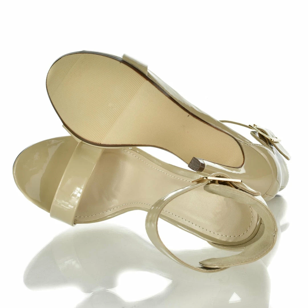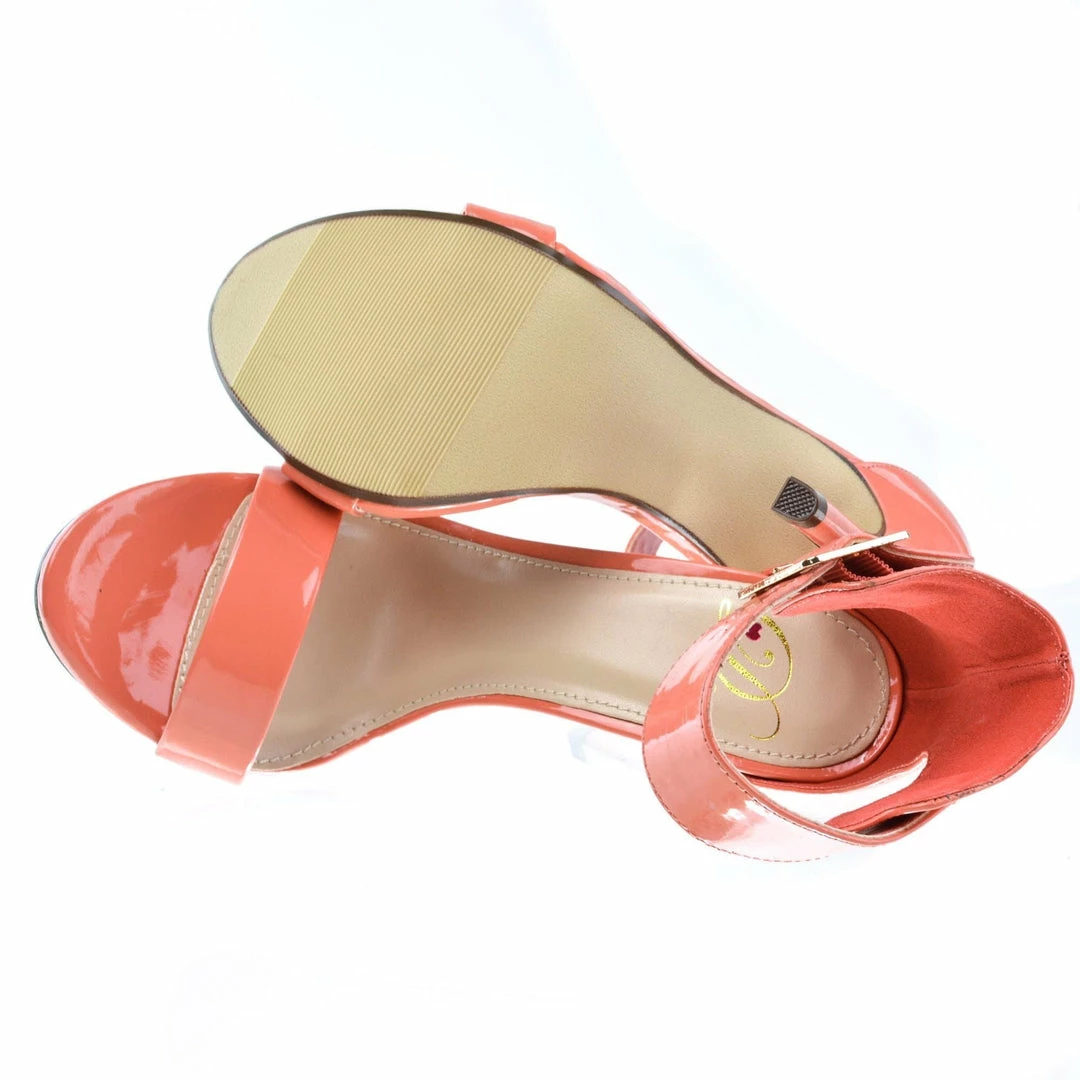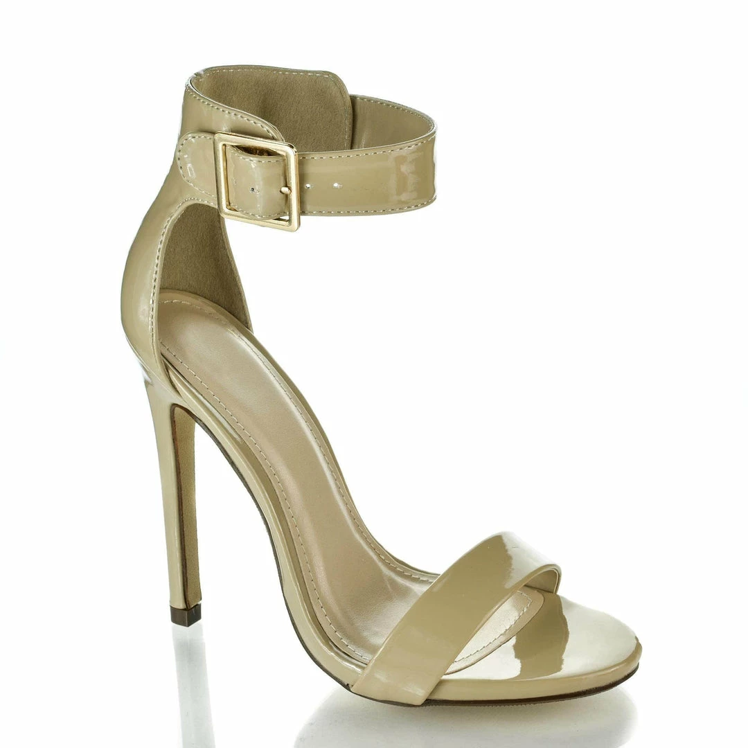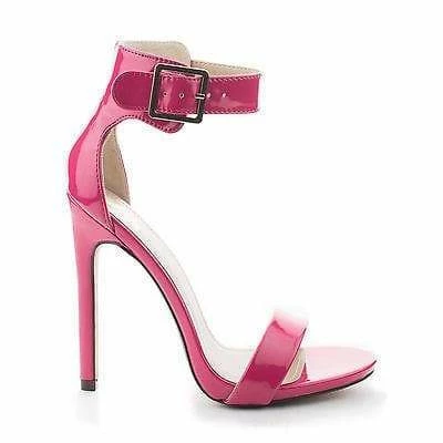 Simple yet elegant high heel dress sandal for prom, dinner or any classy evening events. They feature an open toe, a slight stitch trim, an elegant sculpted look, a gold buckle adjustable ankle strap, a cushioned insole, and am approximate 4.5 inch stiletto heel. These classy stiletto dress sandals come in Black Pat, White Pat, Salmon Pat (Pink), Dk Beige Pat, Black Lami, Gold Pu, Lipstick Lami (Red), Silver Pu, Black Flower, Hot Pink Pat, Multi Flower Pu, Red Pat, Gold Glitter, Silver Glitter, etc. Fit true to size. All man made materials. By Delicious