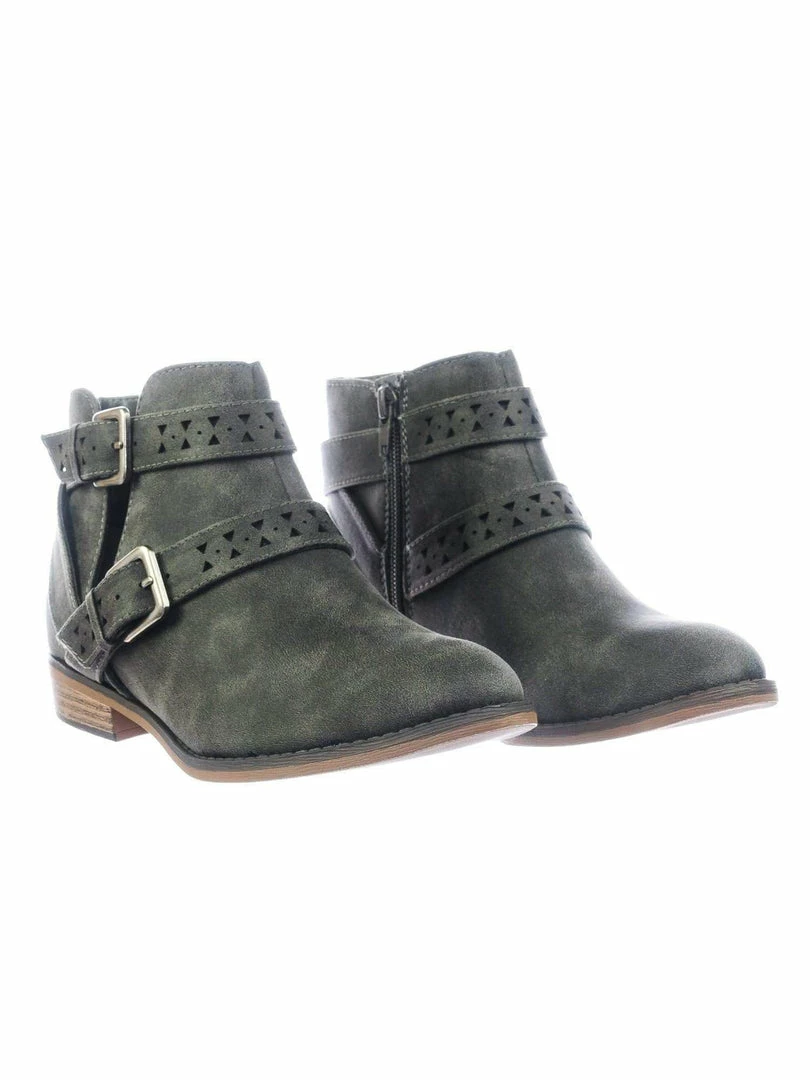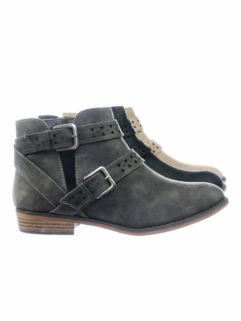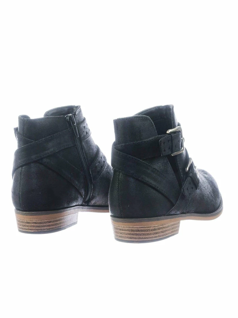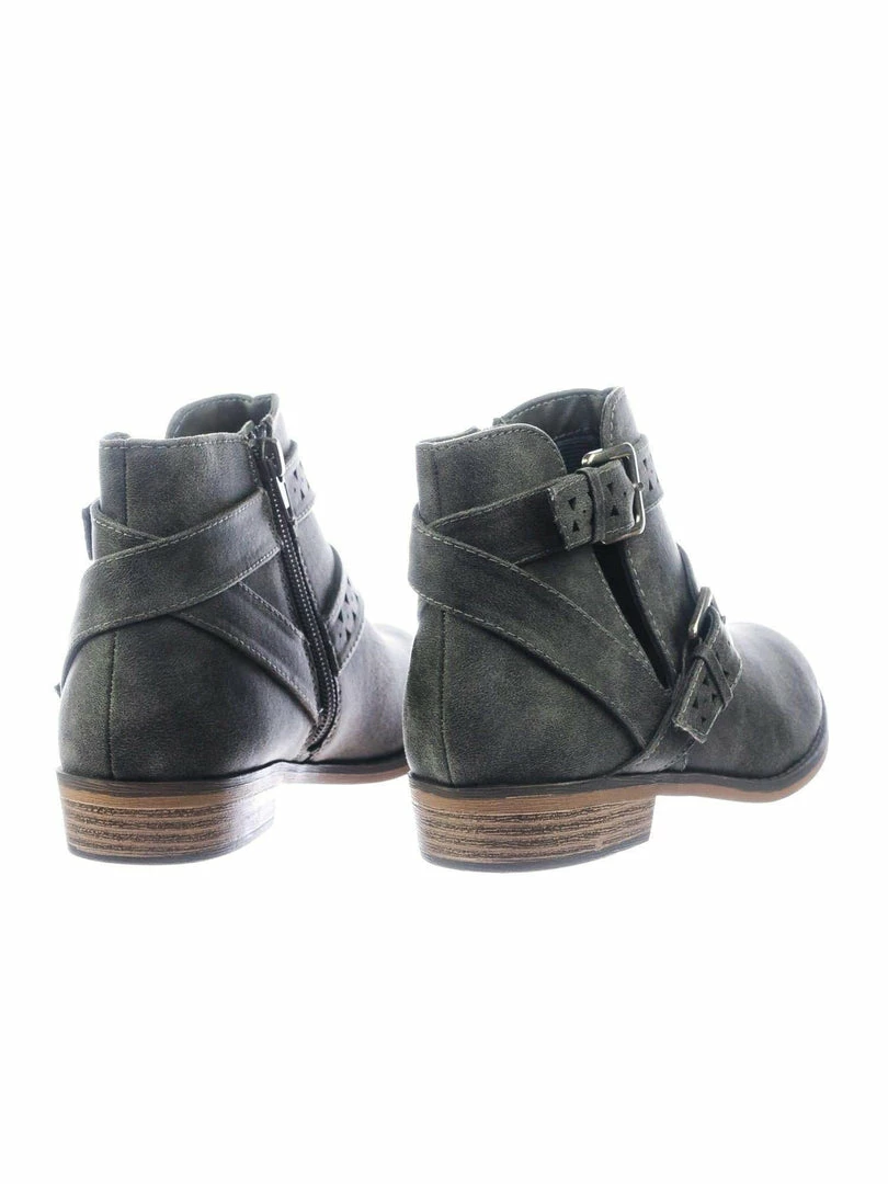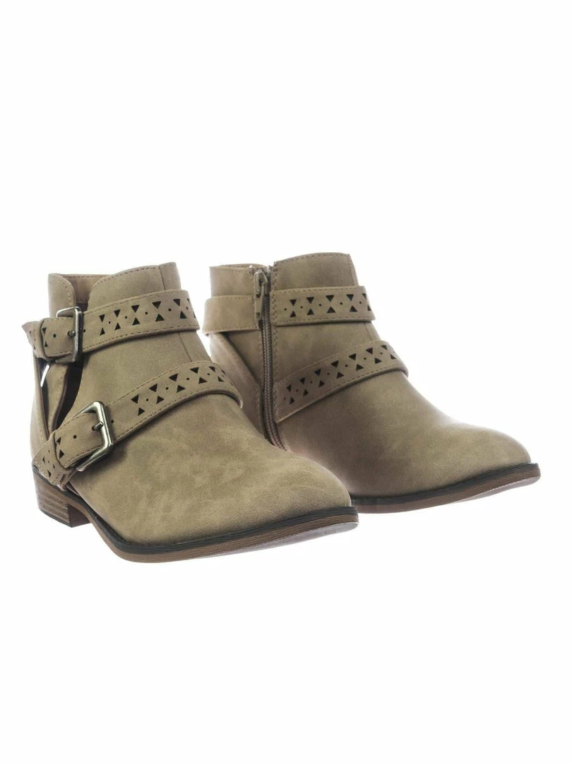 About This Shoes :These boots features a low block heel w faux woodgrain, open side slit, double belted detail, triangle perforated cutout, inner side zipper closure.