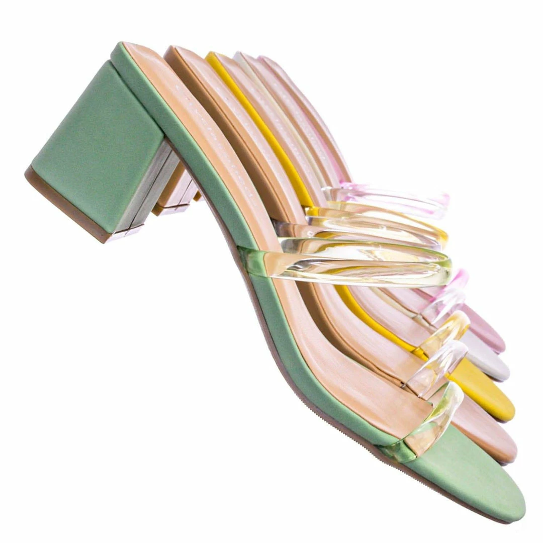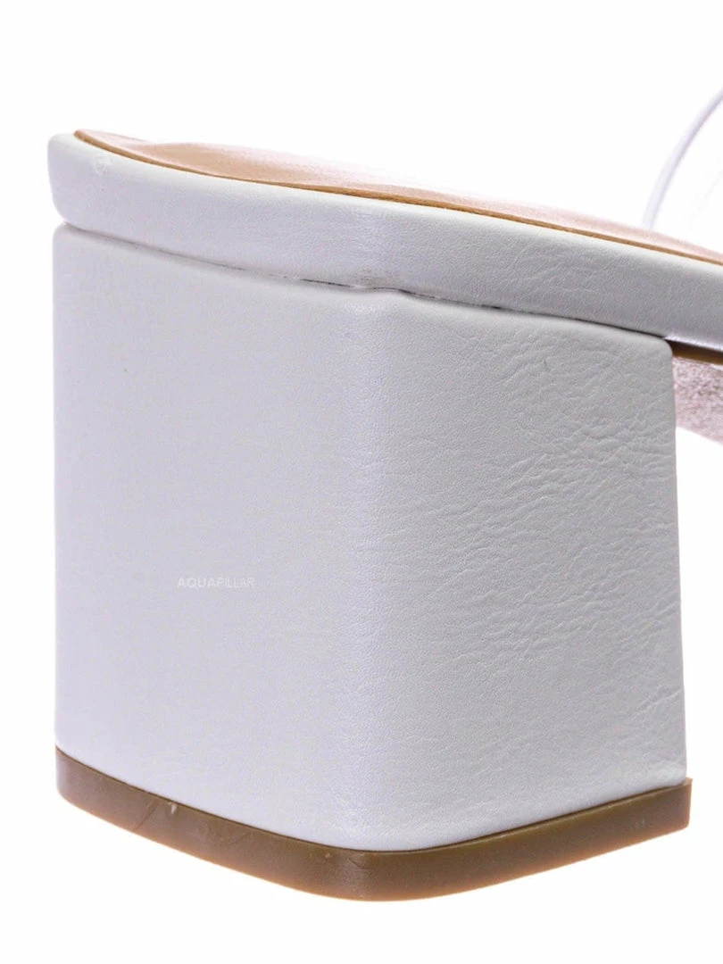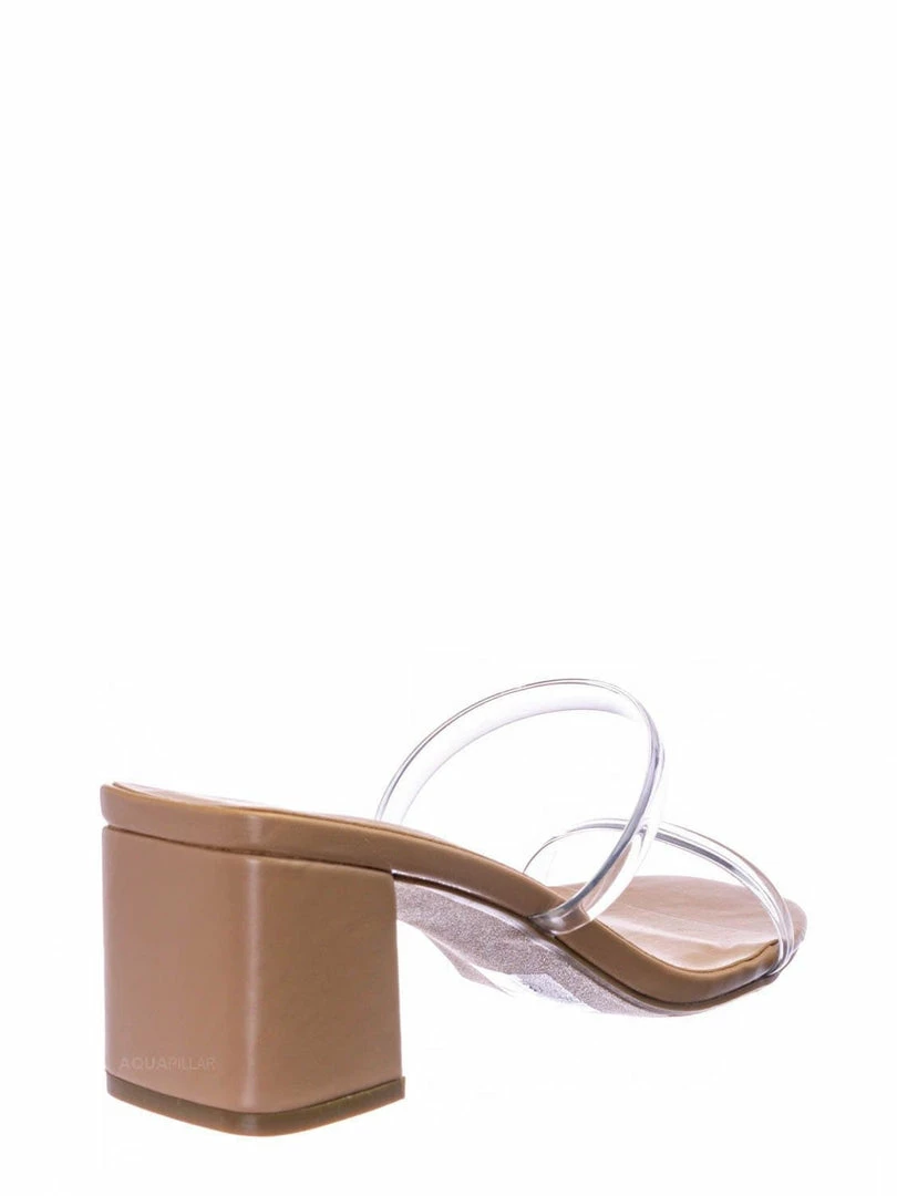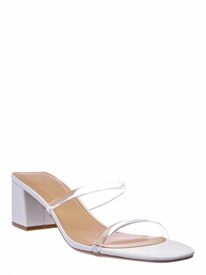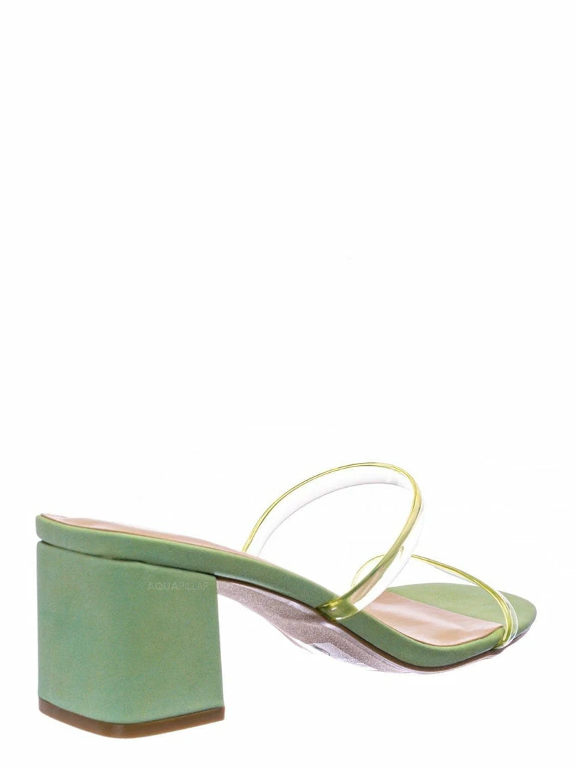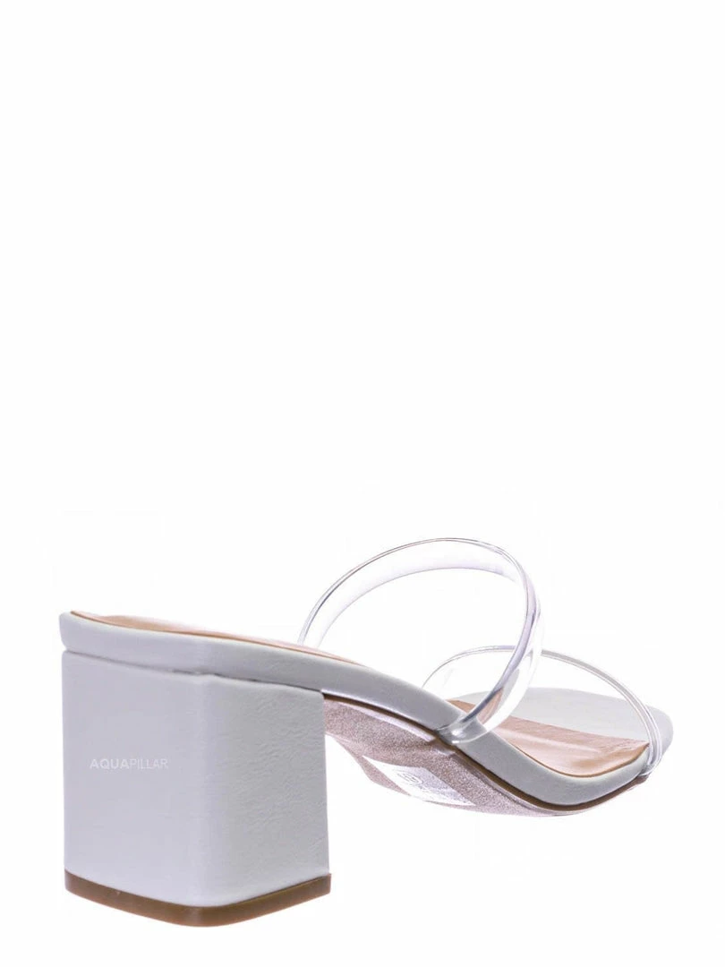 Product Detail : These mules features a low chunky block high heel, thick transparent / clear / vinyl / lucite double strap, slide on construction, opened square toe, lightly padded insoles and rubber outsoles.