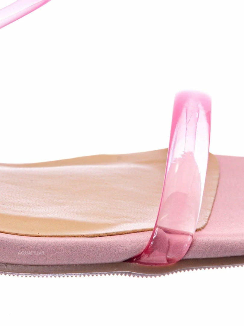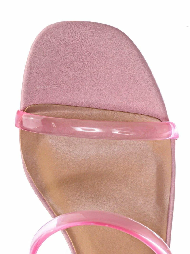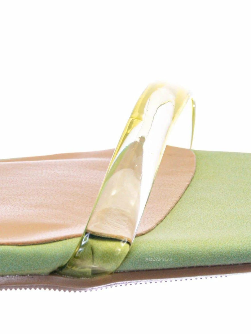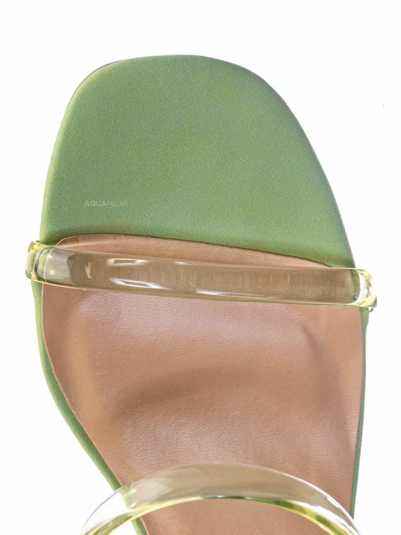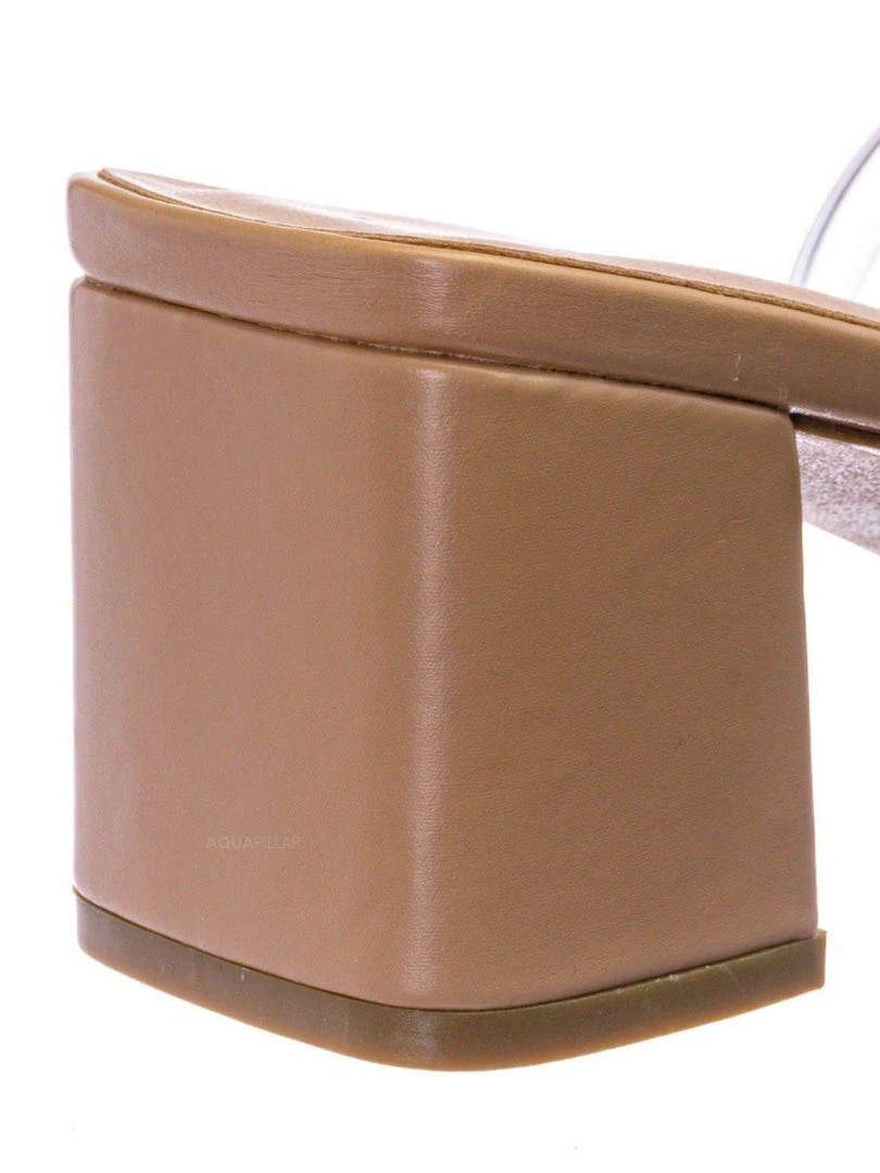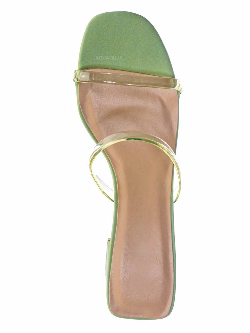 Product Detail : These mules features a low chunky block high heel, thick transparent / clear / vinyl / lucite double strap, slide on construction, opened square toe, lightly padded insoles and rubber outsoles.
