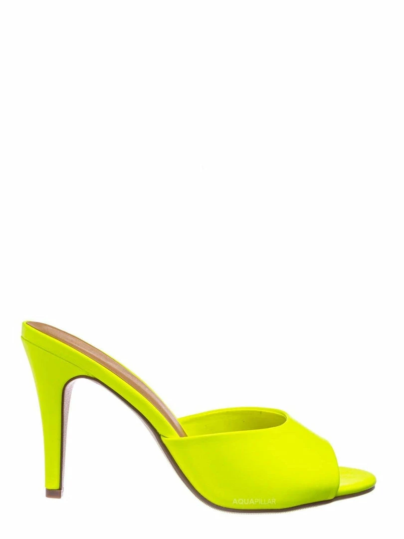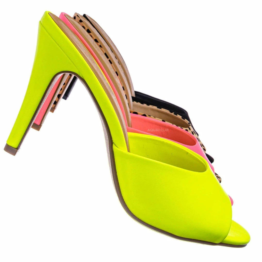 Product Detail : These mule sandals features a stiletto high heel, open peep toe, slide on glide construction, soft padded insoles and rubber outsoles. Note: Choose from solid to neon. Neons doesn’t appear as vibrant on monitor.