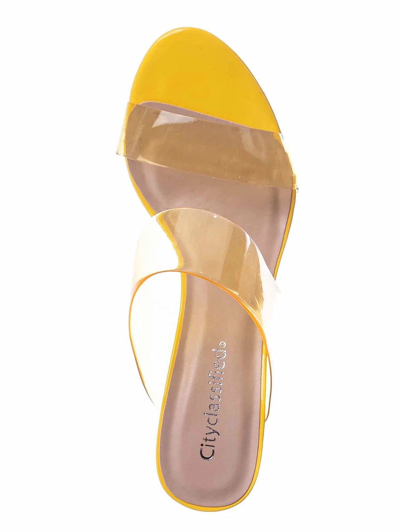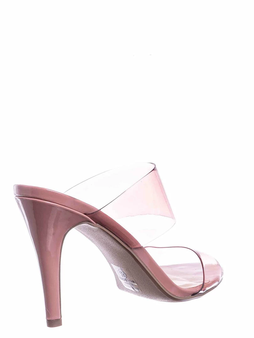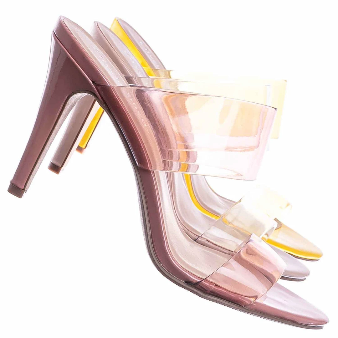 Product Detail : These mules features a Cinderella inspired glass slipper silhouette and a thin high heel. The clear strap is made of soft vinyl with a tint of color.