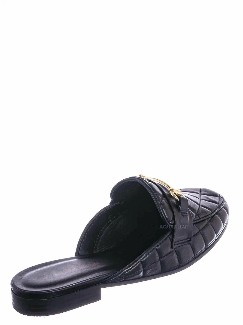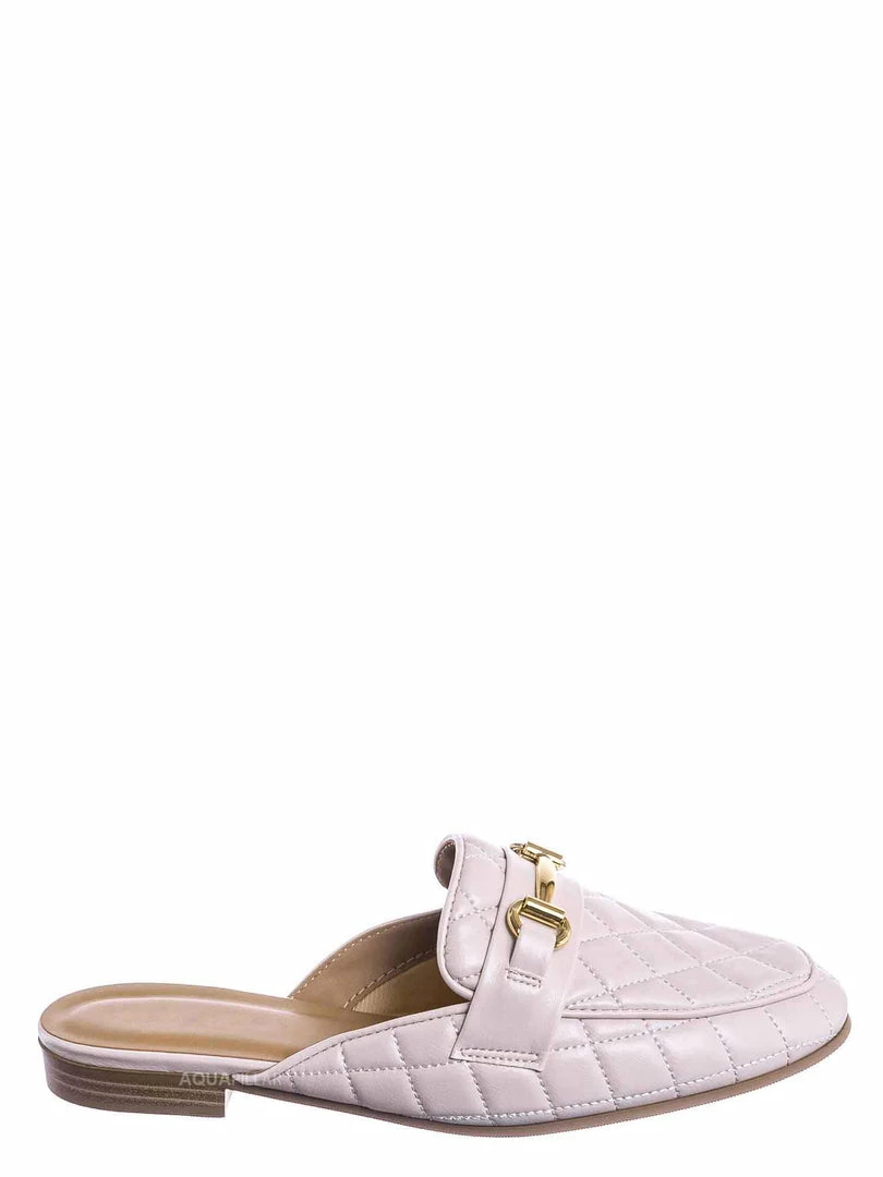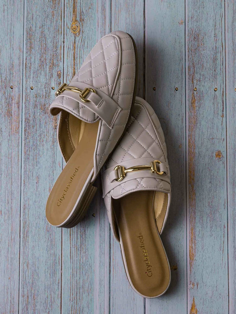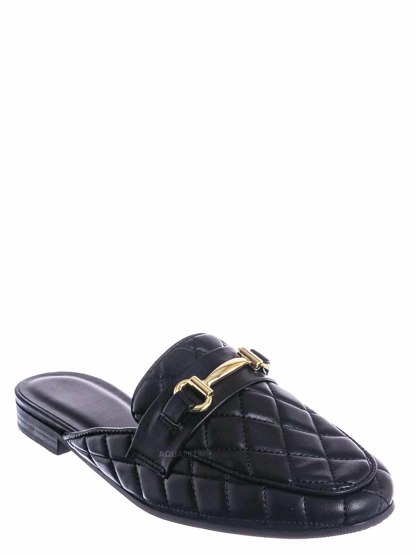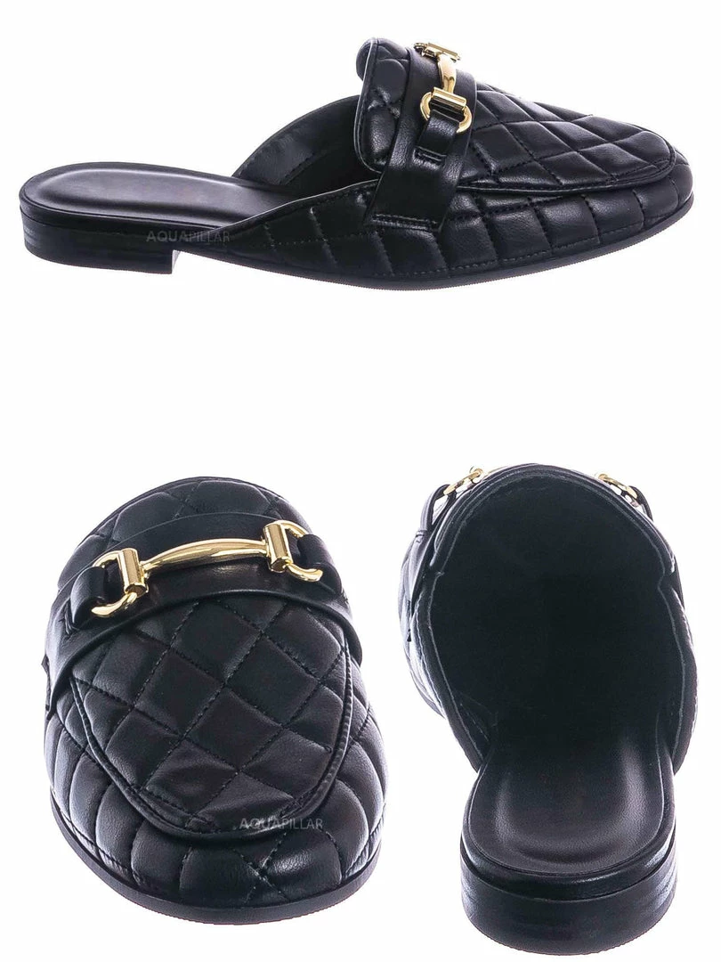 Product Detail : These flats features puffy quilted upper and metal horse bit detail. The shoes can be easily slide into and ends with a comfy rounded closed toe and a small 1 inch heel.