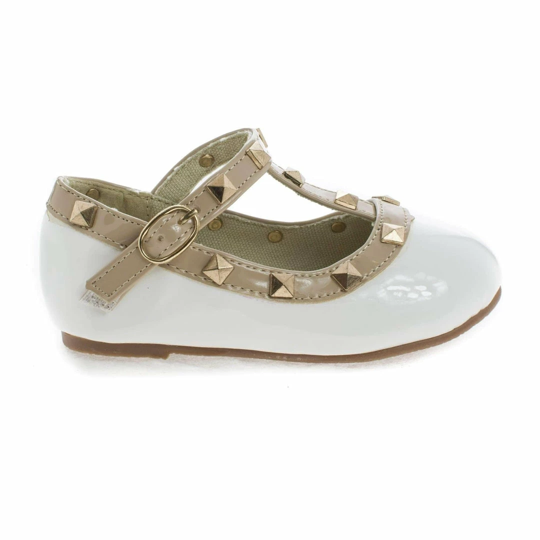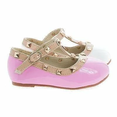 Dress up your baby girl’s outfit with these studded slip on ballerina flats, featuring a round toe, contrast stitching, a decorative buckle, a hook and look fastening, a slightly padded insole for comfort and an approximate 0.25 inch heel. (Please note that these are infants shoes.) Available in White, Pink, etc. All man made materials. By Delicious Shoes.