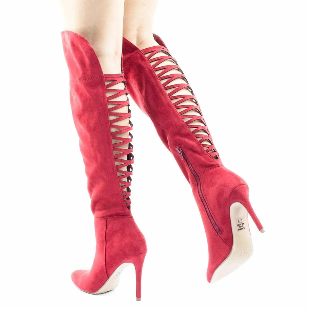 About This Shoes :These knee high boots features a open back with criss crossing cutout cage design, side zipper closure and high heel. Brand – Delicious