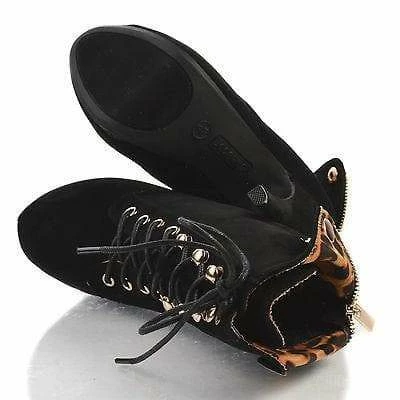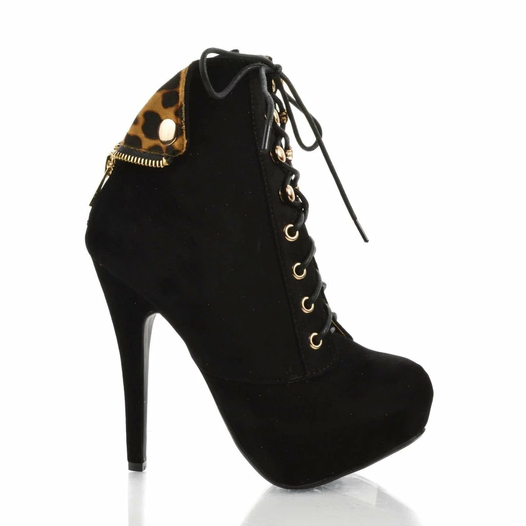 Dress up your wardrobe with these ankle booties, featuring an almond toe, contrast stitching, adjustable laces, a back center zipper, fordable ankle cuff with snap buttons, a cushioned insole, an approximate 1.5 inch platform for extra comfort, and an approximate 5.5 inch high stiletto heel. Style fits true to size. Available in Black Crp (All black), Black Iks (imitation suede and leopard print lining), etc. All man made materials. By Bamboo Shoes.