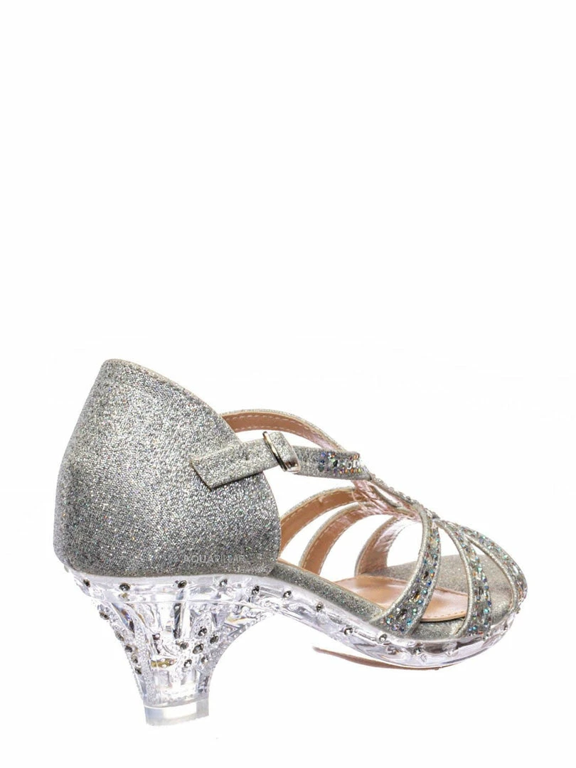 Product Detail : These pumps for little girl features an blanked rhinestone jewel embellishments, mesh glitter fabric, plexi-glass / acrylic motif outsoles, clear transparent/lucid mid height heel, double sided elastic support, open rounded toe, multi cage strap design, adjustable pin needle buckle, lightly padded insoles and man made outsoles.