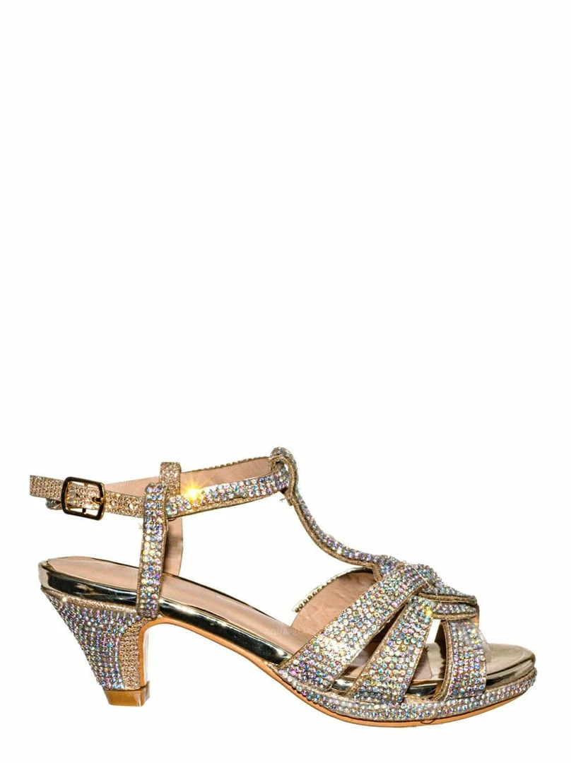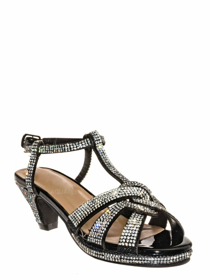 Product Detail : These dress sandals for little kids features a rhinestone crystal embellished strap, platofrm and heel. Woven strap, t-strap ankle strap, tapered medium heel, low platform, cage strap and lightly padded insole.