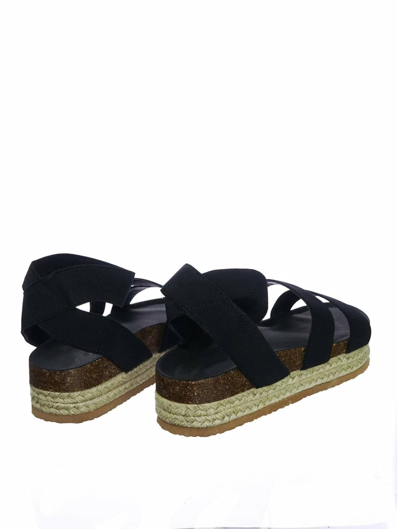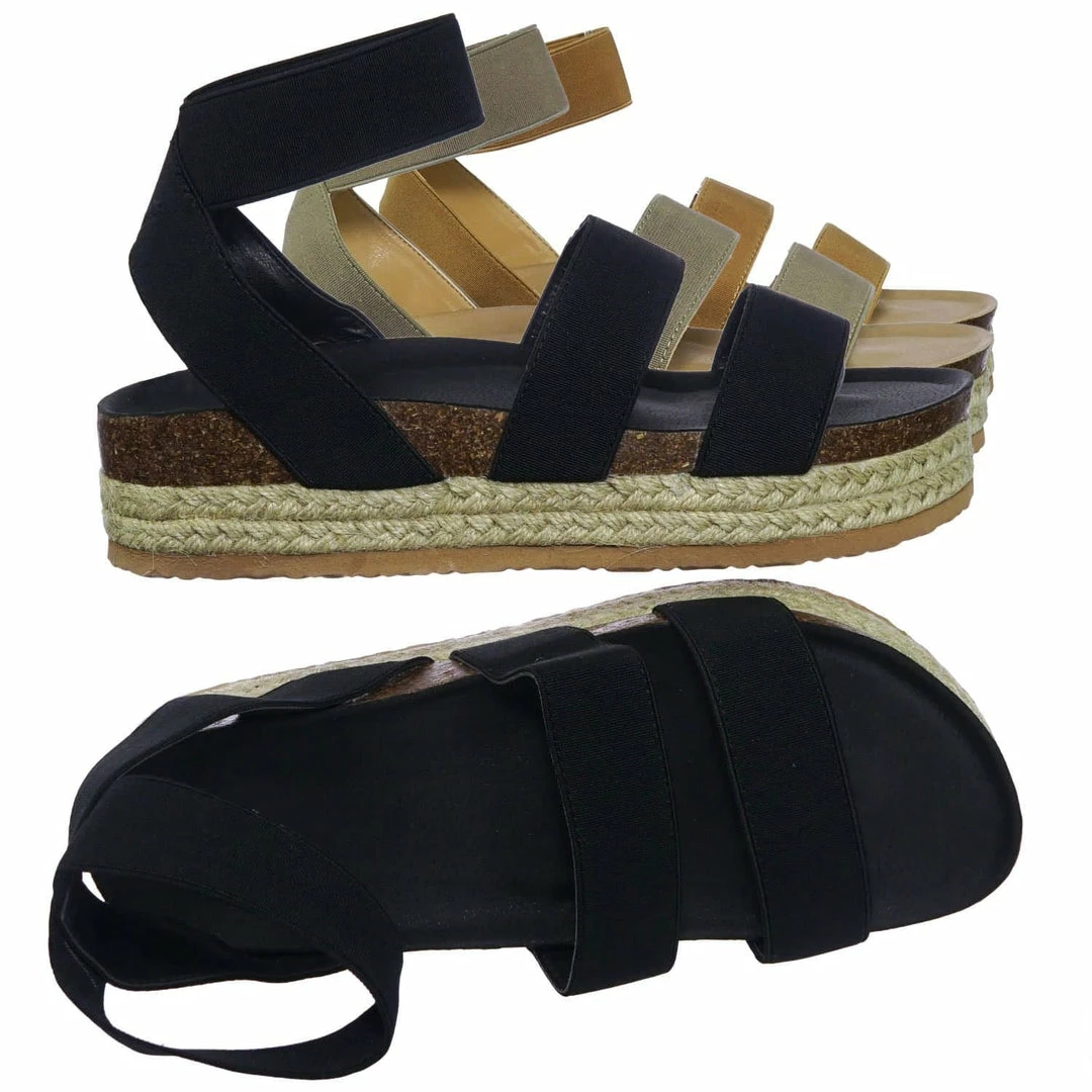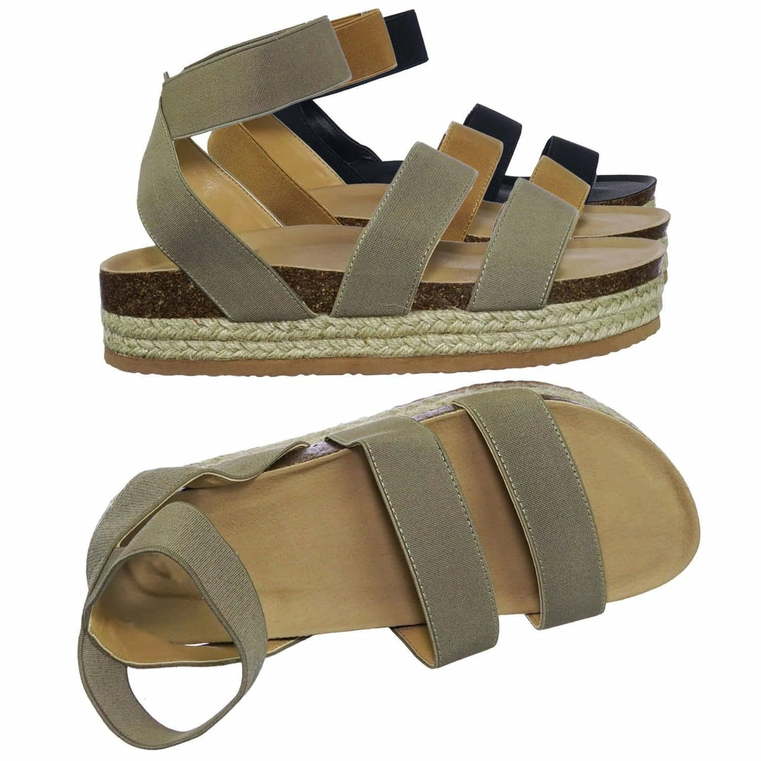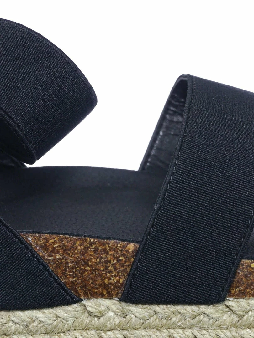 These rugged Flatform sandal features a layered espadrille / rubber / cork platform, molded footbed, elastic straps, stretchy ankle wrap and a retro modern construction.