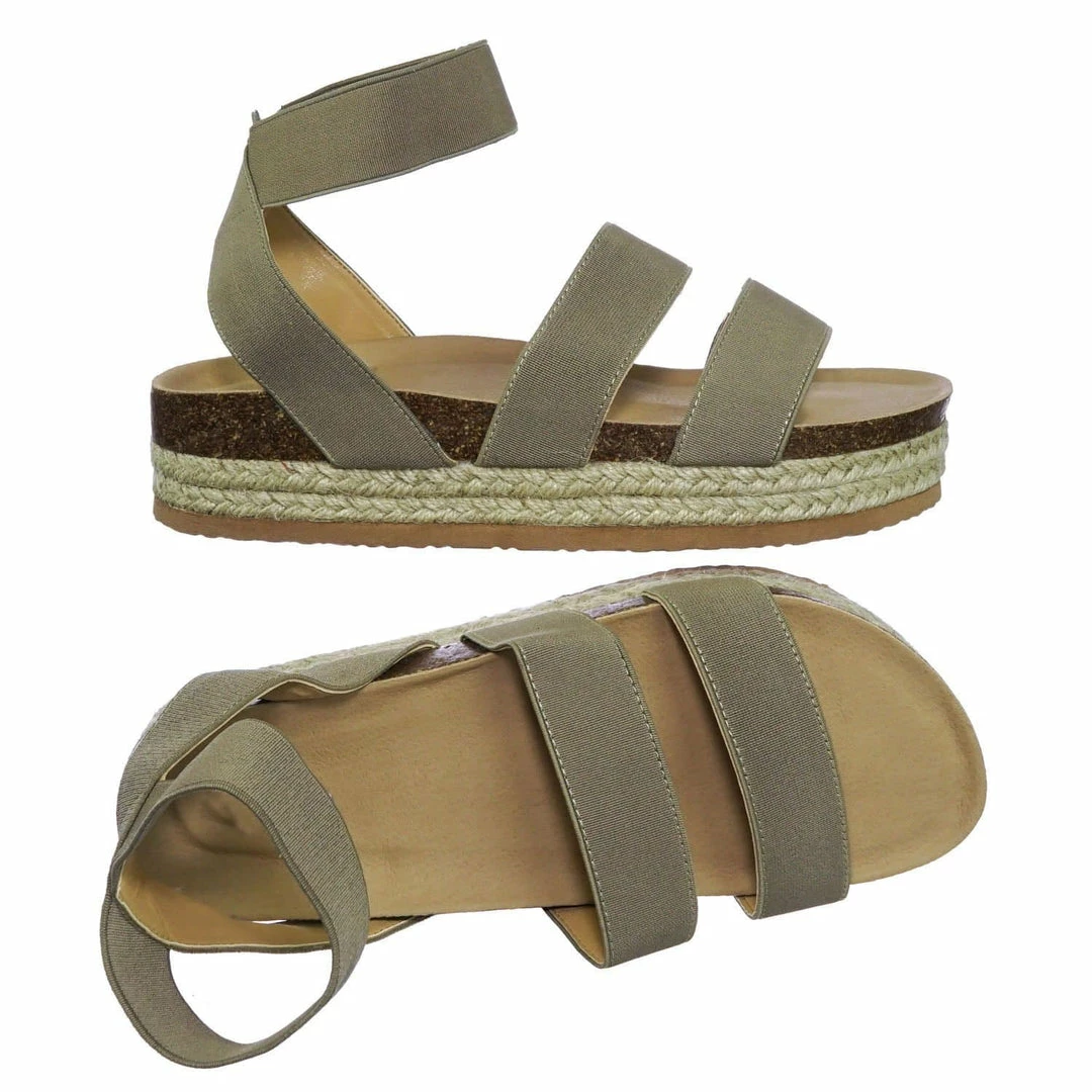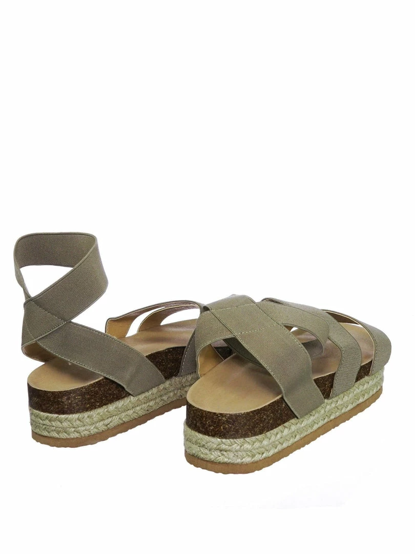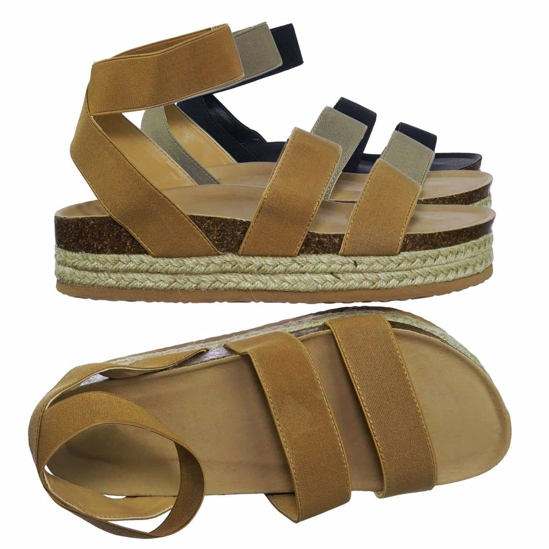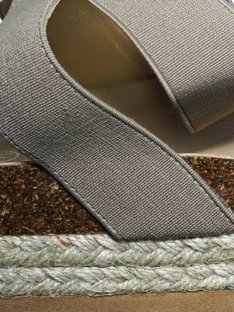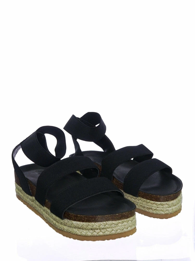 These rugged Flatform sandal features a layered espadrille / rubber / cork platform, molded footbed, elastic straps, stretchy ankle wrap and a retro modern construction.