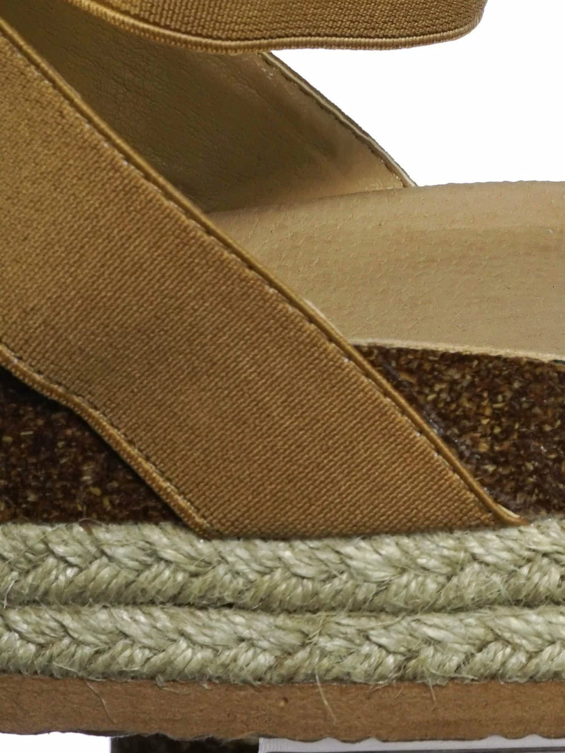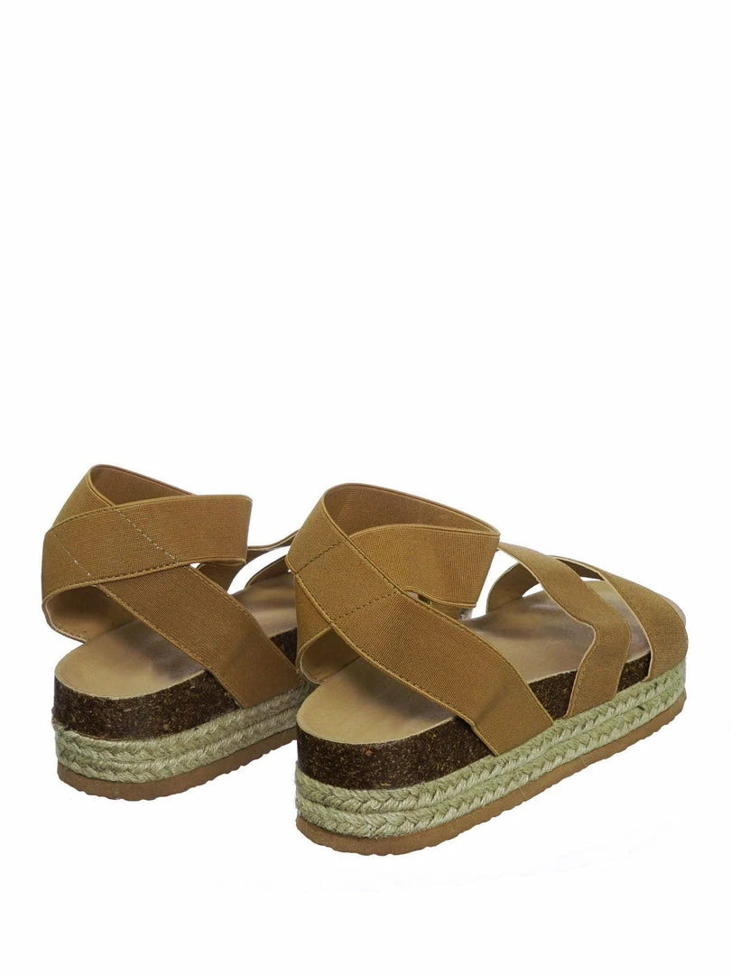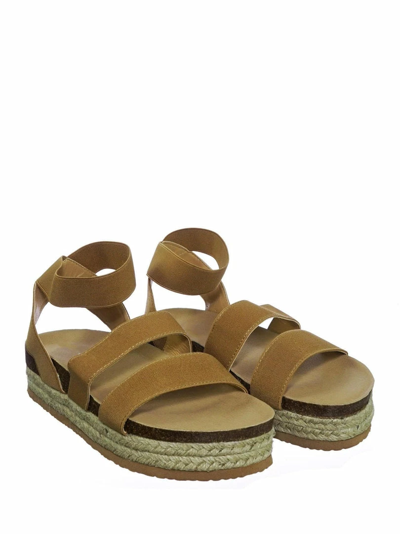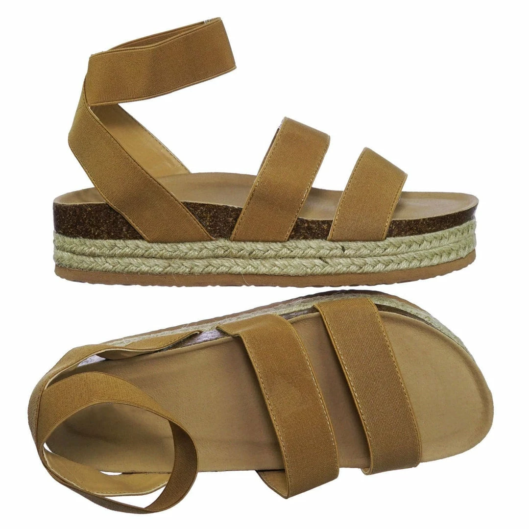 These rugged Flatform sandal features a layered espadrille / rubber / cork platform, molded footbed, elastic straps, stretchy ankle wrap and a retro modern construction.