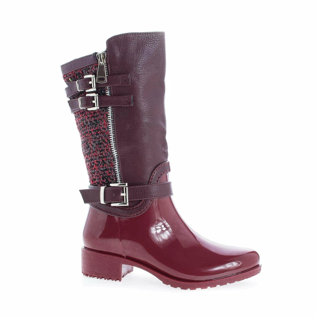 Dress up your toddler with these rainboots, featuring a round toe, contrast stitching, decorative zipper and buckle straps, a tweed fabric by the back shaft area, an additional functioning zipper for easy wear and closure, a slightly padded insole for comfort, a lug sole look, an approximate 10 inch high shaft, an approximate 0.25 inch platform, and an approximate 1.25 inch block heel. (Please note that these measurements are based on a children’s size 13). Available in Wine, Black, Brown, Navy, etc. All man made materials. By Link Shoes.