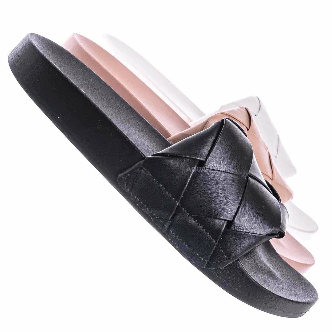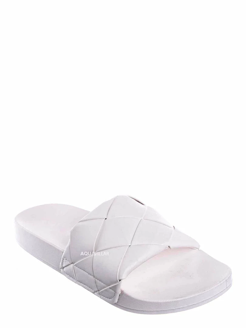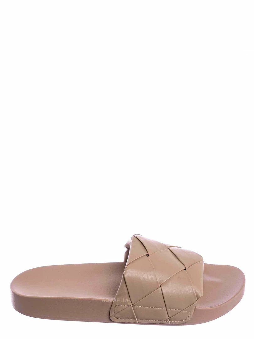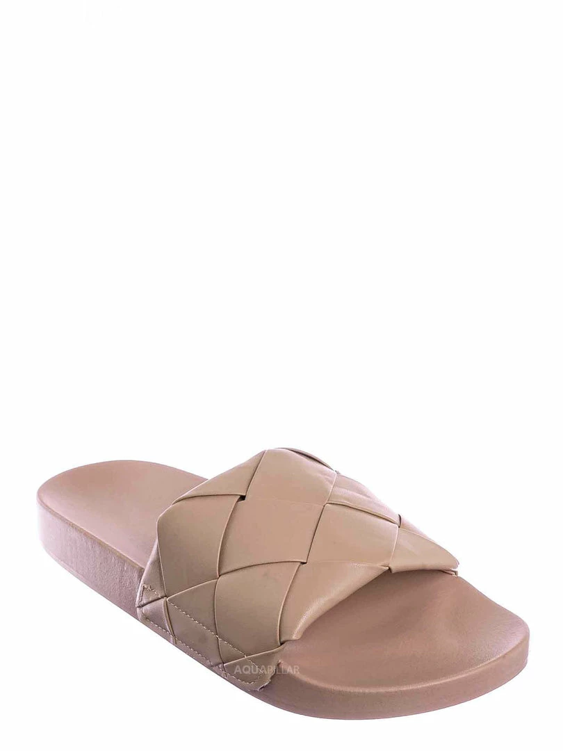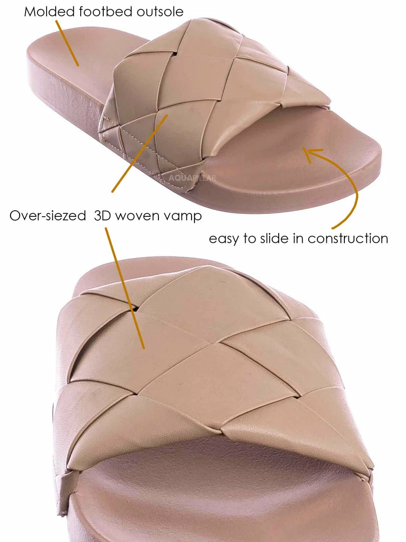 Product Detail : These footbed sandal features a easty to slide in slipper design and a comfy contoured footbed insole. The single band upper is in oversized woven design.