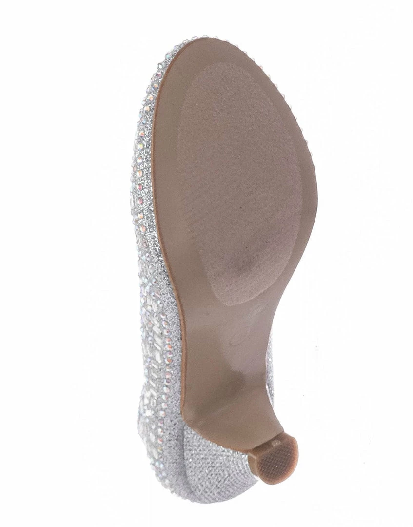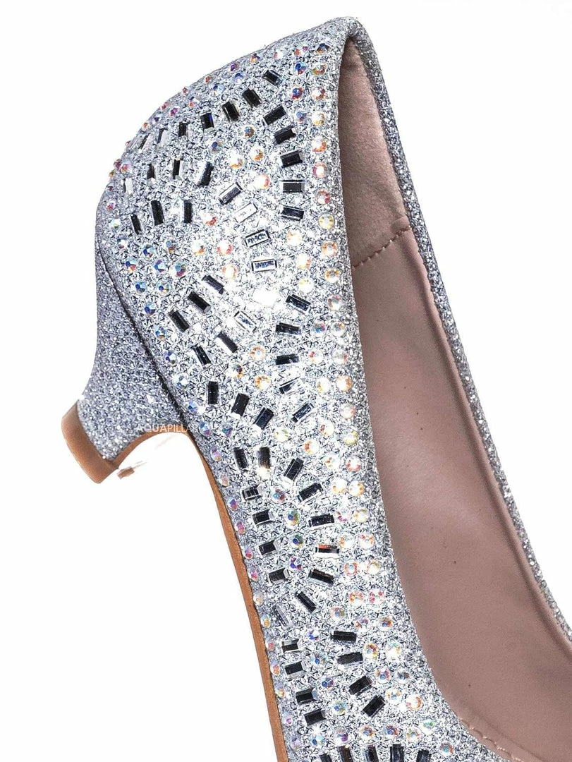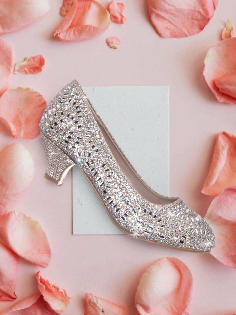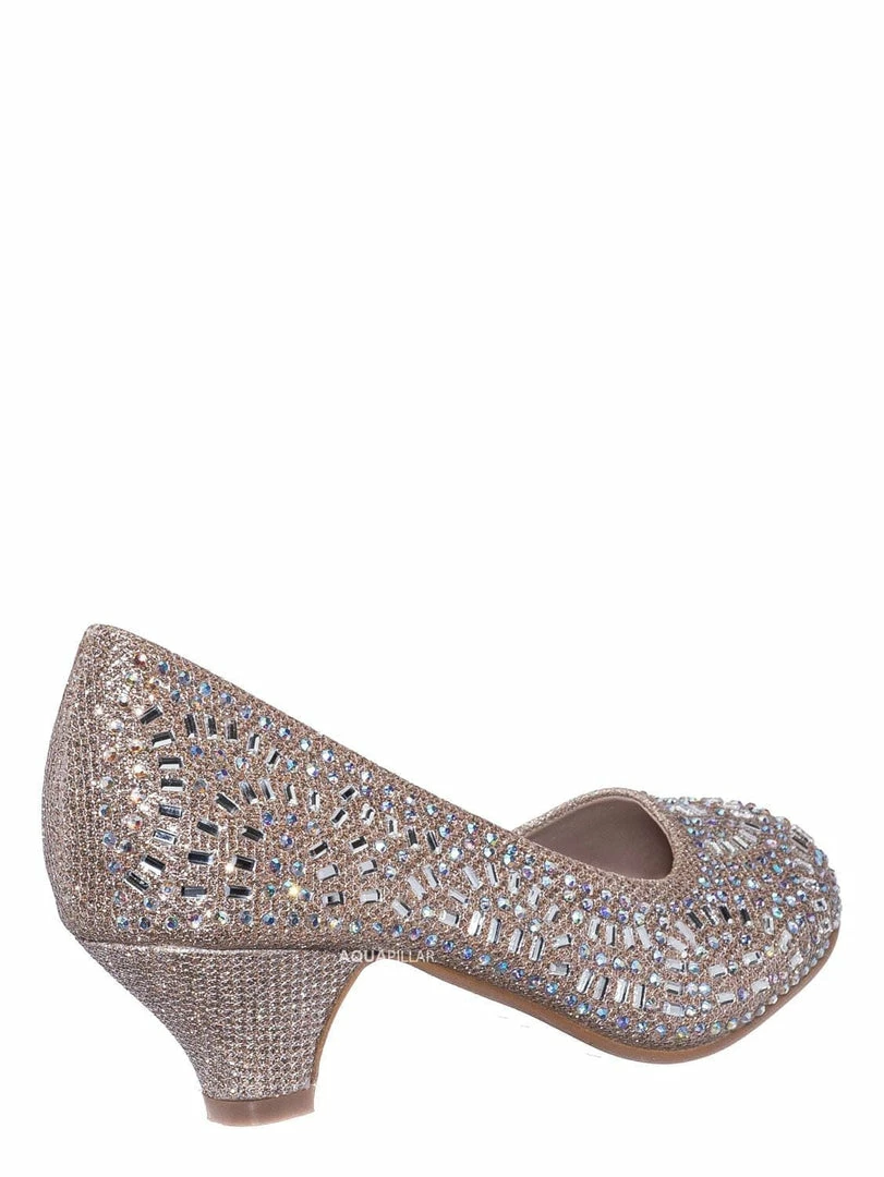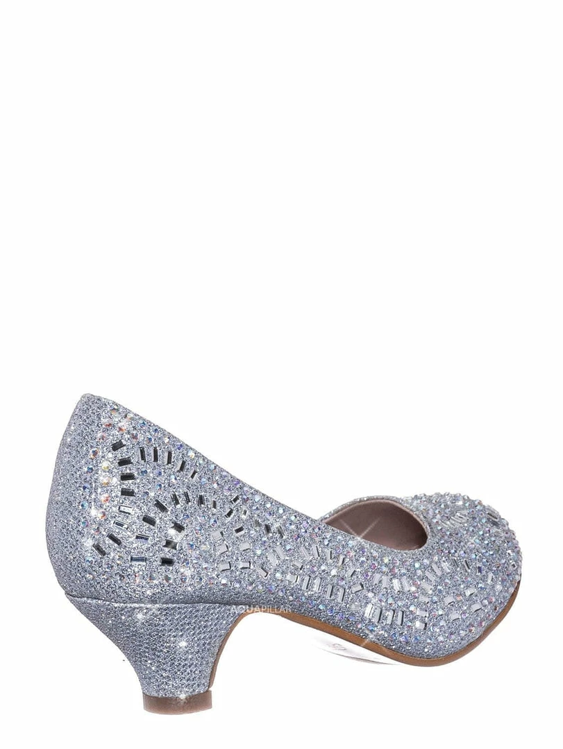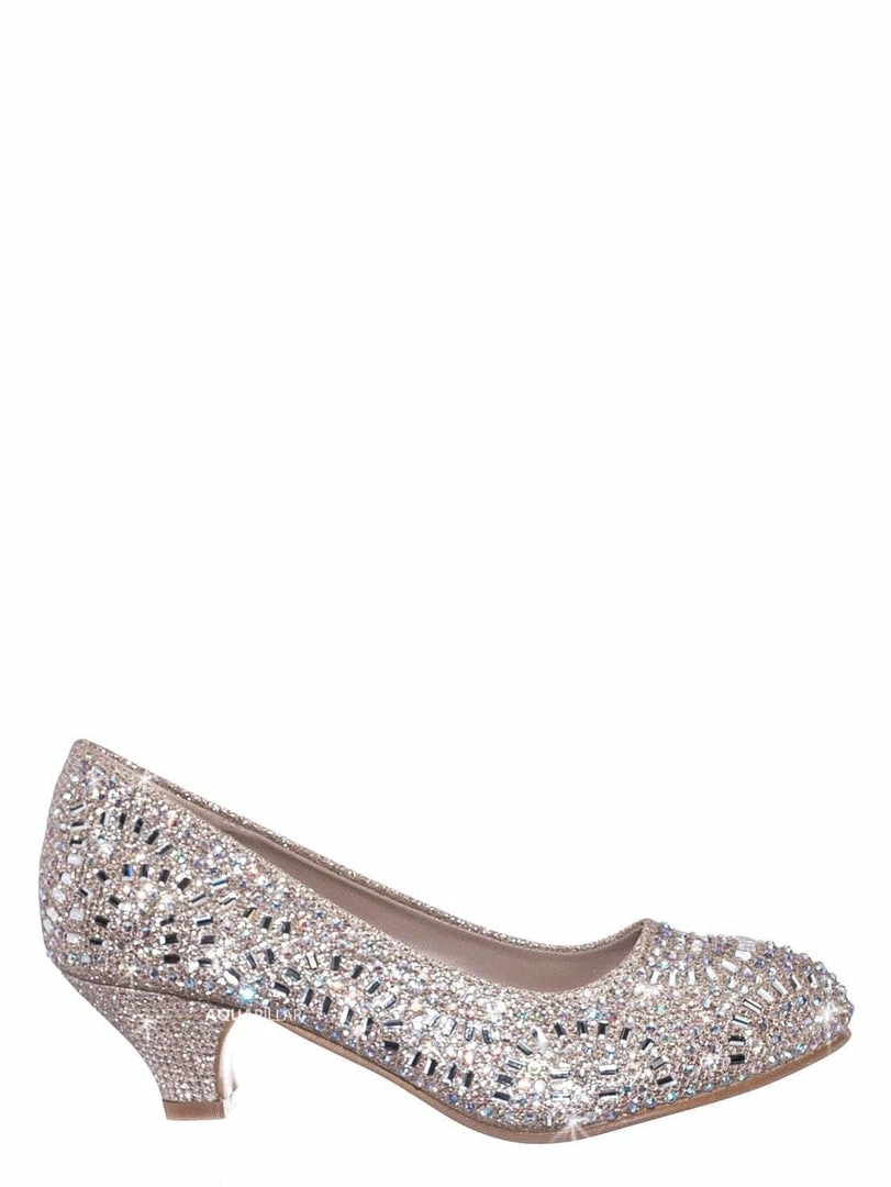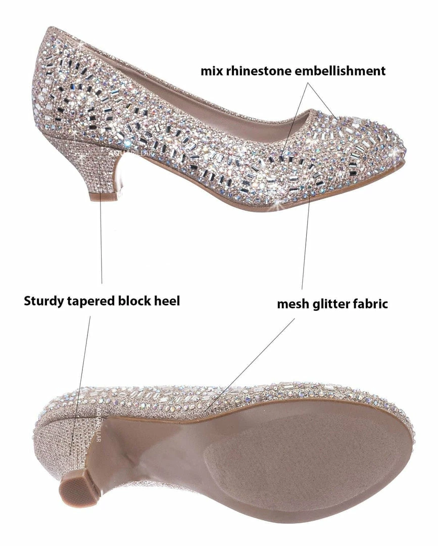 Product Detail : Doll up your little girl in these dress pump featuring modest low block heel, rounded toe, mesh glitter upper with assorted size and shape rhinestone crystal embellishments. Choose from slip on, adjustable Mary-Jane strap and hook & loop snap on Mary-Jane strap.