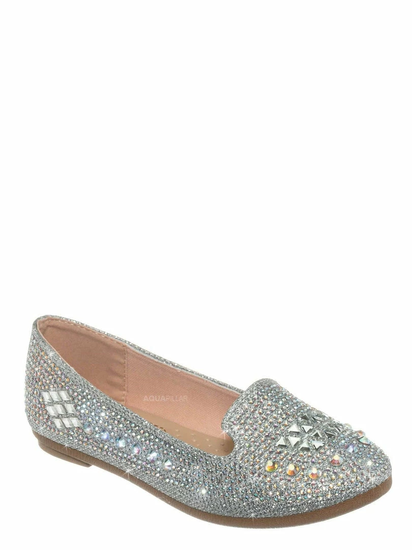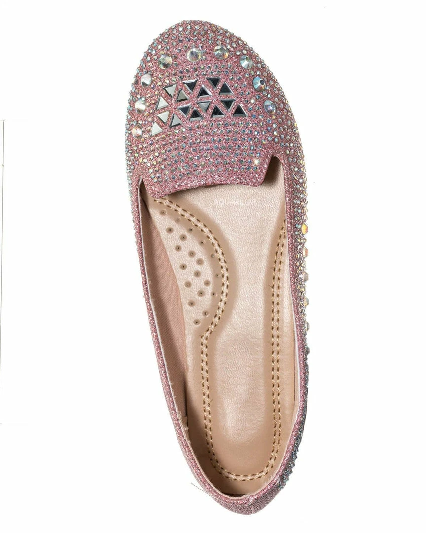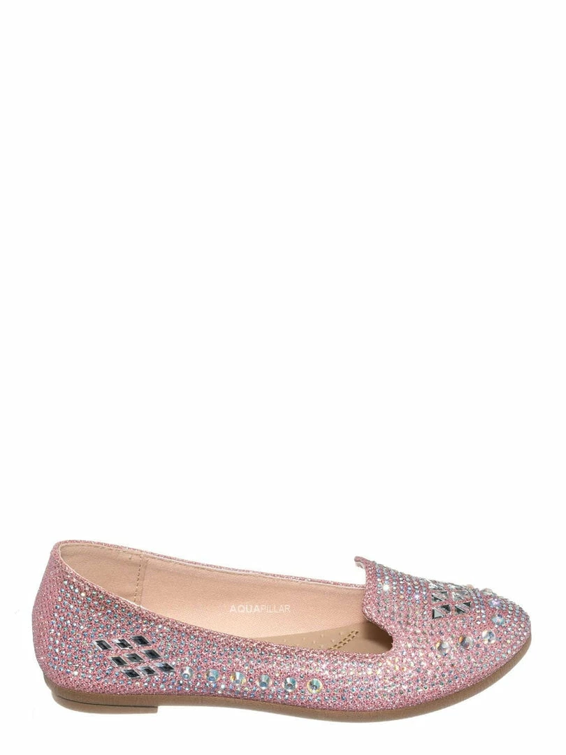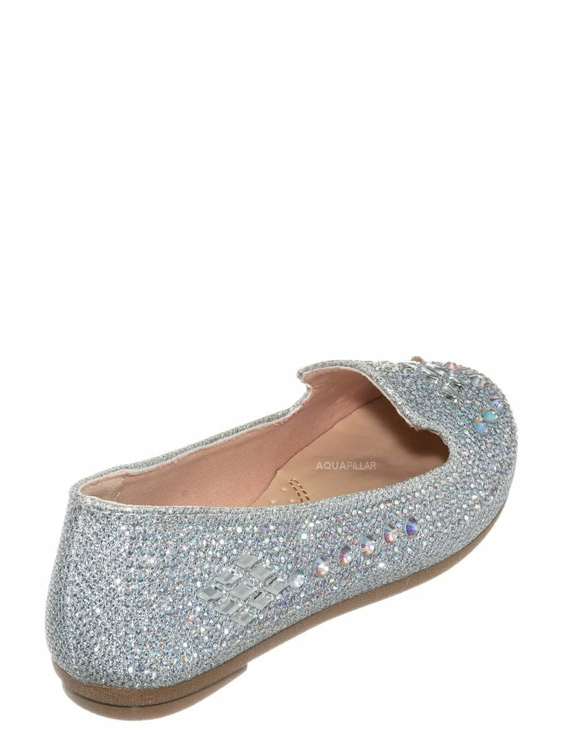 Product Detail : These flats for little girl features a moccasin like slip-on silhouette, a mesh glitter outer fabric, assorted rhinestone crystal embellished in the front side, slide in loafer construction, lace-less closure, rounded closed toe and lightly padded insole.