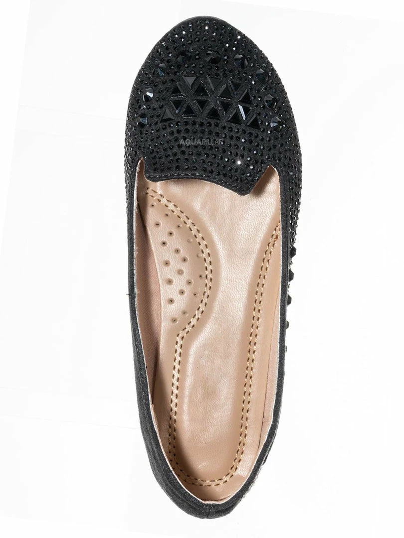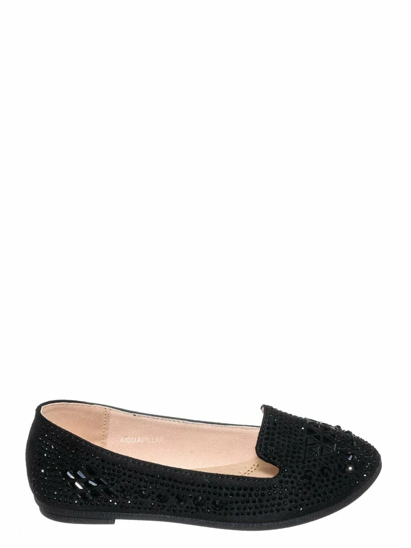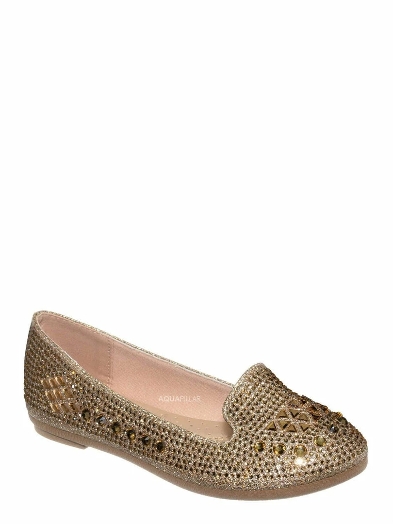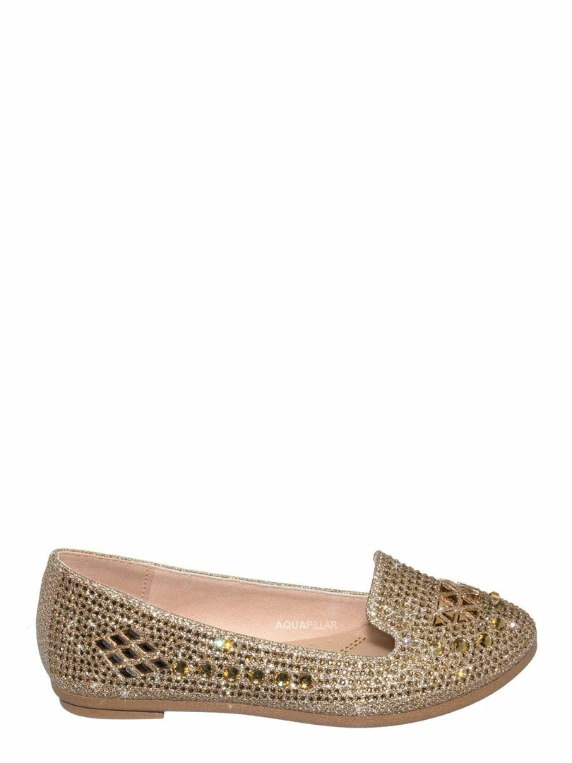 Product Detail : These flats for little girl features a moccasin like slip-on silhouette, a mesh glitter outer fabric, assorted rhinestone crystal embellished in the front side, slide in loafer construction, lace-less closure, rounded closed toe and lightly padded insole.