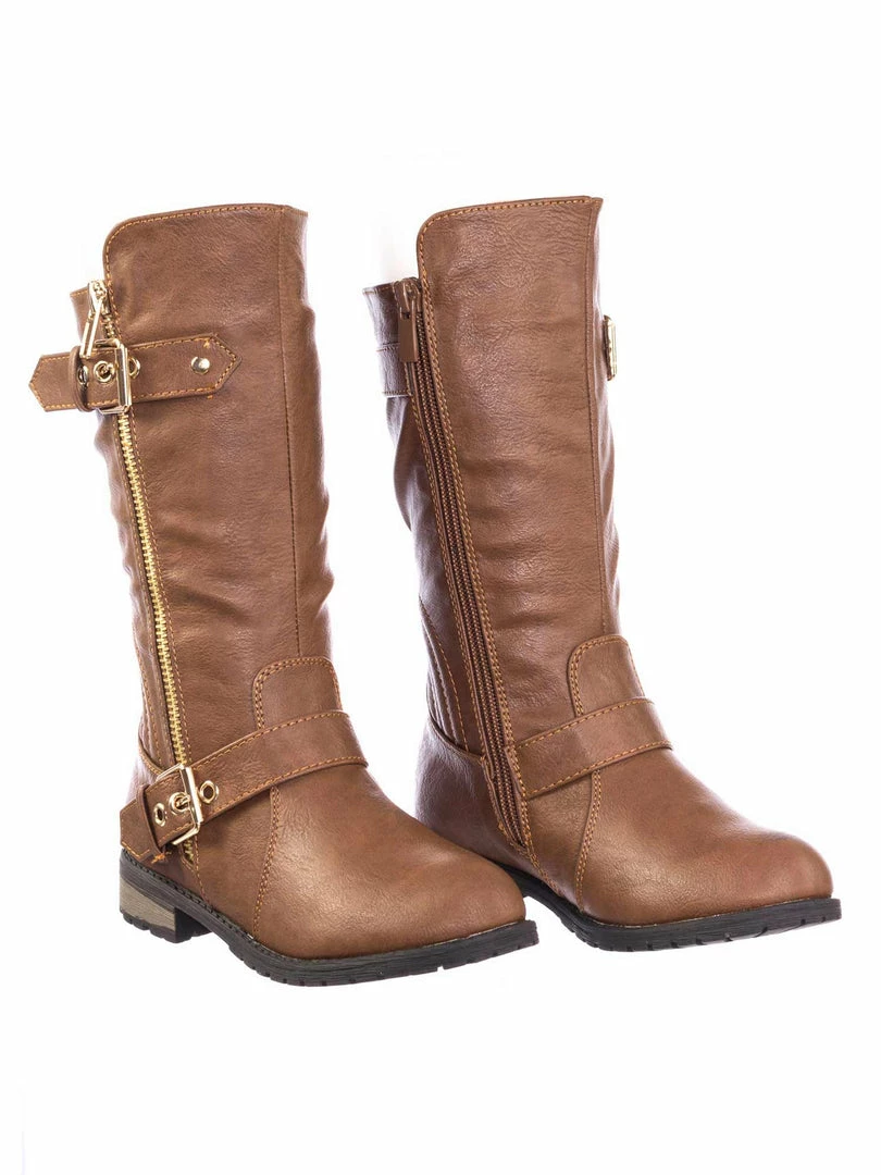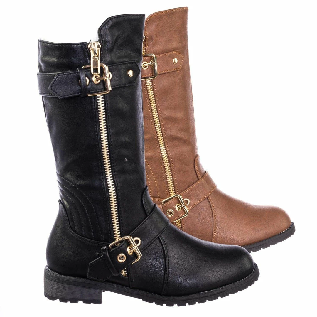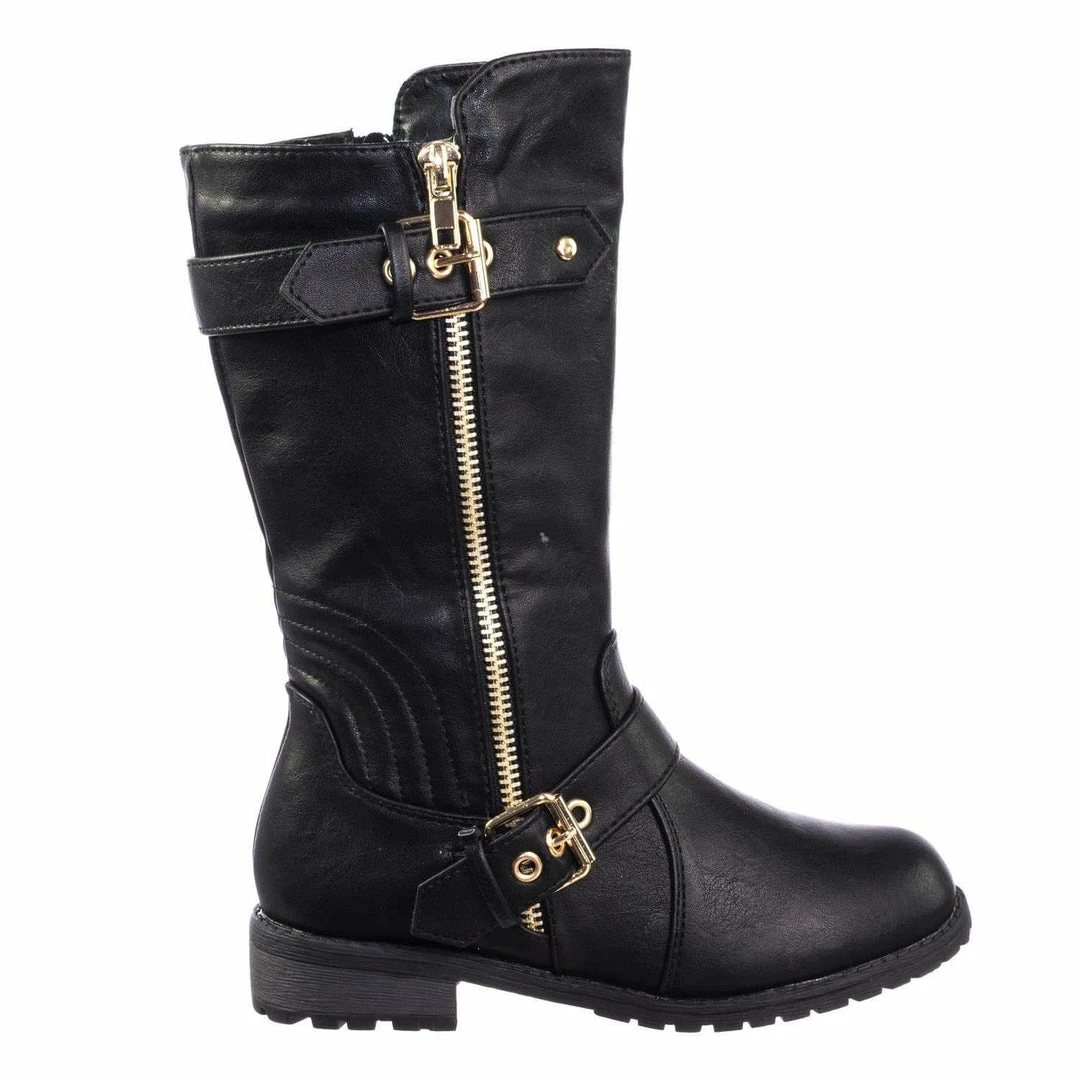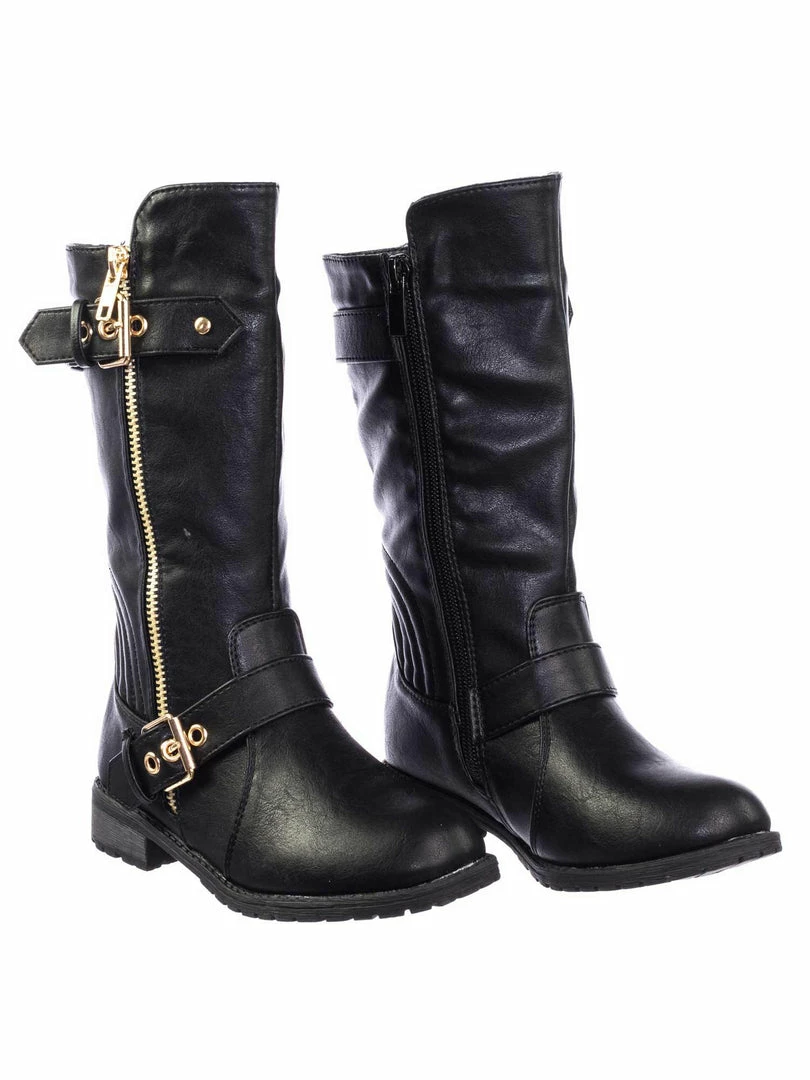 These boots for childrens features a biker inspired riding boots with low block heel, threaded lug sole, hardware buckle detail, a gold non functintonal decorative zipper and an inner zipper closure.