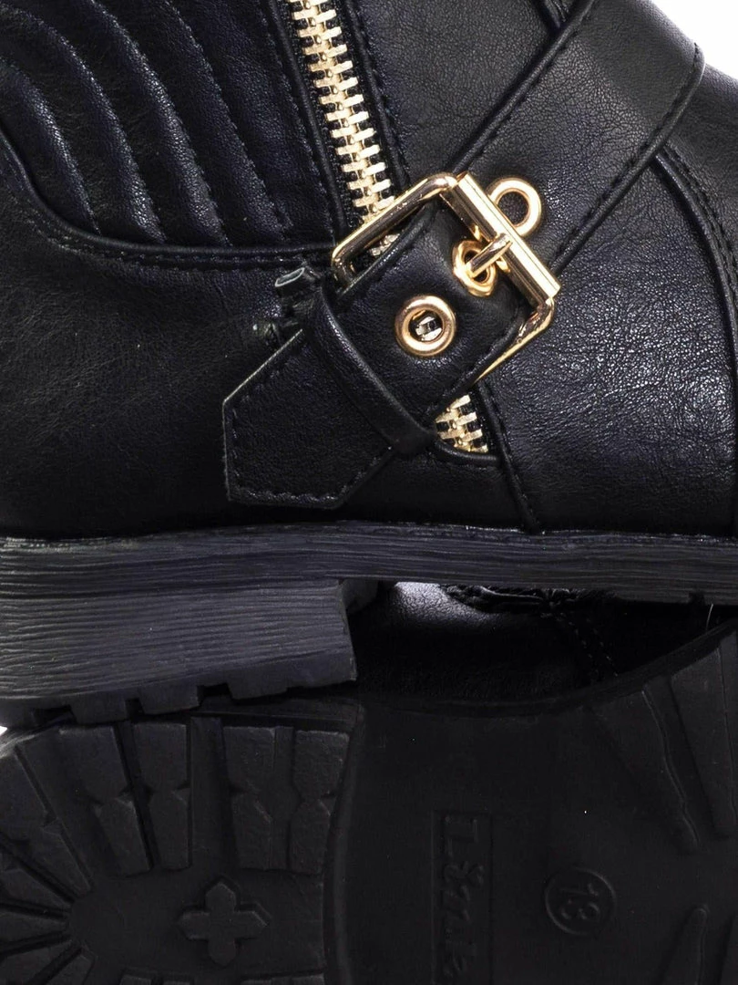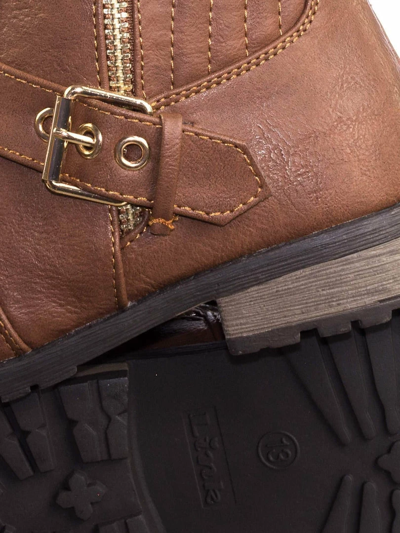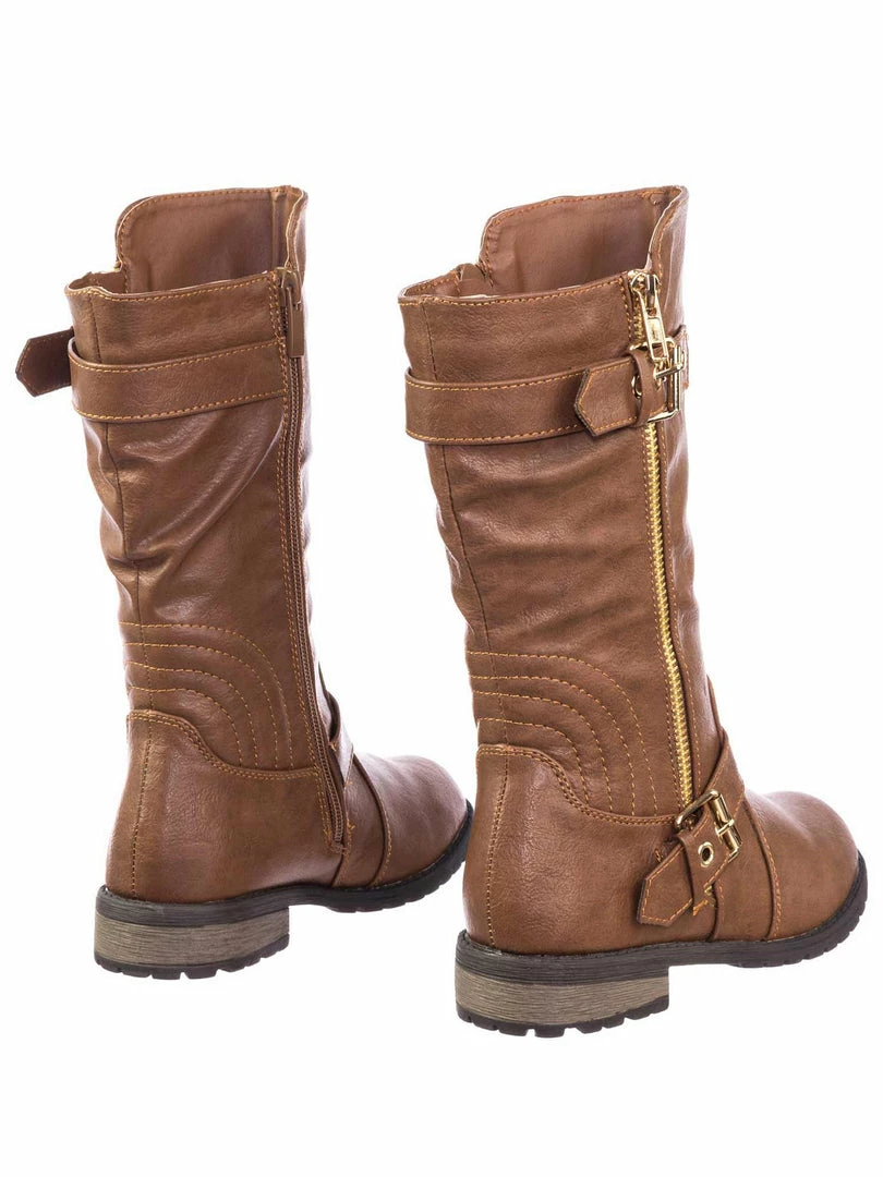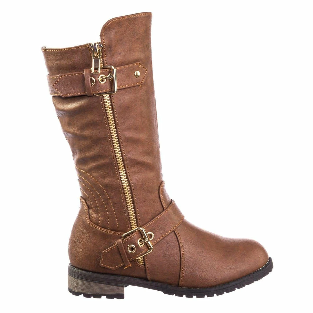 These boots for childrens features a biker inspired riding boots with low block heel, threaded lug sole, hardware buckle detail, a gold non functintonal decorative zipper and an inner zipper closure.