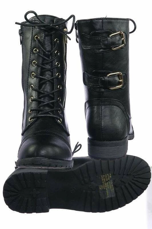 These military inspired fashion combat boots for women features a threaded lug sole, vintage faux wood texture on the outsole, rounded toe, low chunky block heel, combat boots silhouette, lace up closure, one zipper on each side, inner zipper is matching functional zipper while the outer zipper is a decorative (non functional) contrasting metallic metal. The boots also features a stitching detail, multi layer design, two decorative belt buckle on the back and a vintage calf high shaft.
