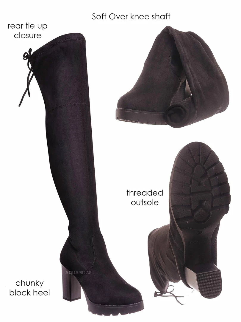 Product Detail : These dress boots features a thigh high shaft with rear tie up closure with chuunky block high heel, threaded lug sole and lightly padded insole. Maximum thigh width must be smaller than 16 inches around or you will not be able to pull the boot shaft up.