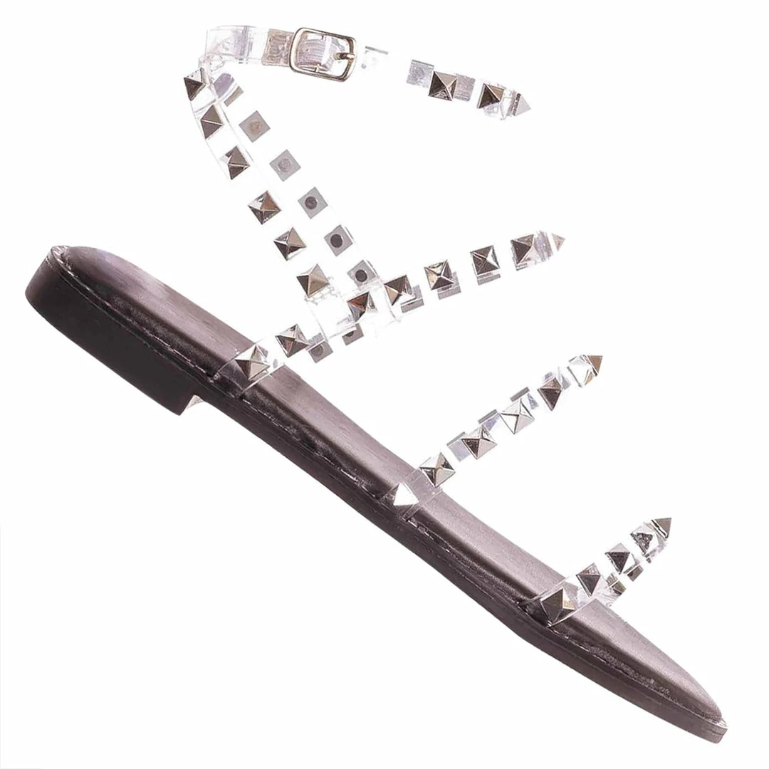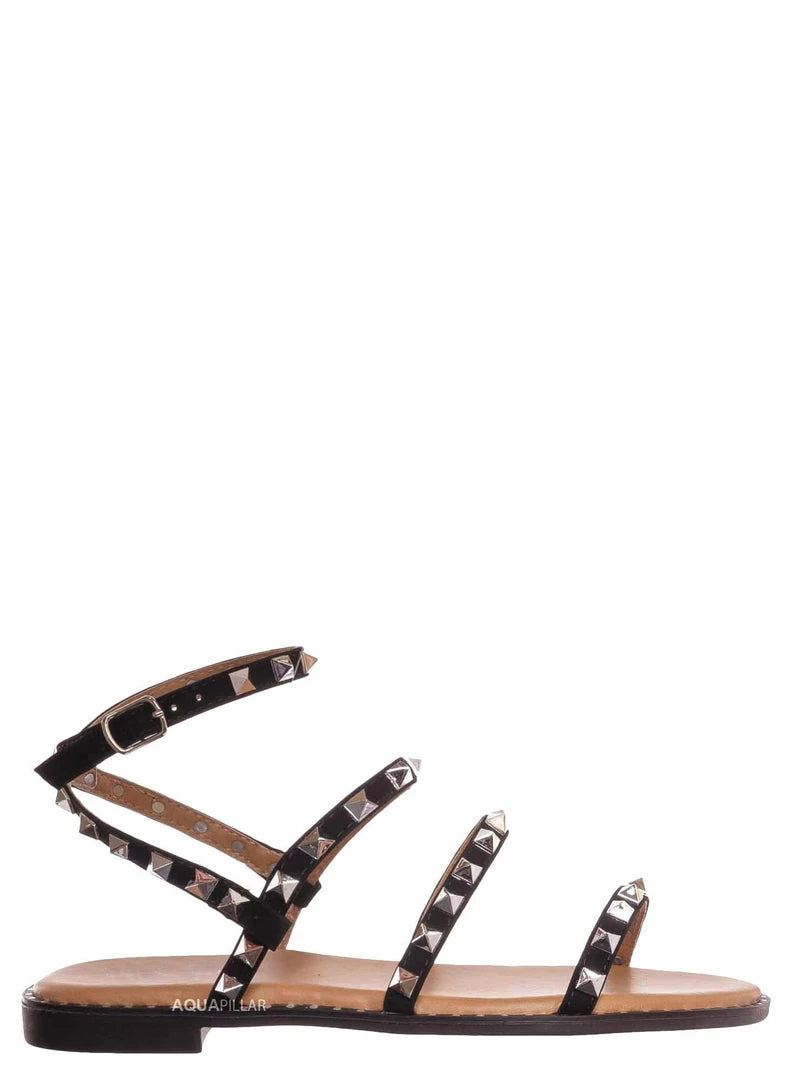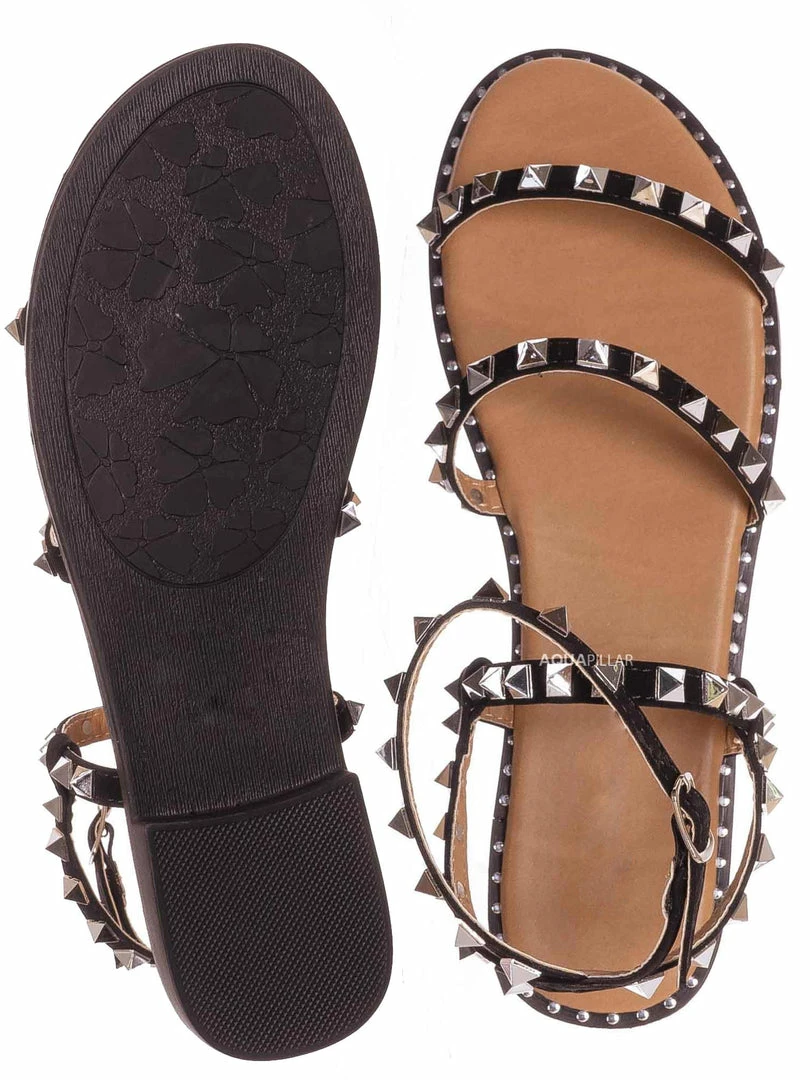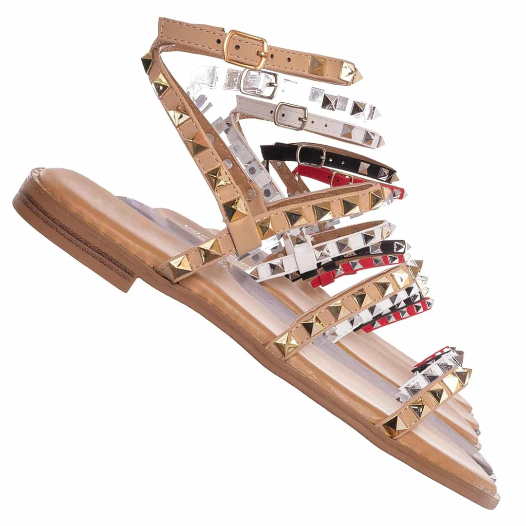 Product Detail: This punk rock sandal features a gladiator-inspired strappy silhouette embellished in pyramid-shaped metal spikes and a round grommet around the welt. These summer flat can be easily secured in the adjustable ankle strap and is padded in light foam.