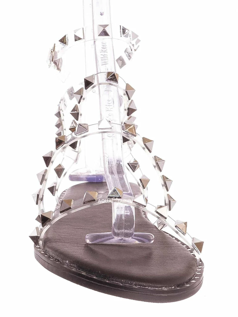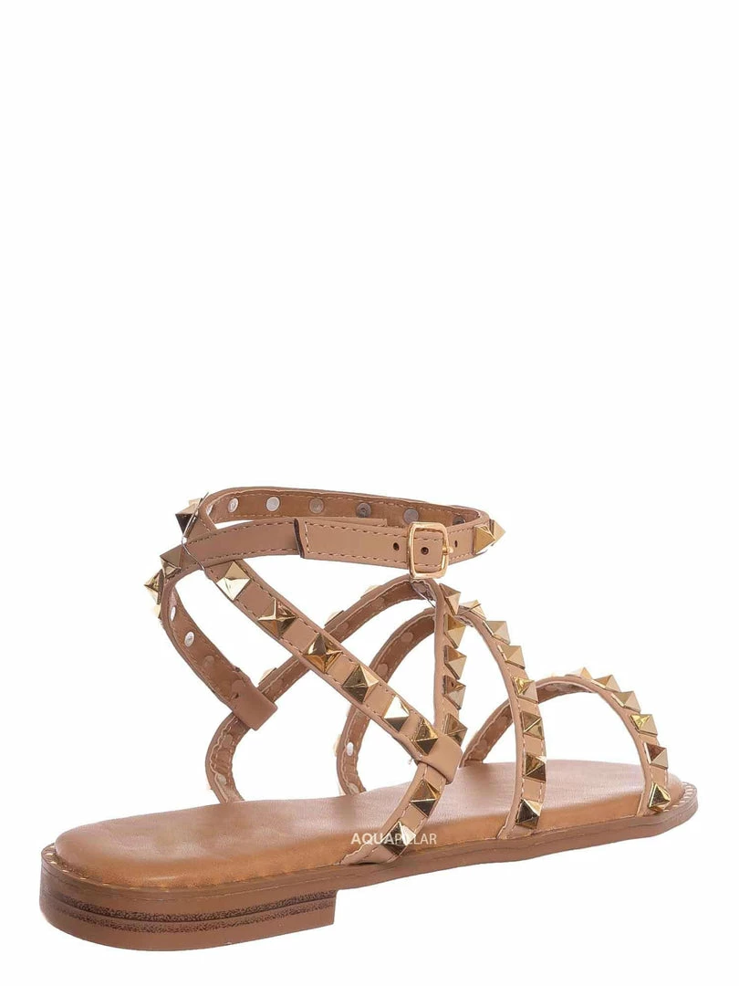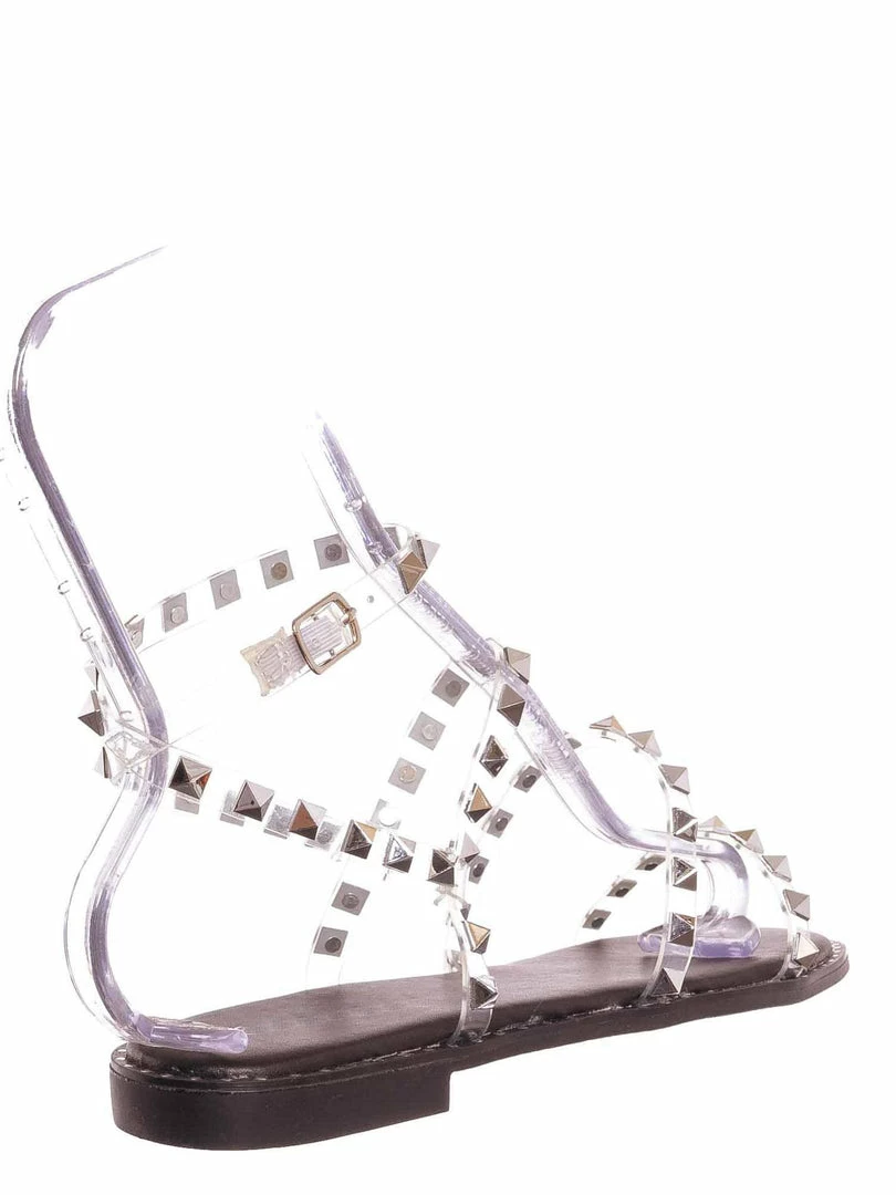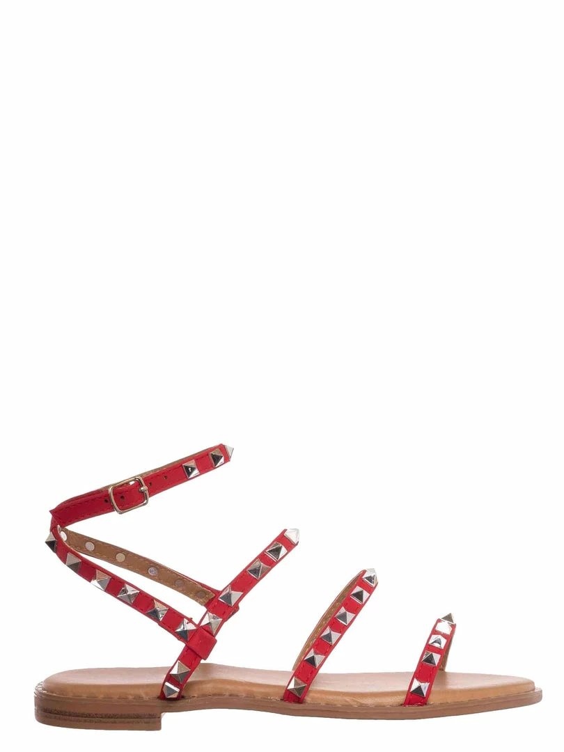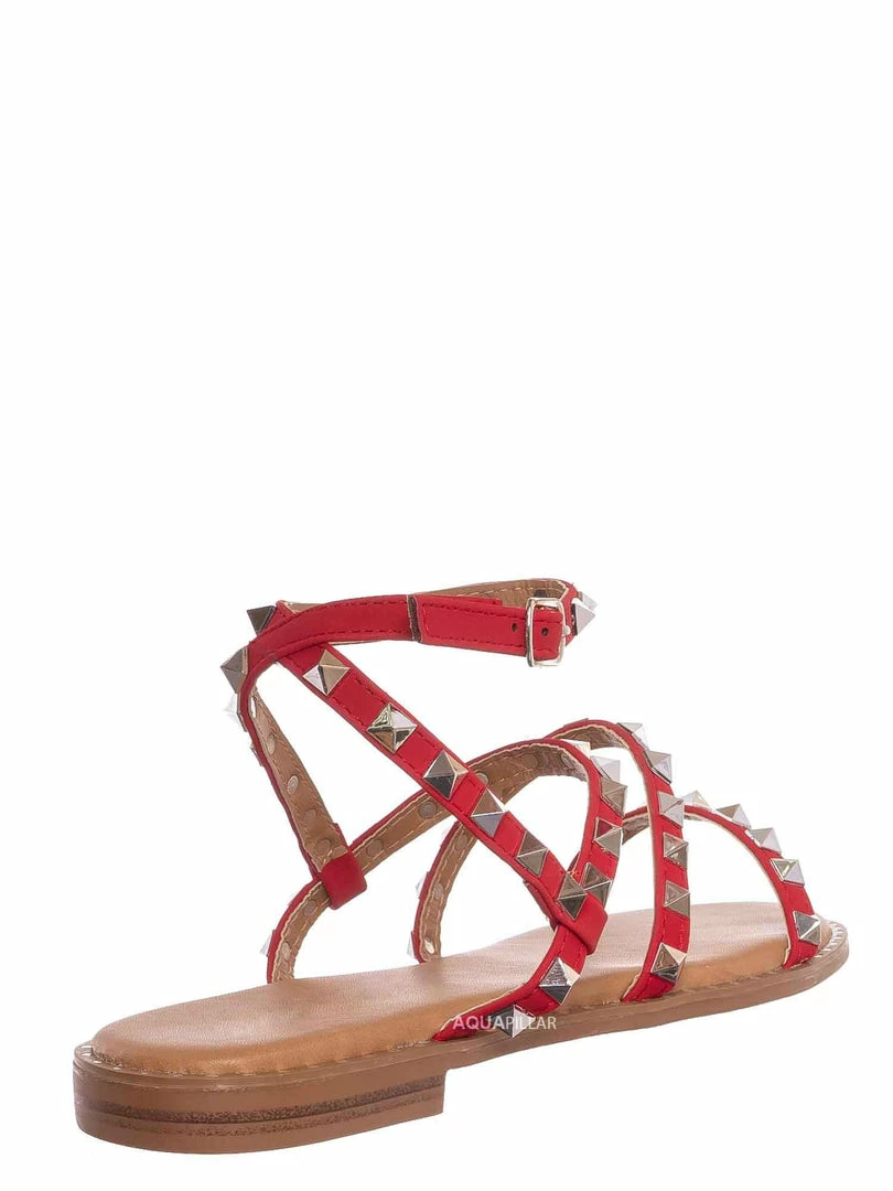 Product Detail: This punk rock sandal features a gladiator-inspired strappy silhouette embellished in pyramid-shaped metal spikes and a round grommet around the welt. These summer flat can be easily secured in the adjustable ankle strap and is padded in light foam.