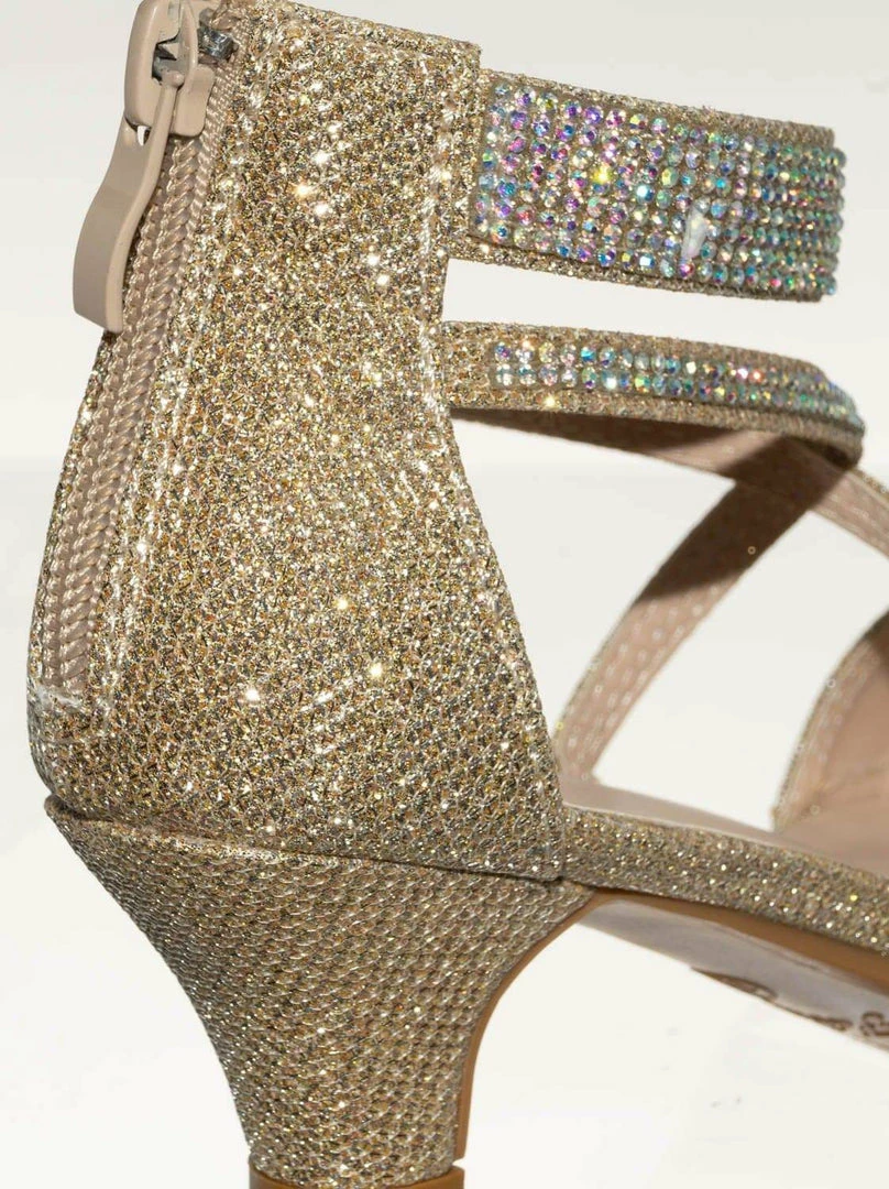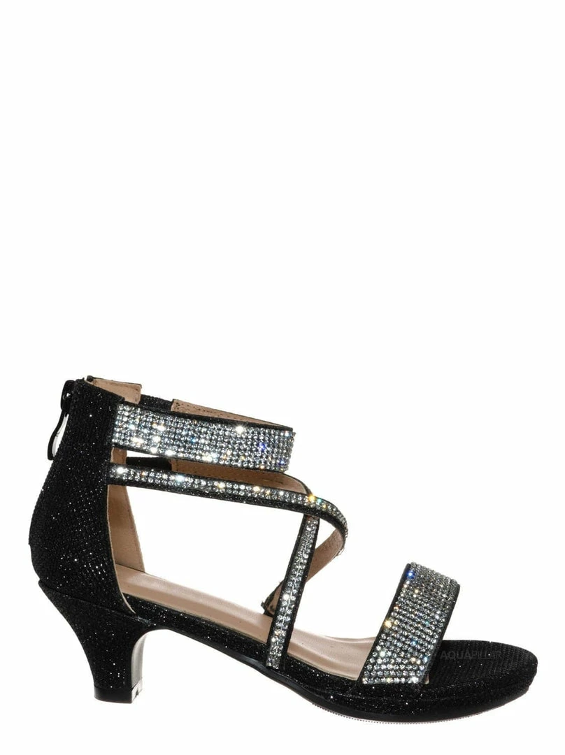 Product Detail : These dress sandals for little girls features a criss crossing strap design, rhinestone embellished straps, mesh glitter fabric, rear zipper closure, side elastic, tapered block high heel, rounded open toe, low platform and lightly padded insole.