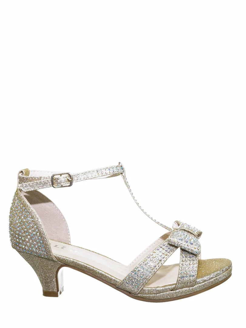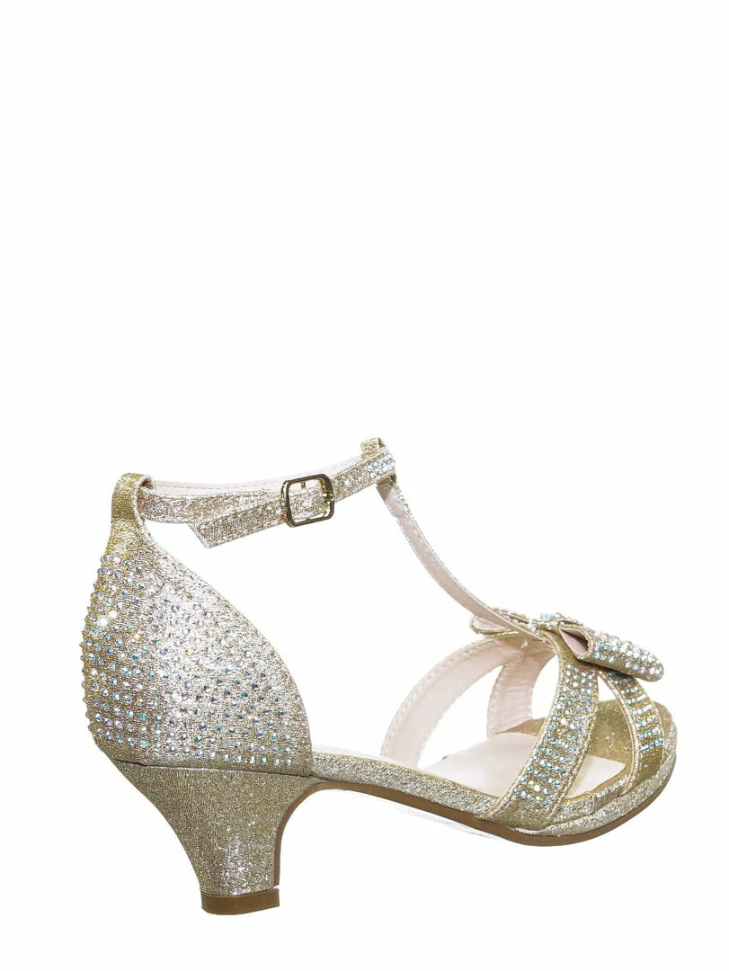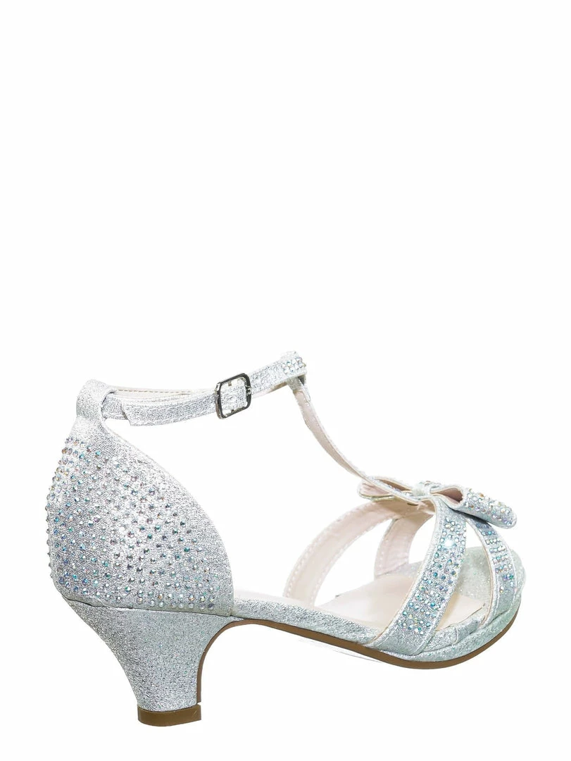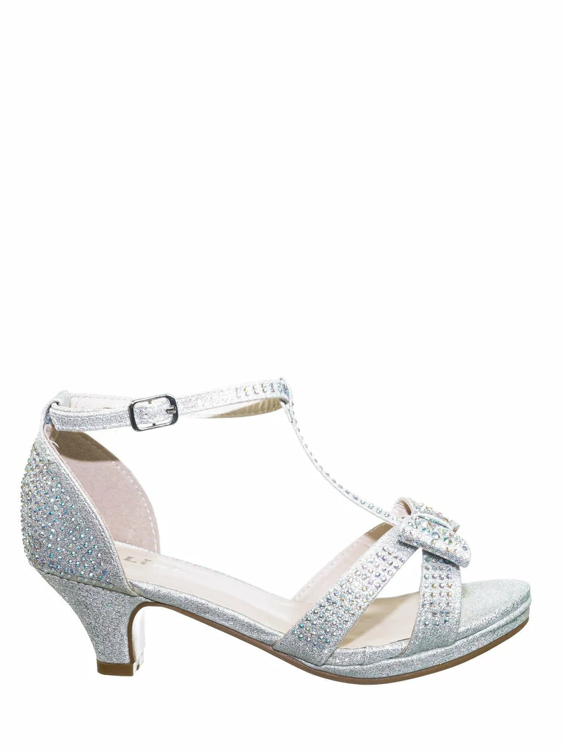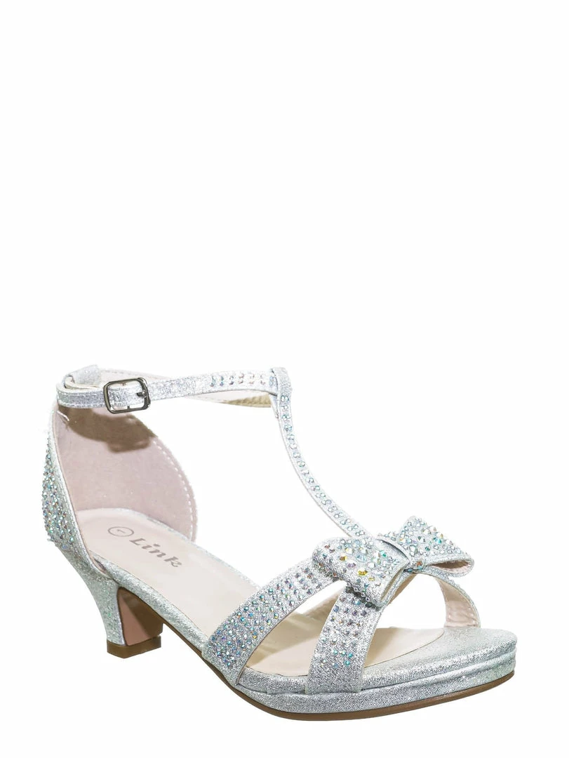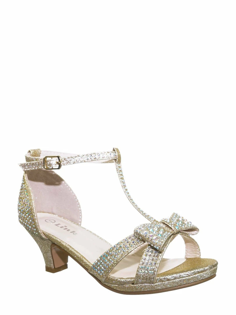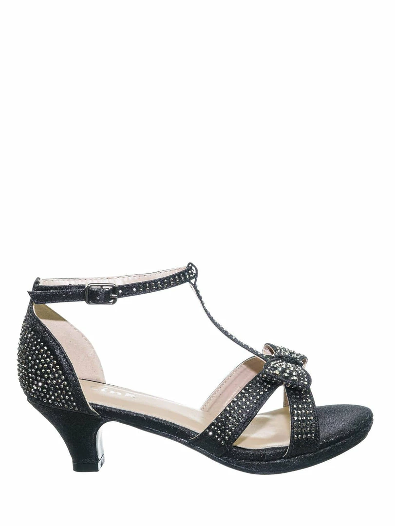 Product Detail : These dress sandals for little girls features a comfortable low block high heel, open toe construction, glitter mesh fabric, rhinestone crystal embellished upper, adjustable ankle strap, closed heel counter, strappy t-strap, front bow ornamentation and low platform.