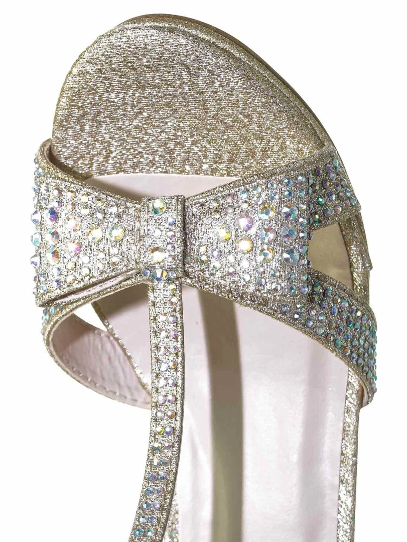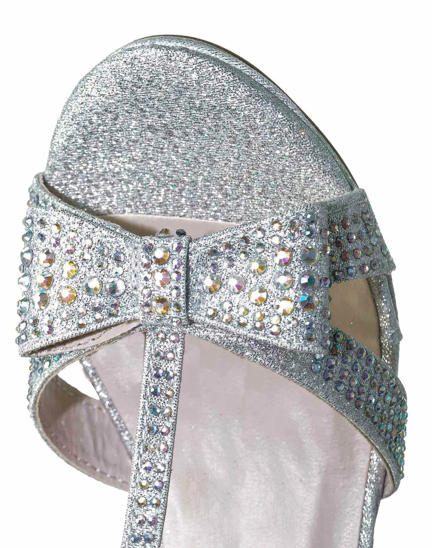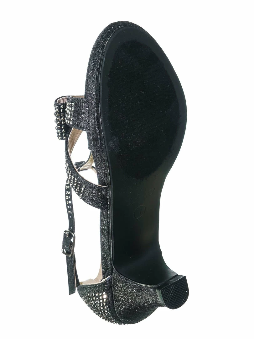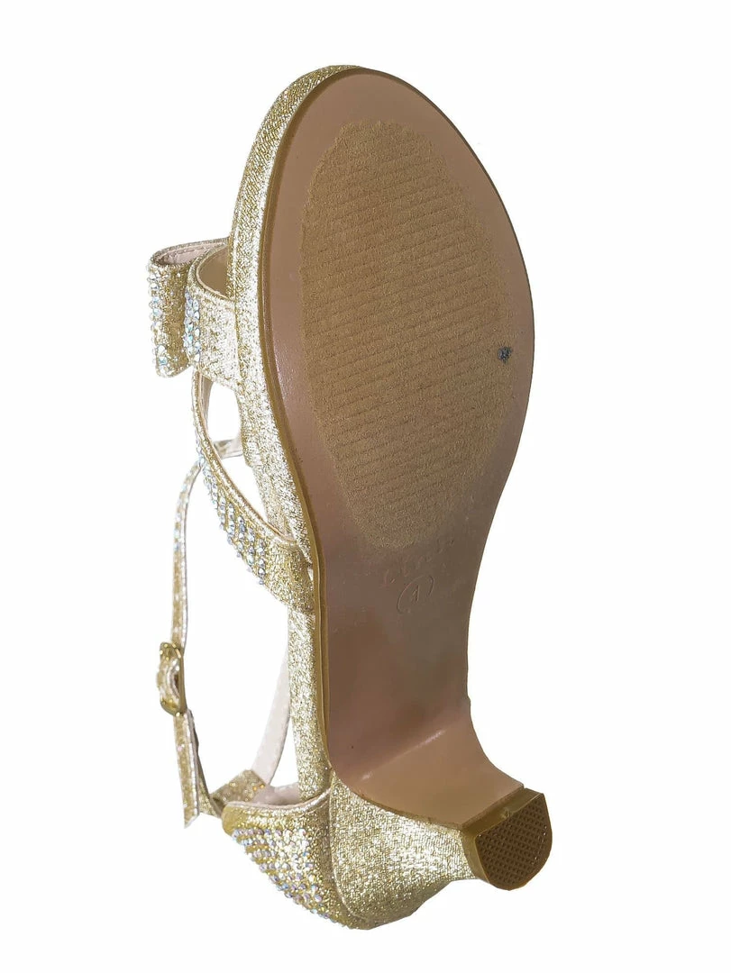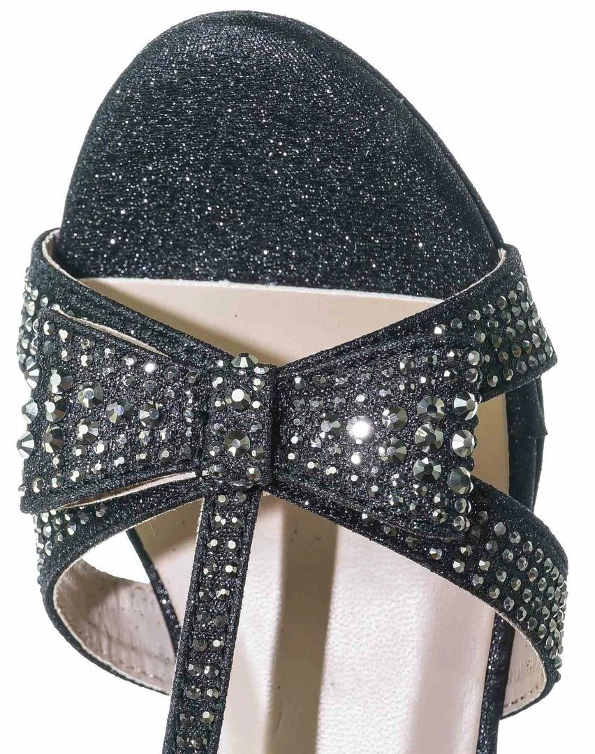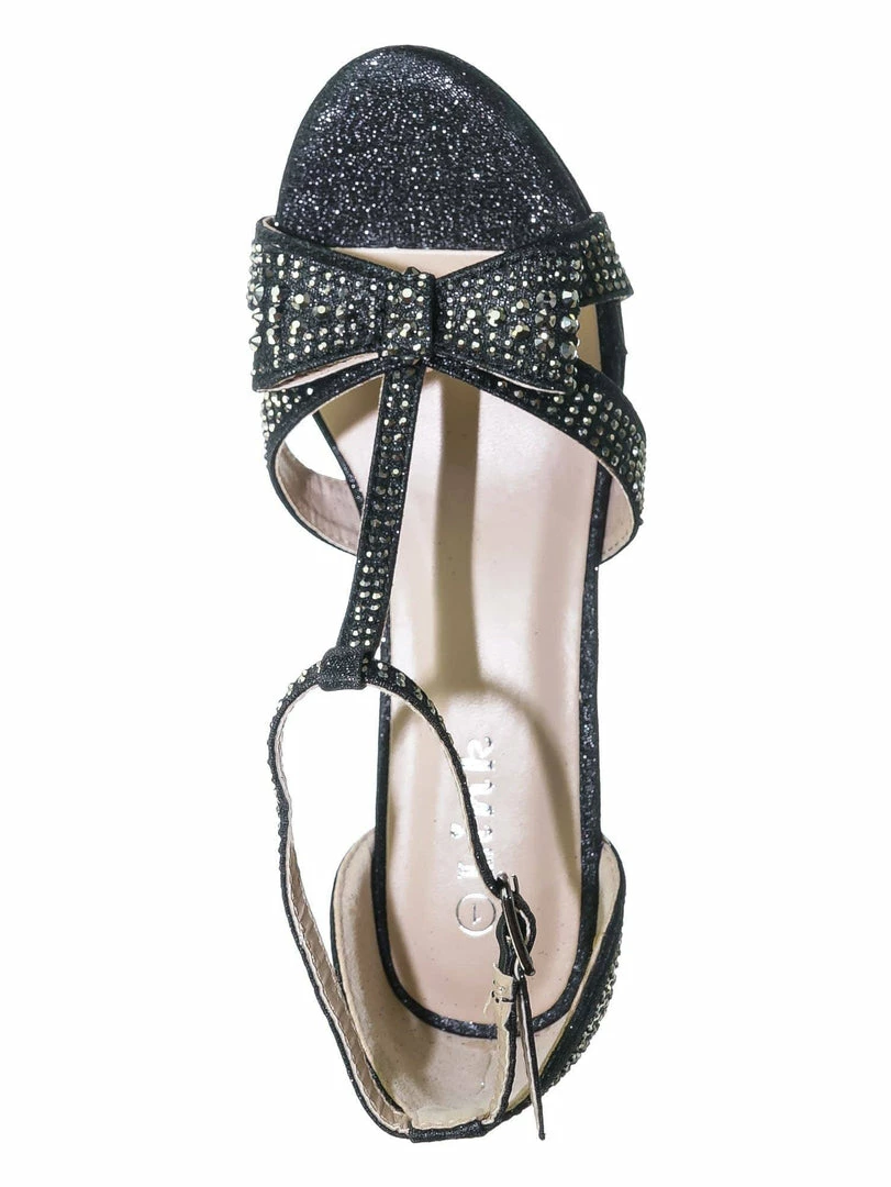 Product Detail : These dress sandals for little girls features a comfortable low block high heel, open toe construction, glitter mesh fabric, rhinestone crystal embellished upper, adjustable ankle strap, closed heel counter, strappy t-strap, front bow ornamentation and low platform.