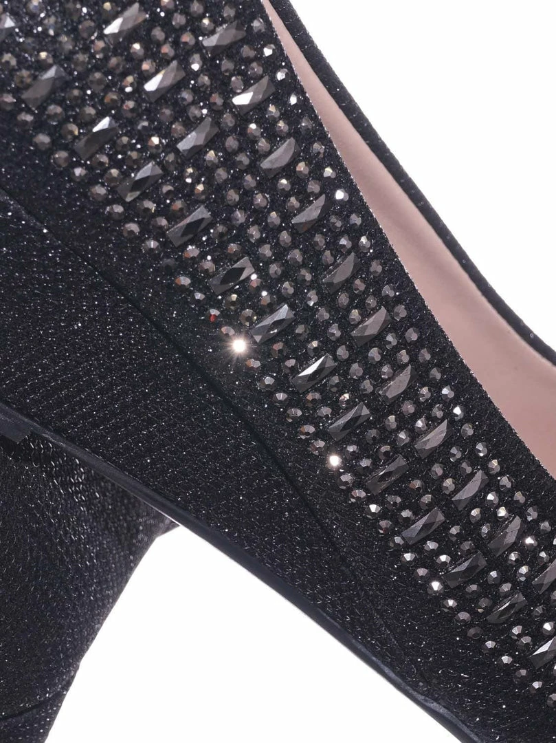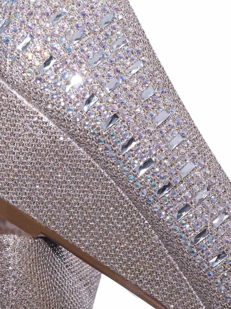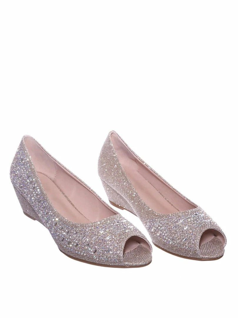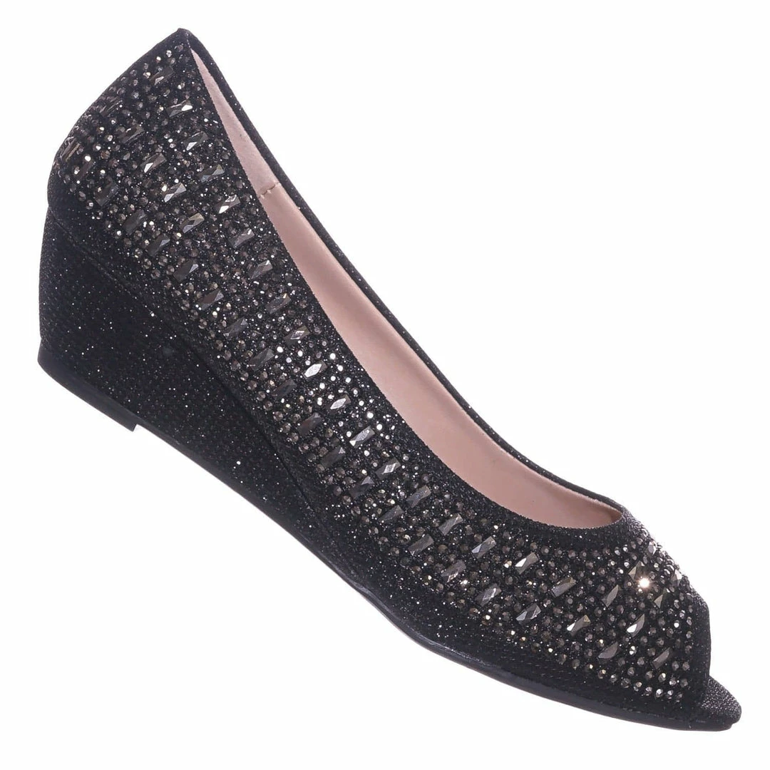 Product Detail : These party dress pumps features a comfortable low heel wedge, slip on construction, peek-a-boo toe opening, classic dress pump silhouette, rhinestone crystal embellished on a mesh glitter upper and lightly padded insole.