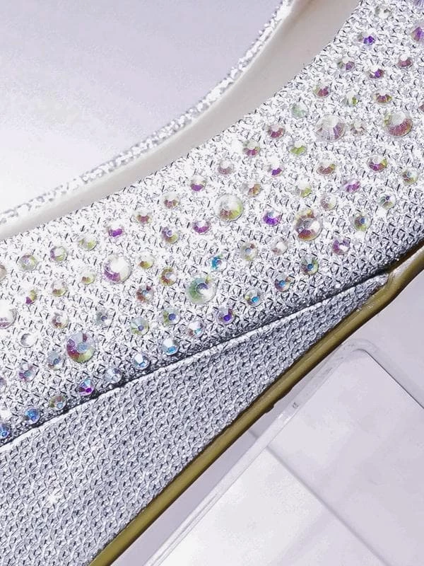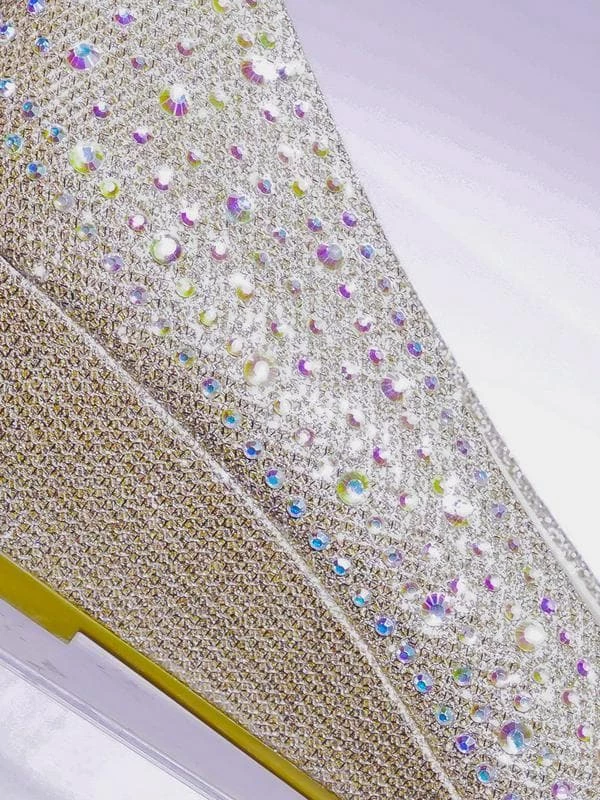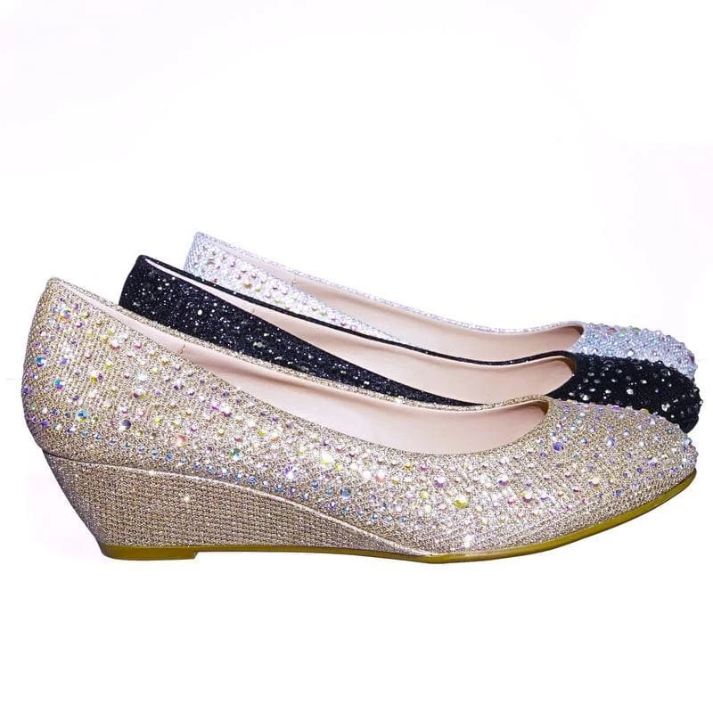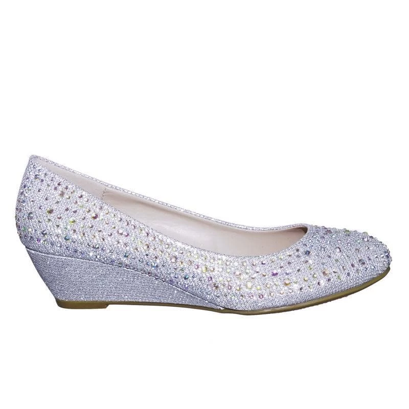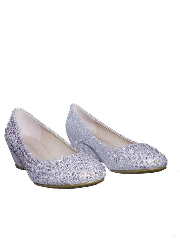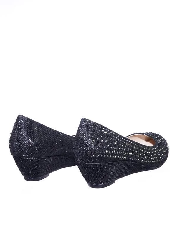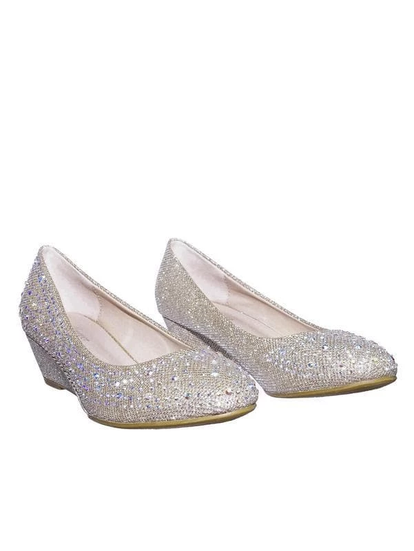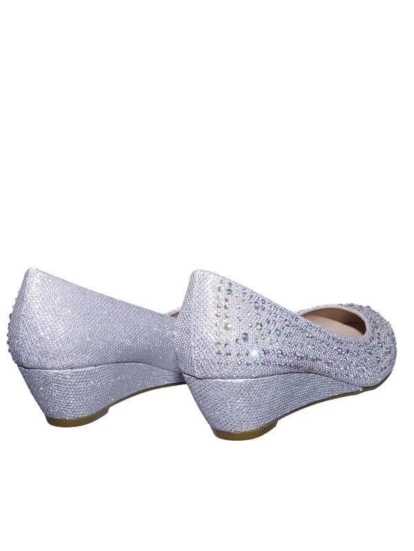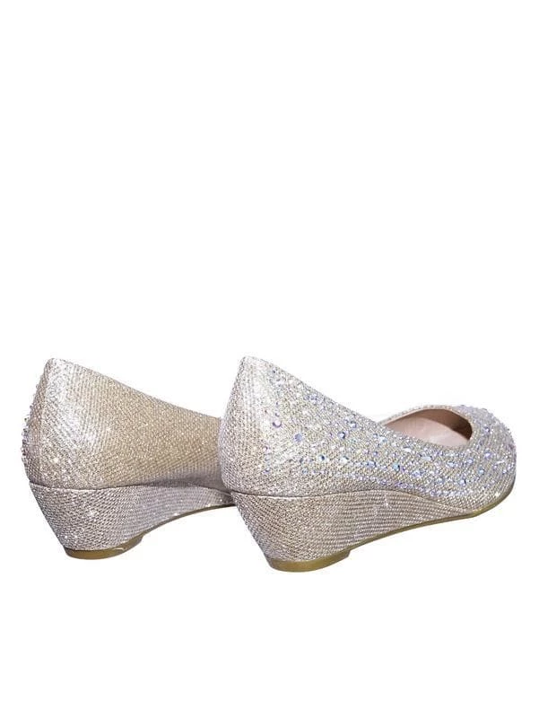These party dress pump features a mesh glitter upper, asymmetrical rhinestone array embellishment, rounded toe, low wedge, lightly padded insole.