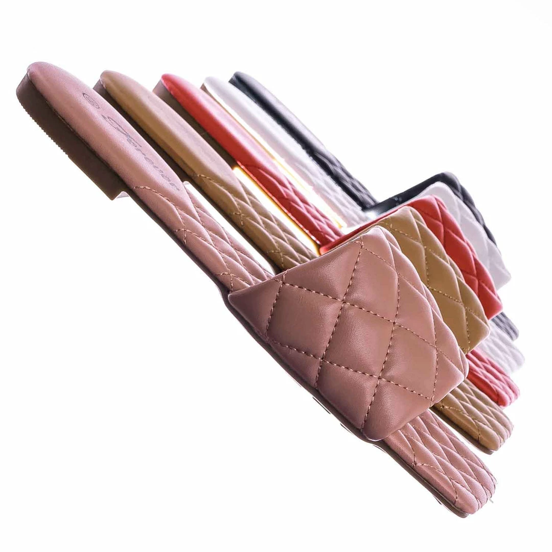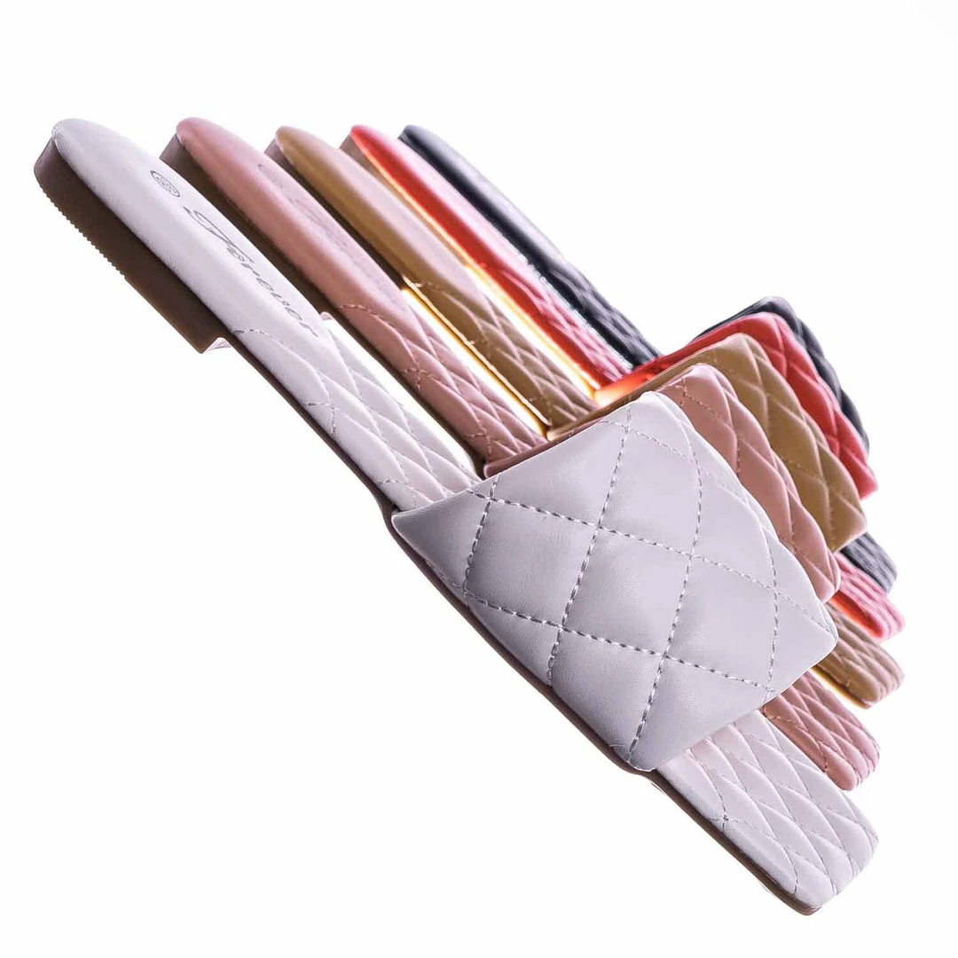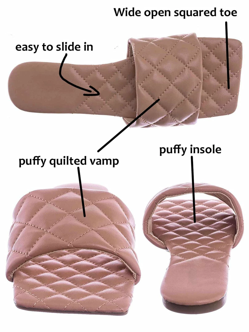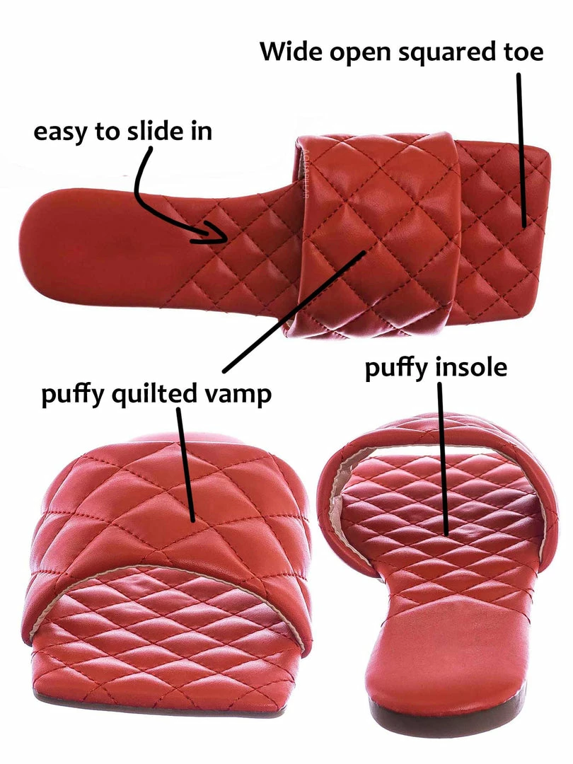 Product Detail : These slides slipper features a elonged square toe, diamond shaped puffy quilted stitching, single band slide in construction and quilted insole. The insole is also puffy padded and a puffy quilted insole for extra comfort, the elongated square toe provides extra toe space and conversation starter.