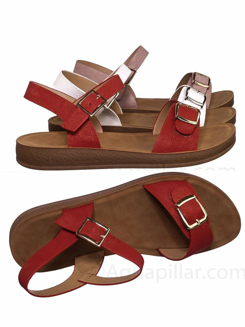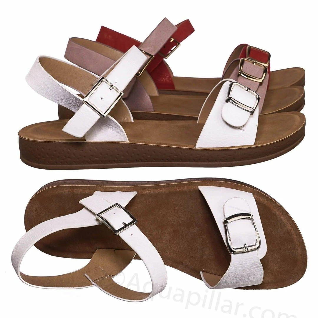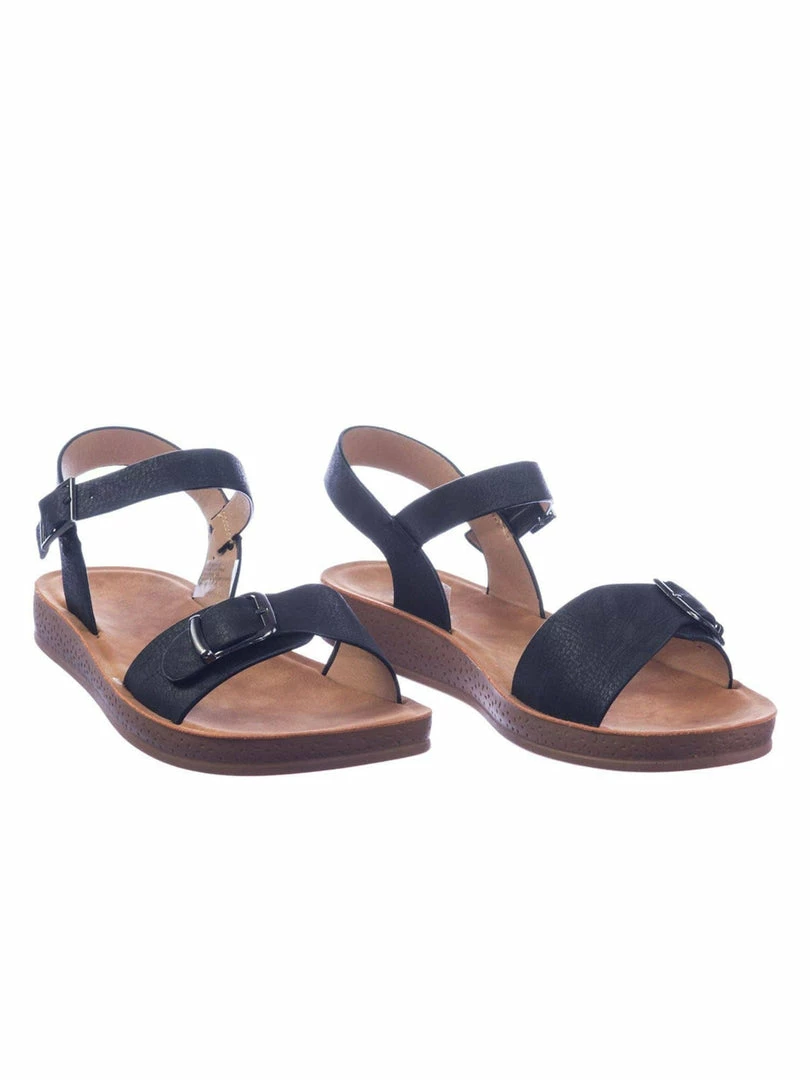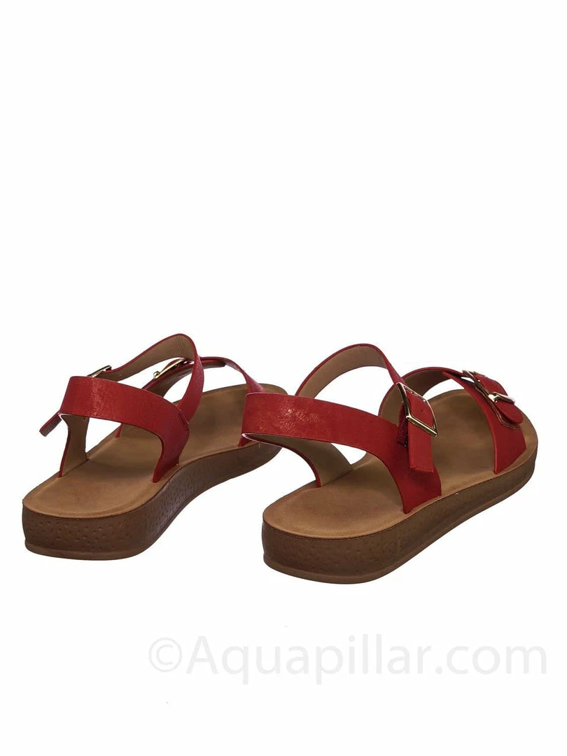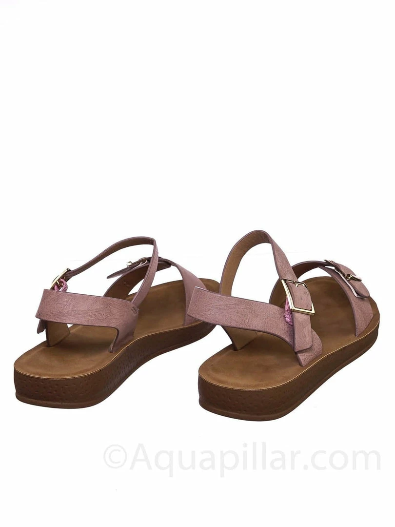 Product Detail : Get comfy with these rubber Flatform sandal featuring a thick padded outsole, decorative buckled foot strap and adjustable ankle straps.