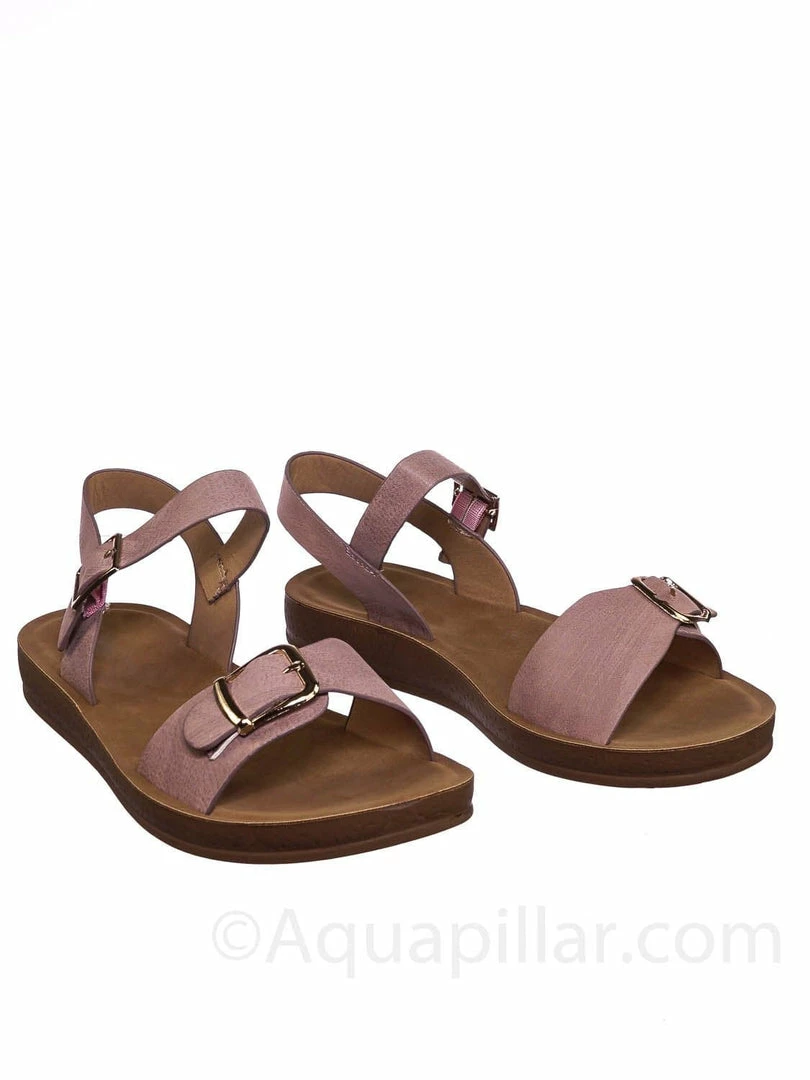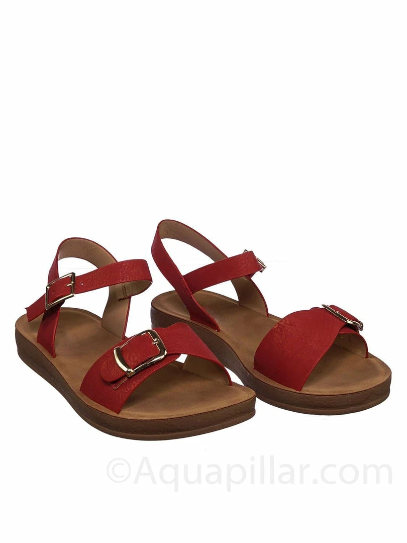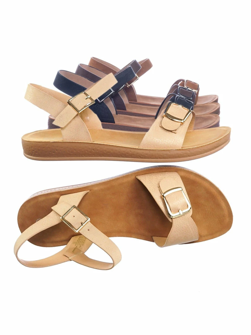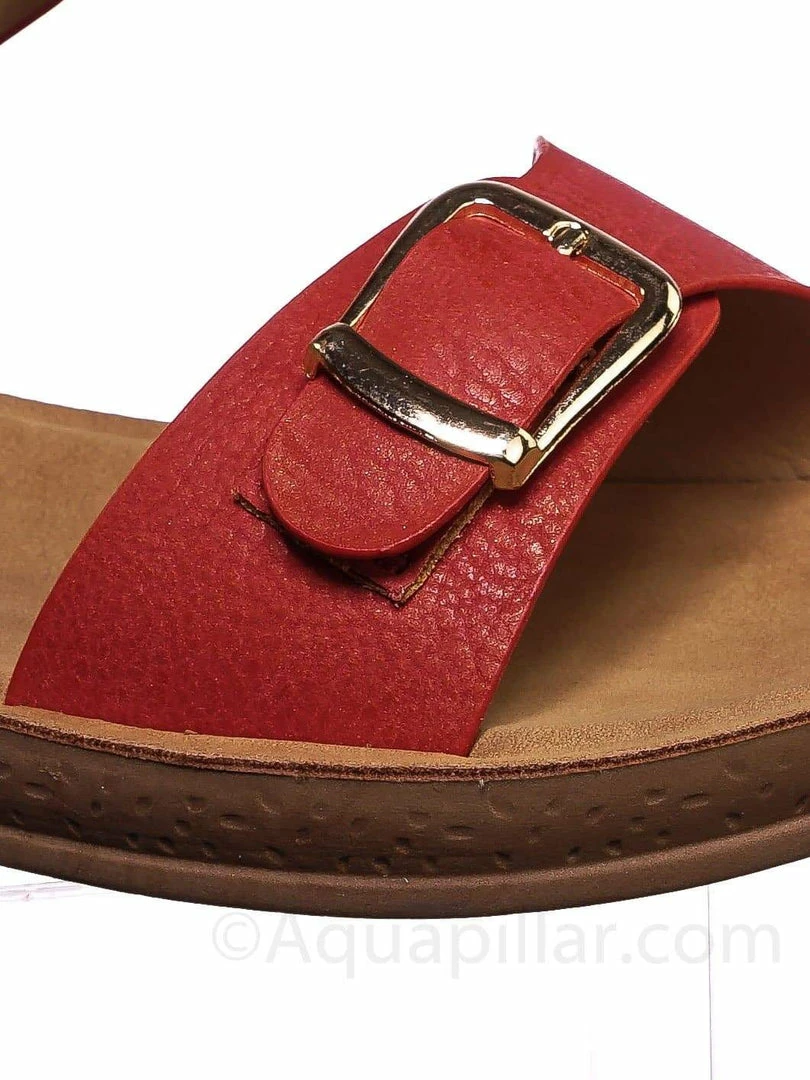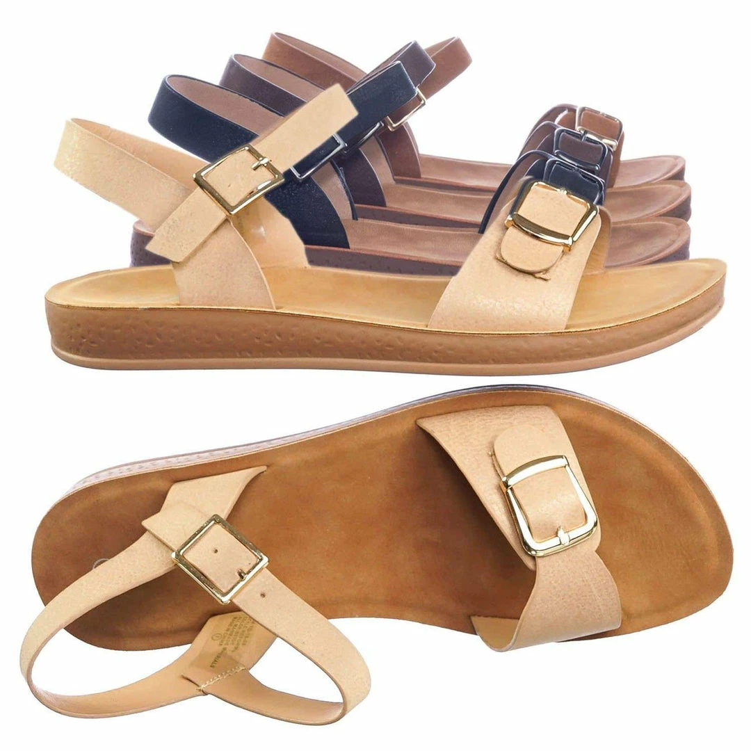 Product Detail : Get comfy with these rubber Flatform sandal featuring a thick padded outsole, decorative buckled foot strap and adjustable ankle straps.
