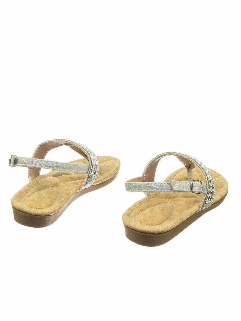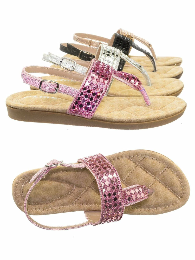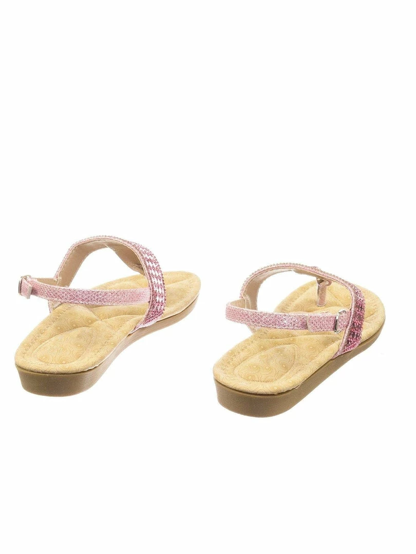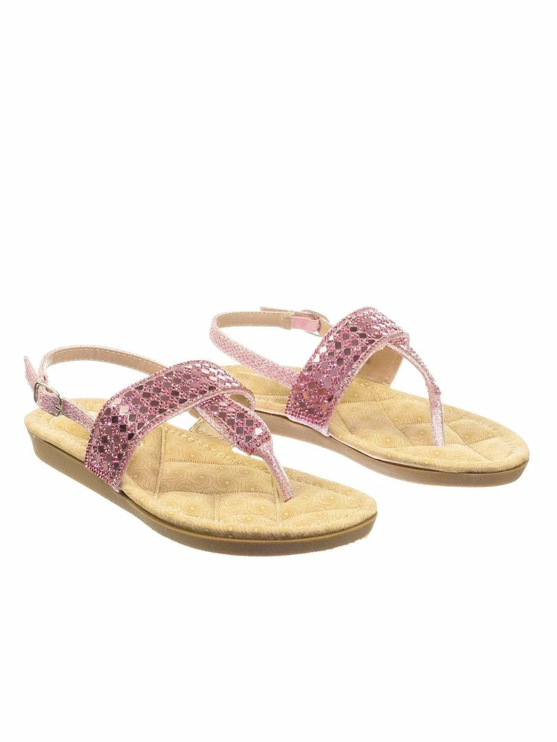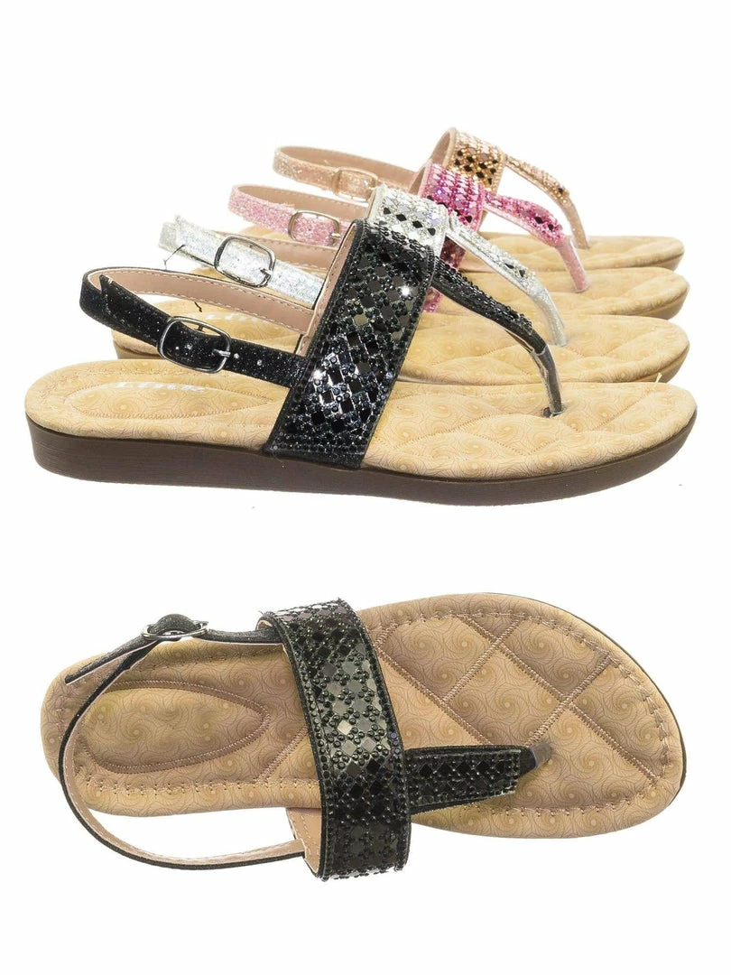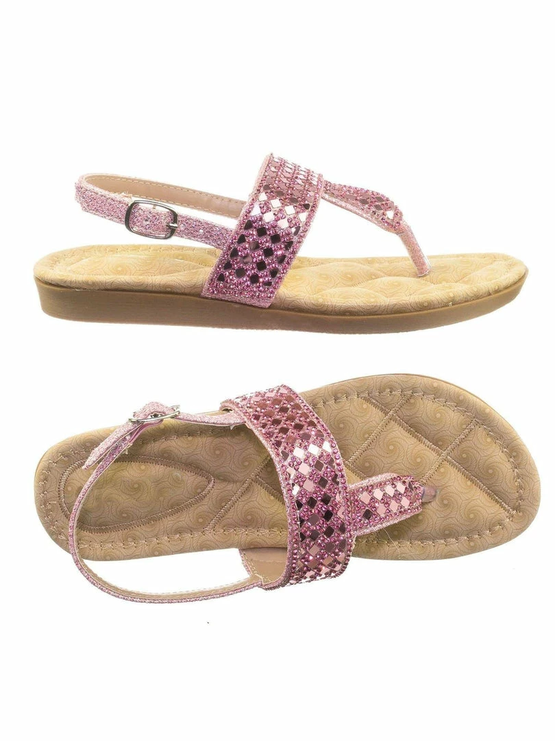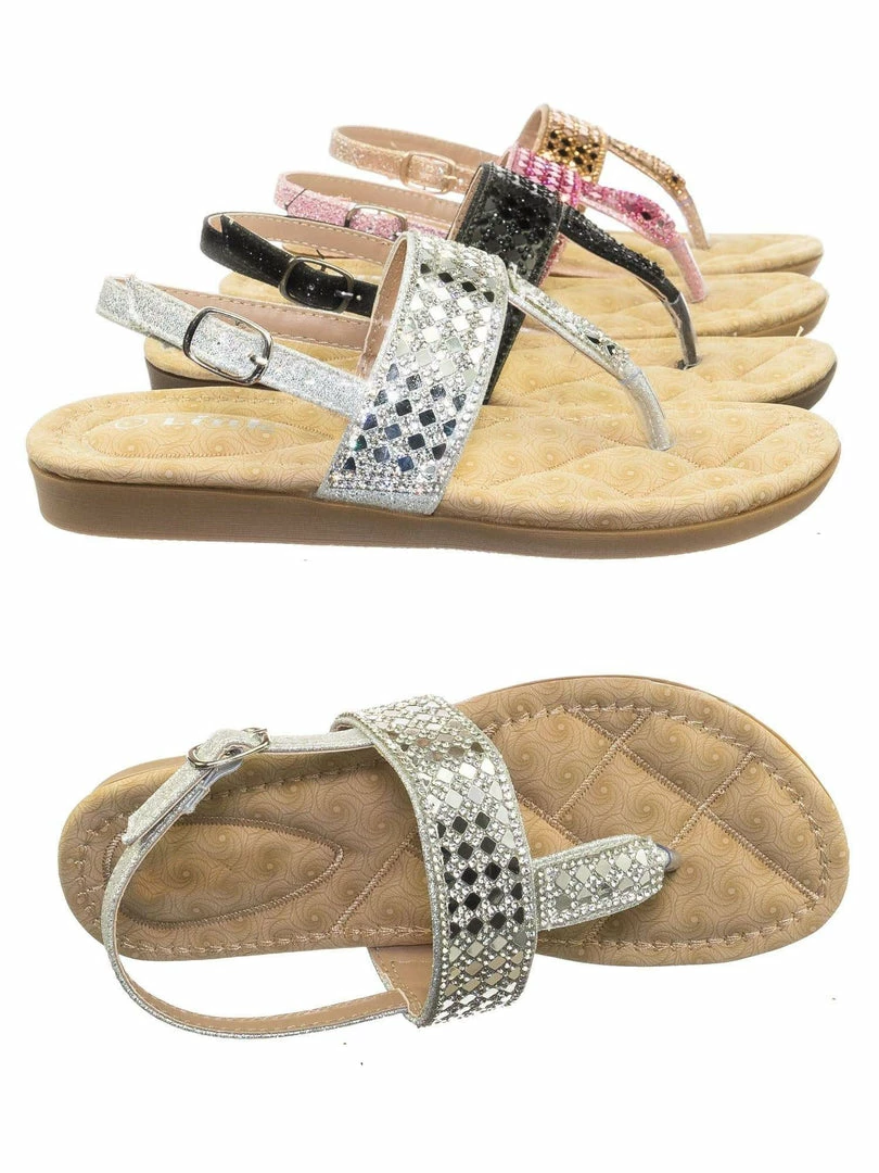 About This Shoes :Bling up your girls in these comfortable soft foam padded insole on low wedge, adjustable sling back strap in glitter and rhinestone crystal embellished thong strap. Brand – Forever Link