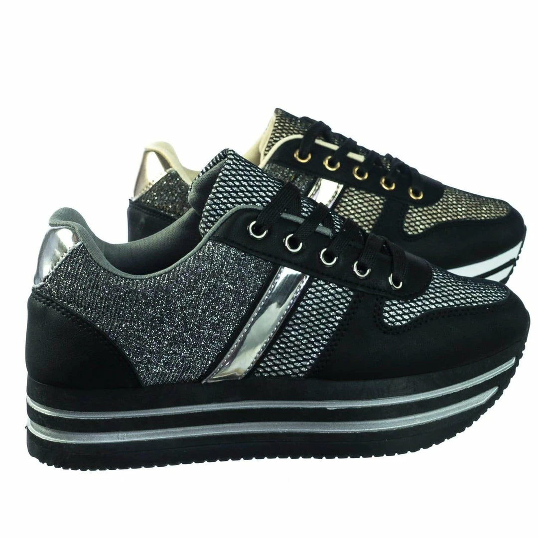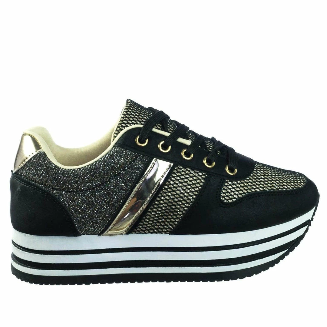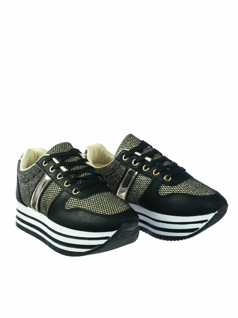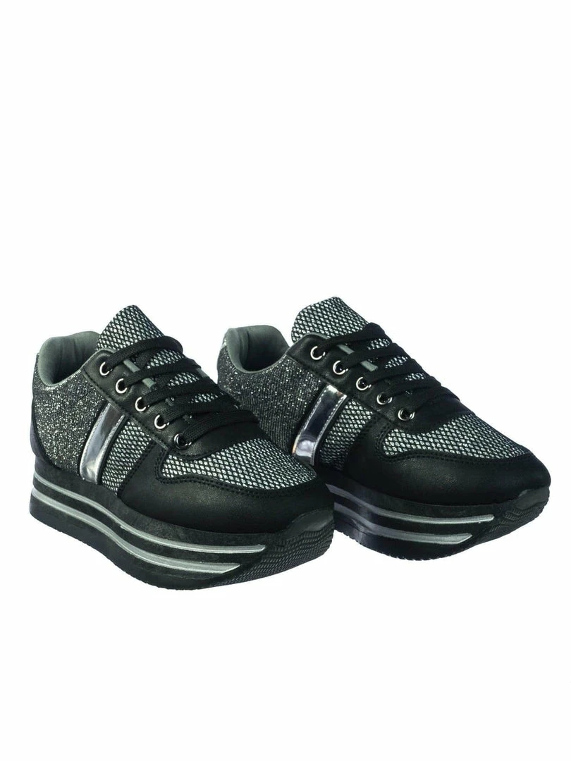These sneakers features a athletic silhouette, a supportive comfortable rubber platform with stripes, metallic layers, glitter mesh fabric and lace up closure.