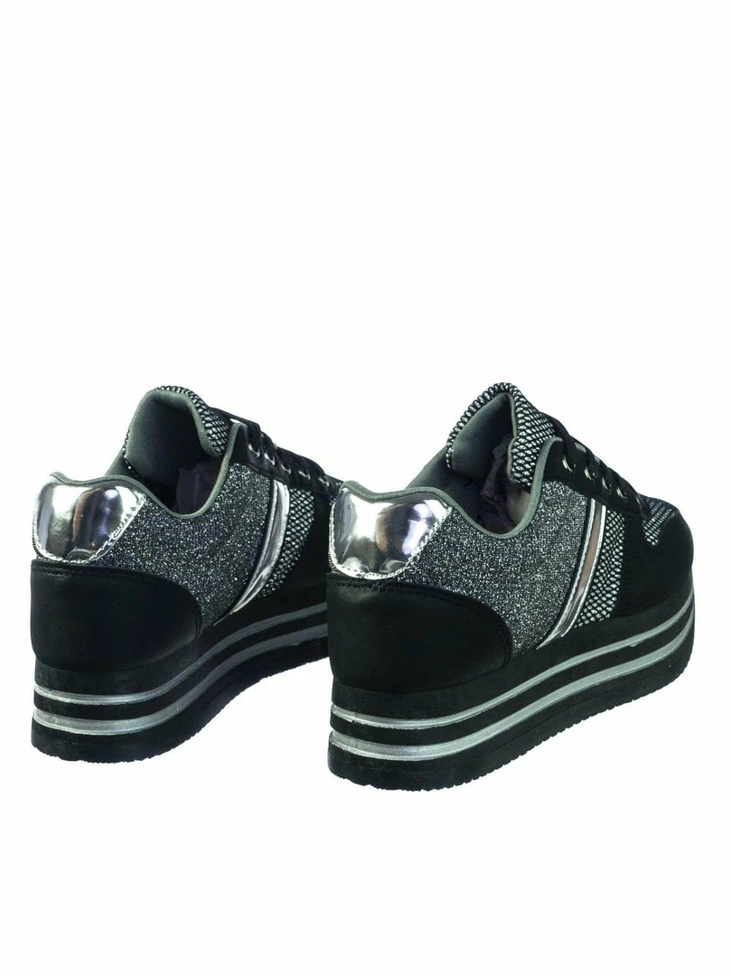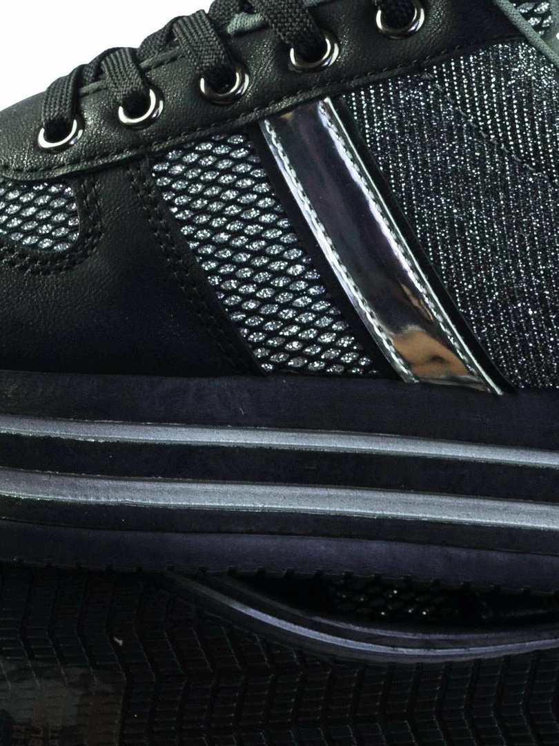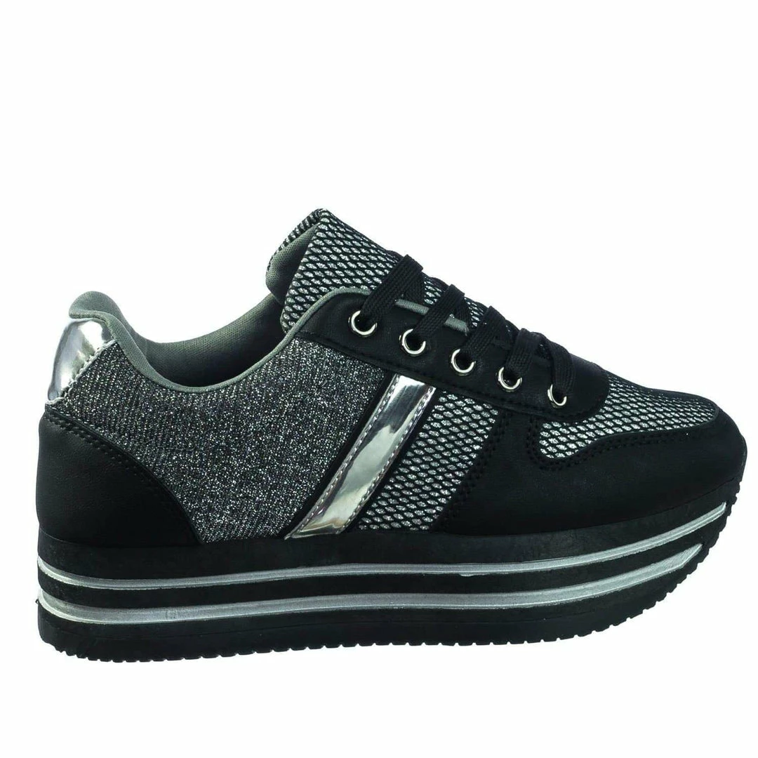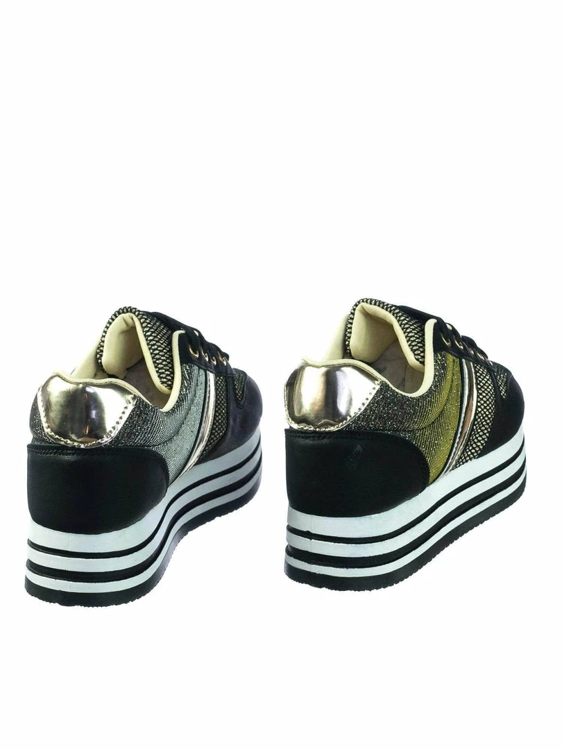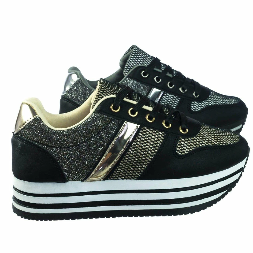 These sneakers features a athletic silhouette, a supportive comfortable rubber platform with stripes, metallic layers, glitter mesh fabric and lace up closure.
