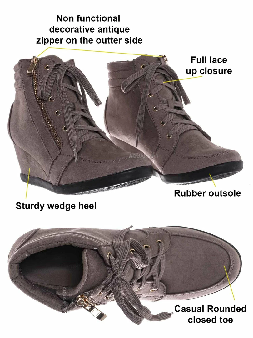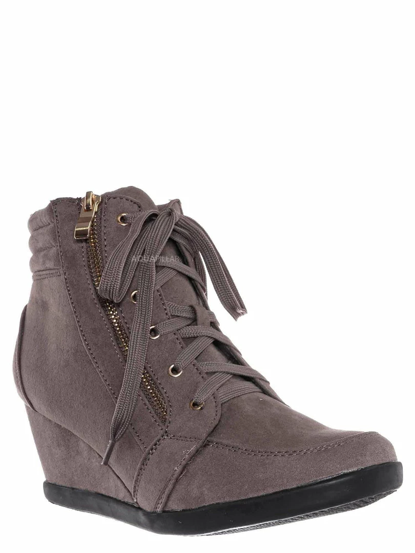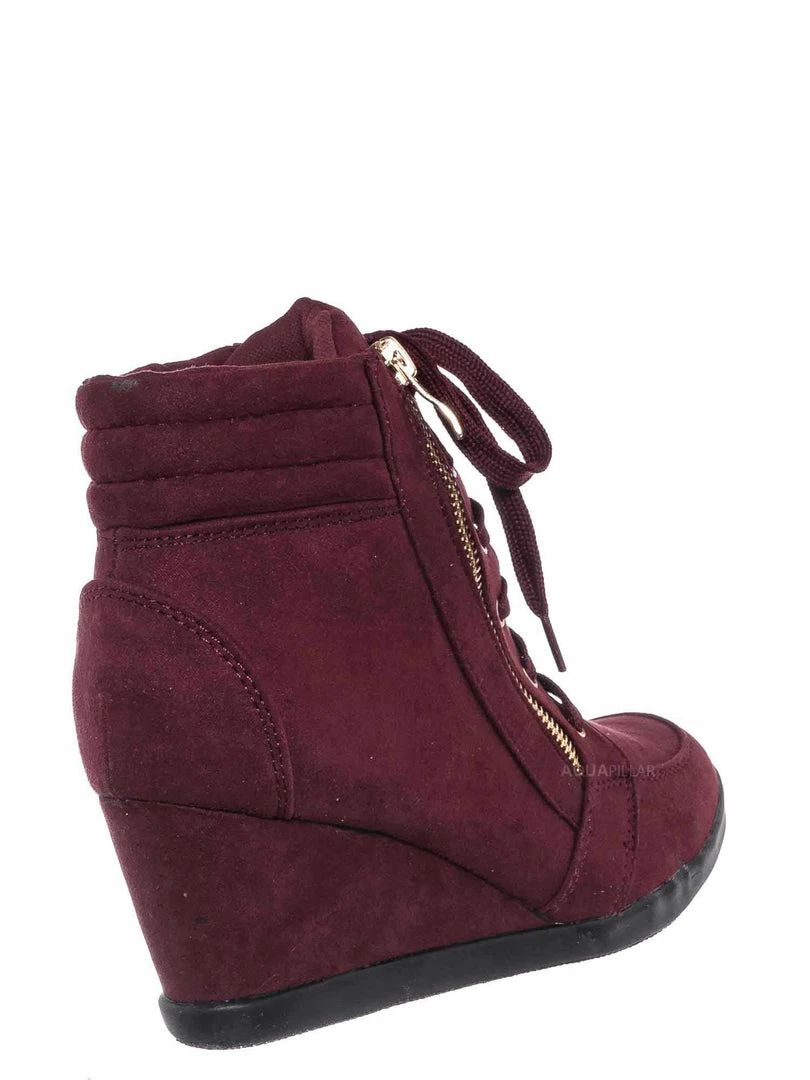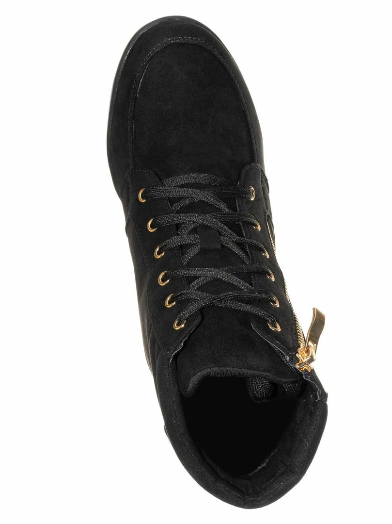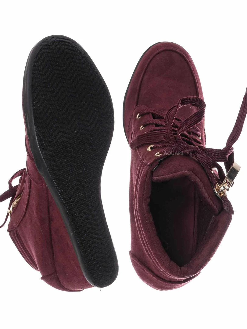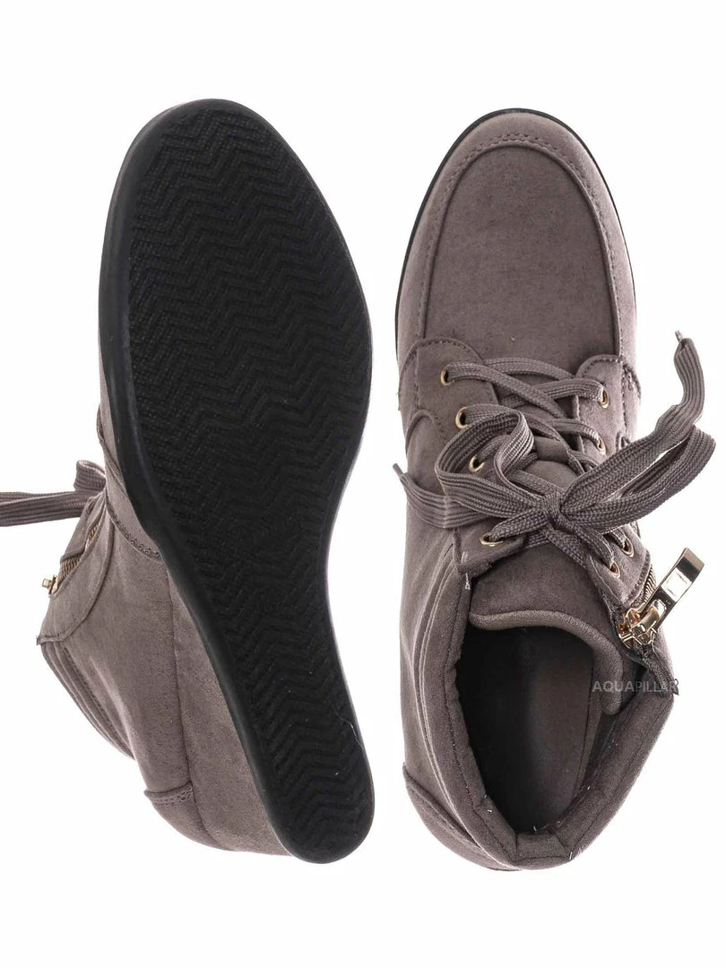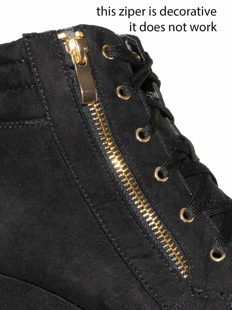 Product Detail : These sporty sneakers features a classic 90’s girl pop band silhouette, NON FUNCTIONAL antique zip ornamentation on the outer side of the shoes, invisible hidden wedge, rounded closed toe, lace up closure, padded heel collar, and lightly padded insole.