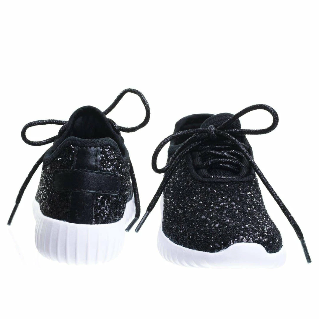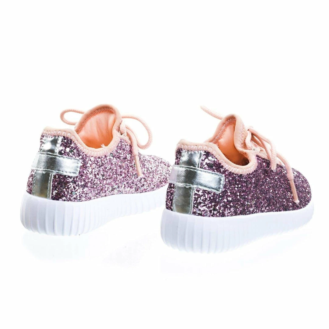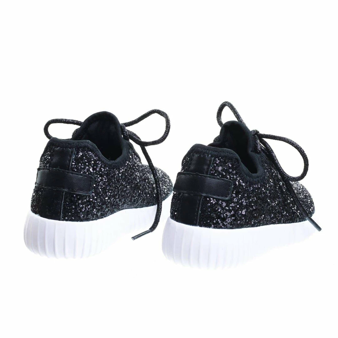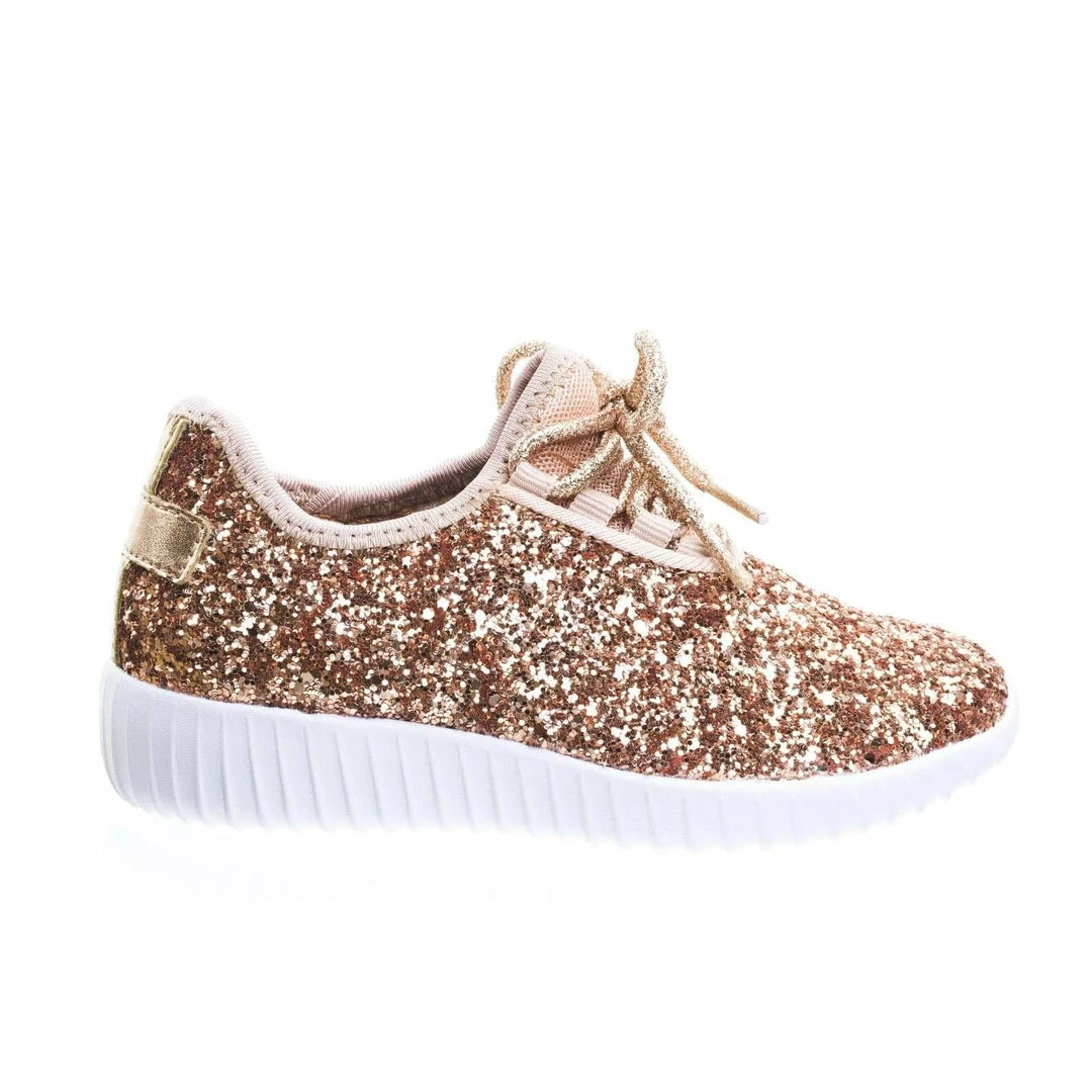 About This Shoes :Let your little girl run in style in these adorable sparkling sneakers featuring white threaded lug sole, rock glitter upper and glittery lacing. The black and rose gold both features glitter lace but the pink uses non glitter lace. Brand – Forever Link