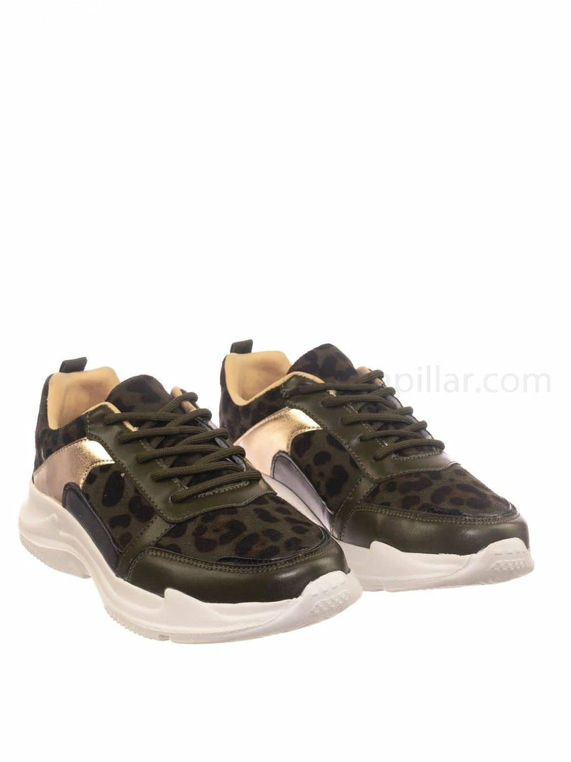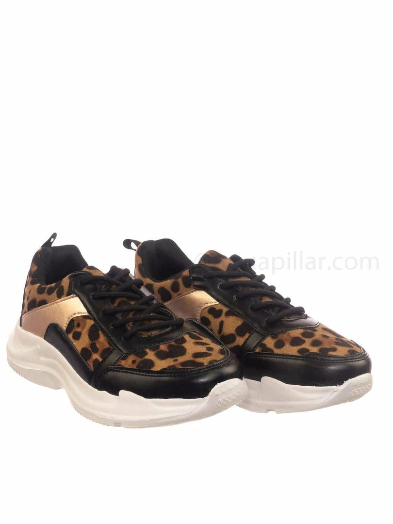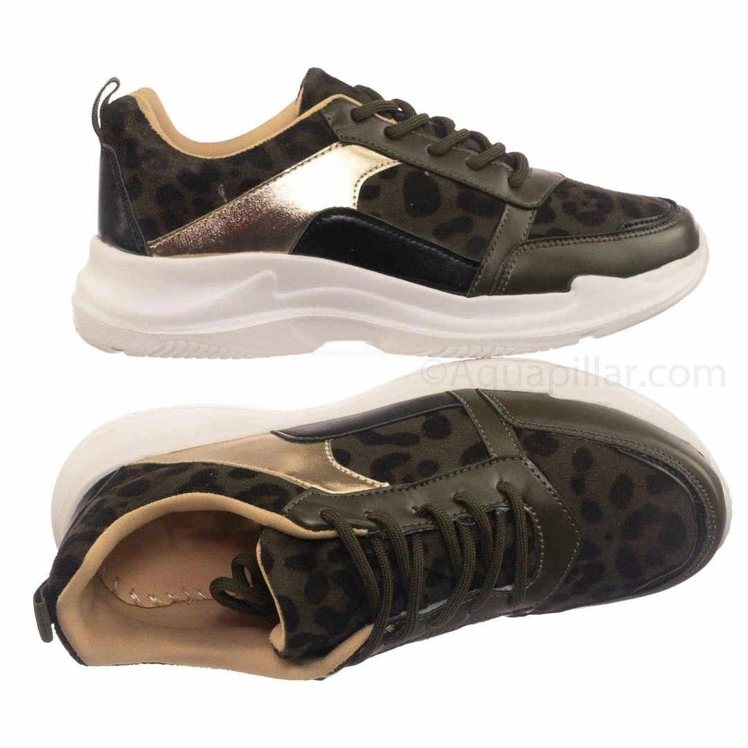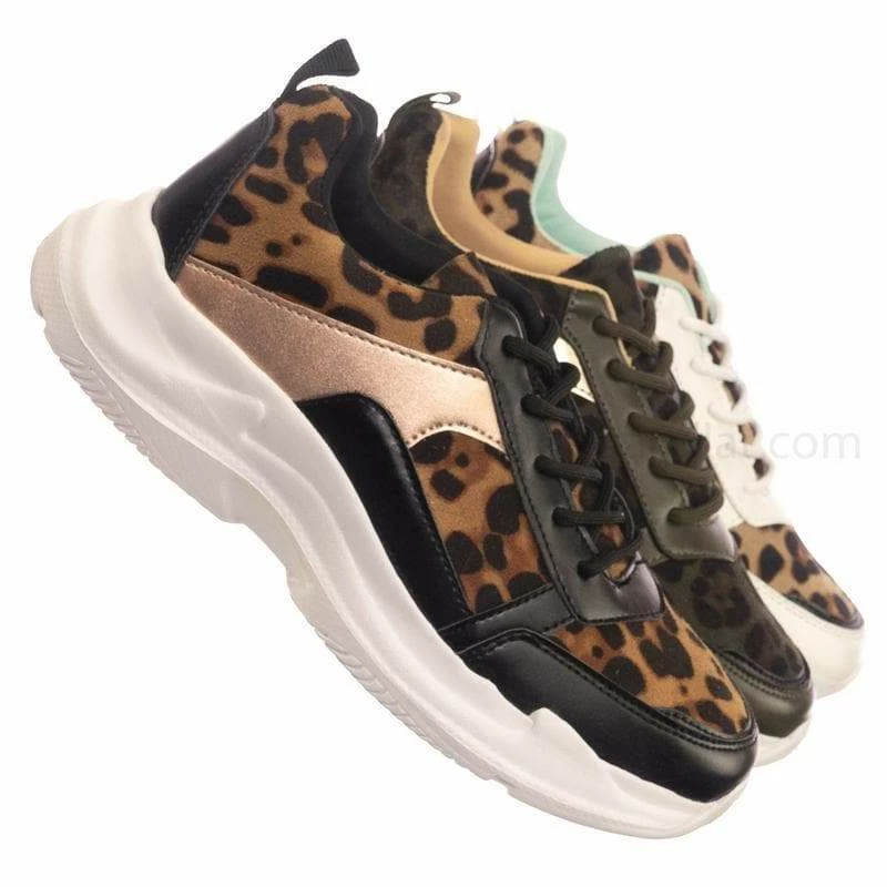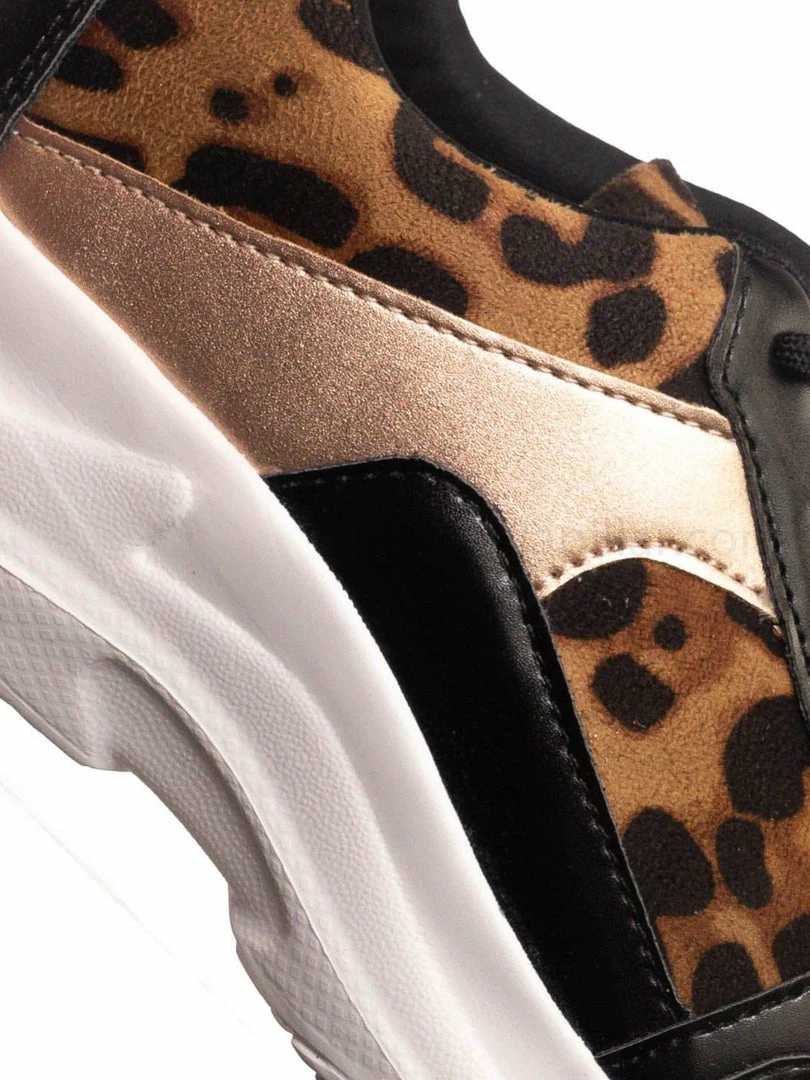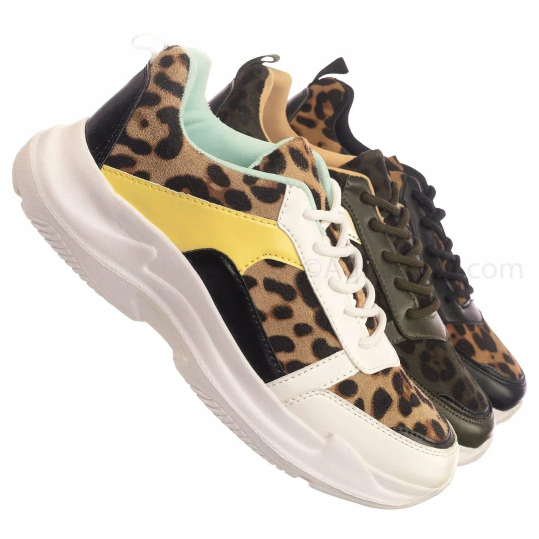 Product Detail : These fashion sneakers features a chunky dad sneaker silhouette, thick white Eva platform, rounded toe, paneled multi colored fabric, lace up closure, rear pull tab, padded insole and leopard prints.