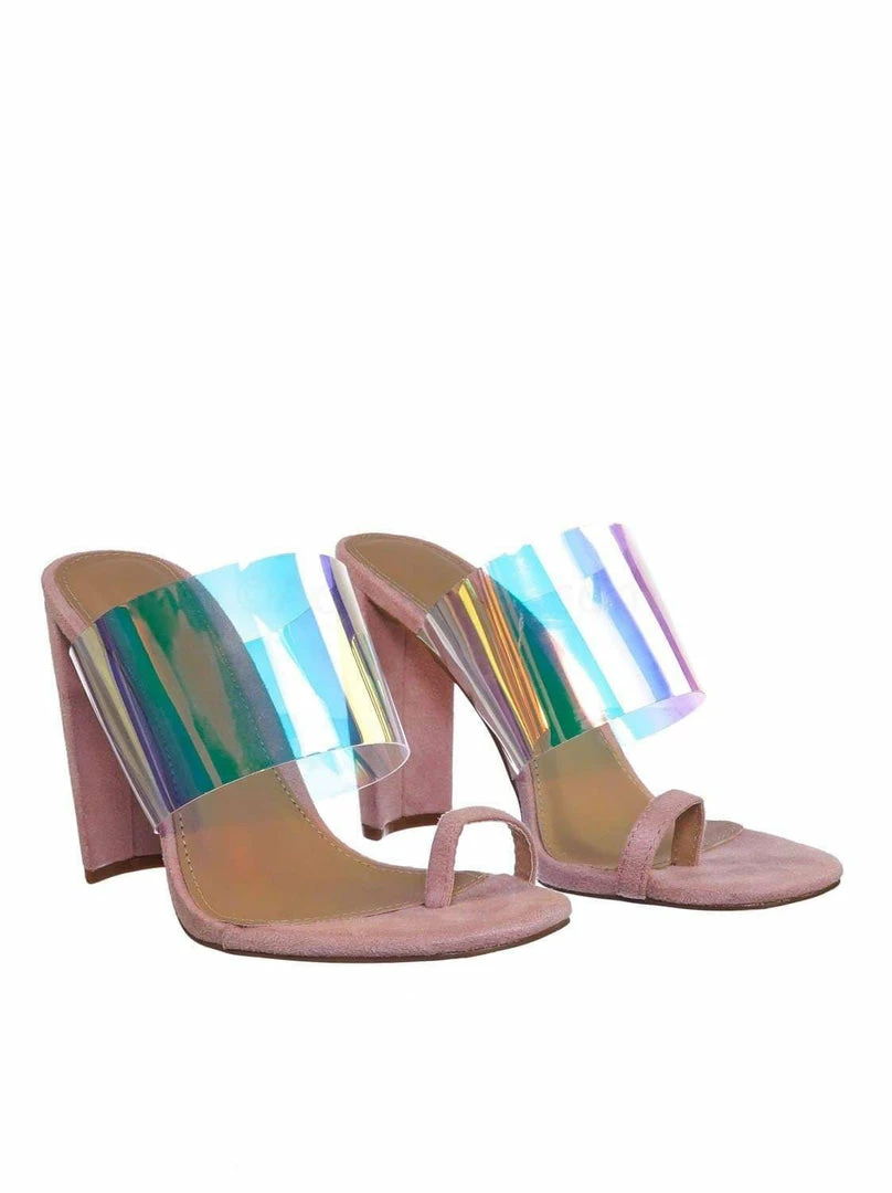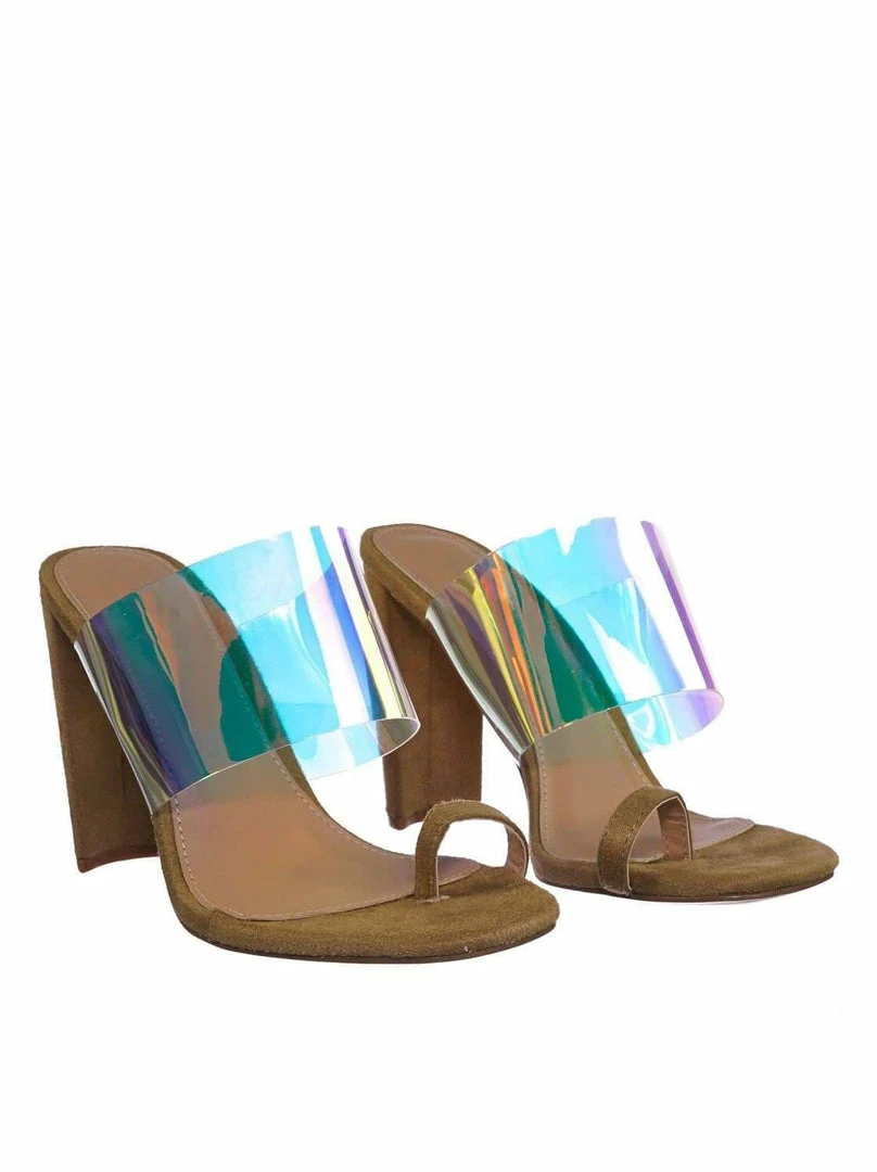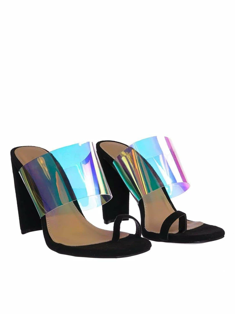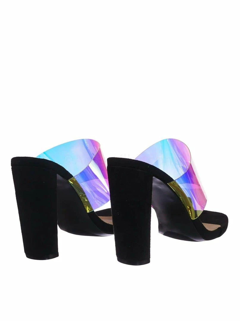 Product Detail : These high heel mule sandal features a half moon block high heel, squared open toe, toe loop, large Lucite / transparent strap and lightly padded insole. The foot band is made of holographic iridescent material so it changes color depending on room light and viewing angle.