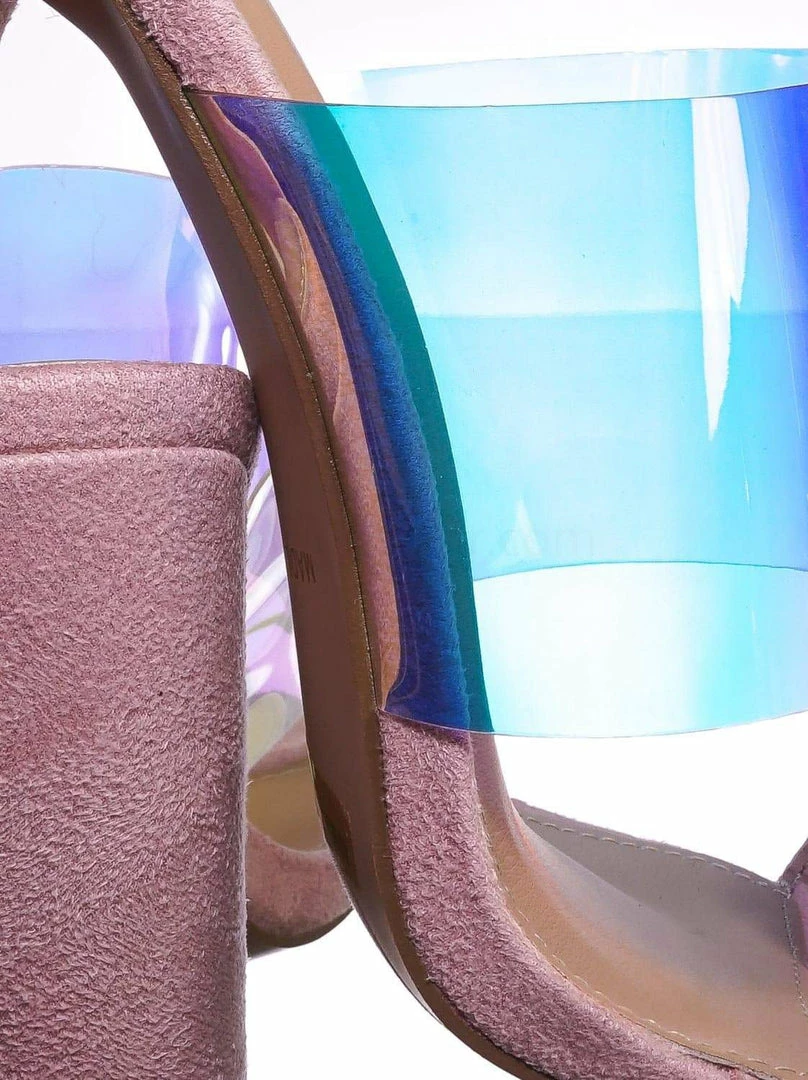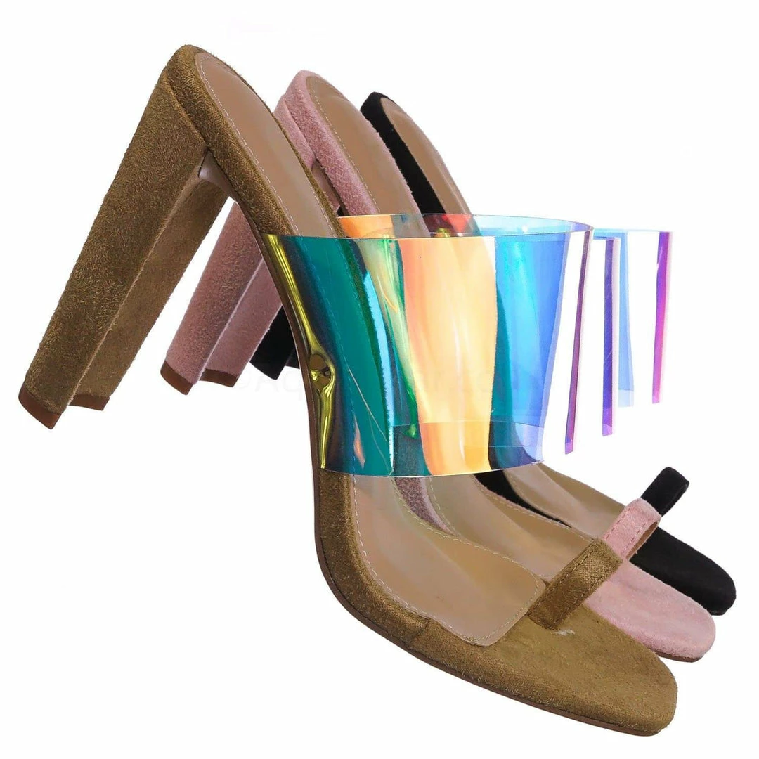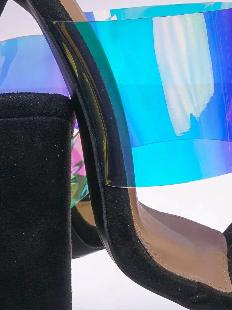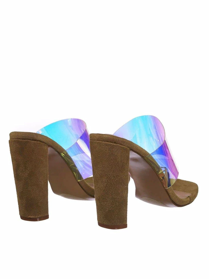Product Detail : These high heel mule sandal features a half moon block high heel, squared open toe, toe loop, large Lucite / transparent strap and lightly padded insole. The foot band is made of holographic iridescent material so it changes color depending on room light and viewing angle.