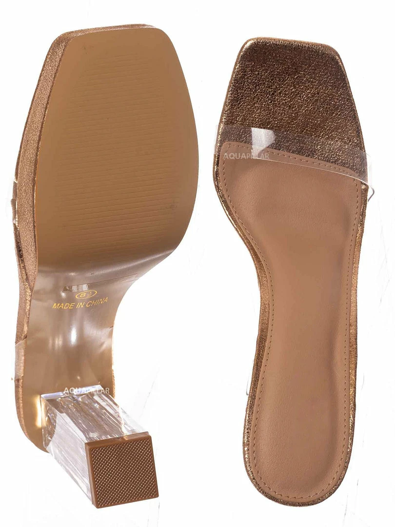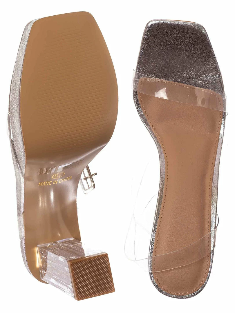 Product Detail : This dress sandal features a chunky squared block heel in transparent acrylic, clear Lucite vinyl strap, mesh glitter fabric, adjustable ankle strap, and open closed toe.