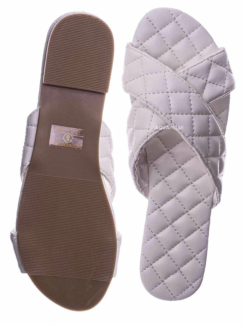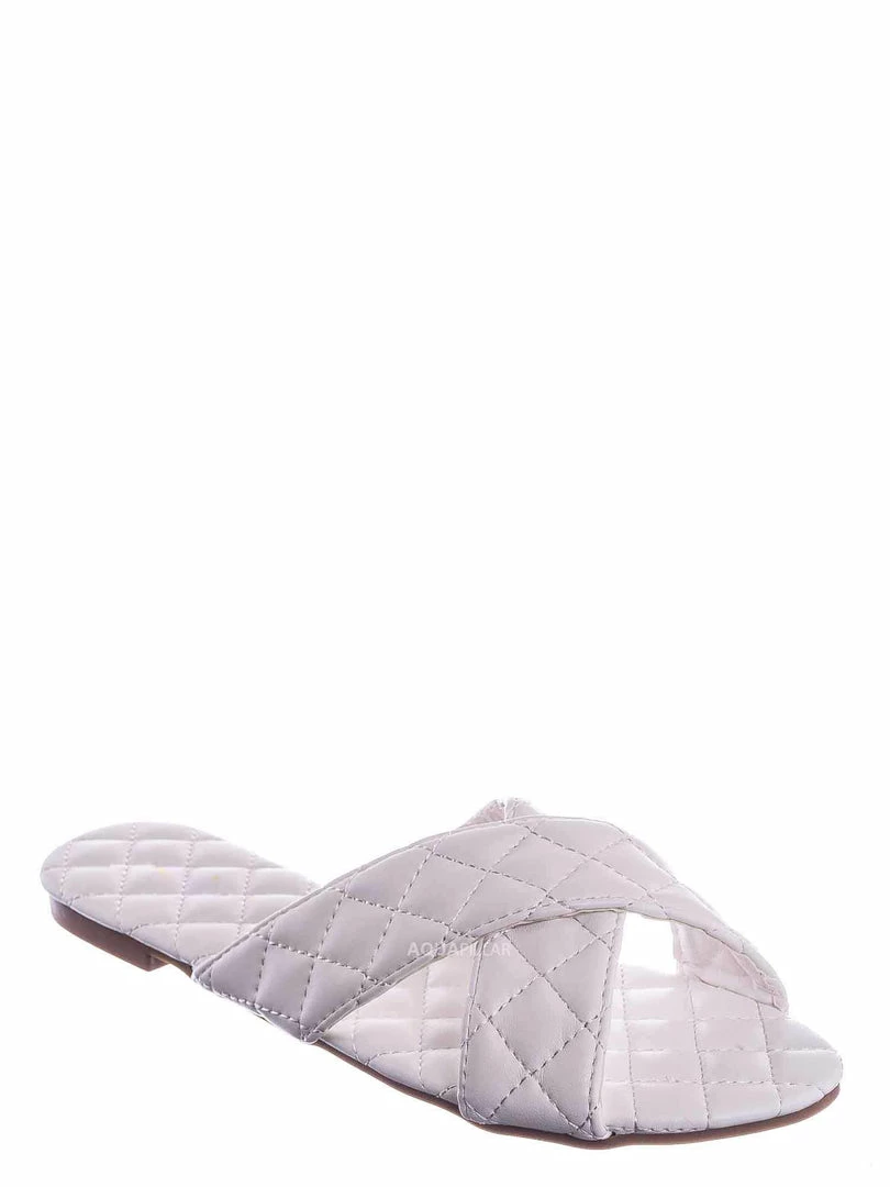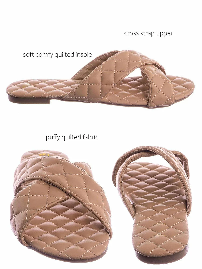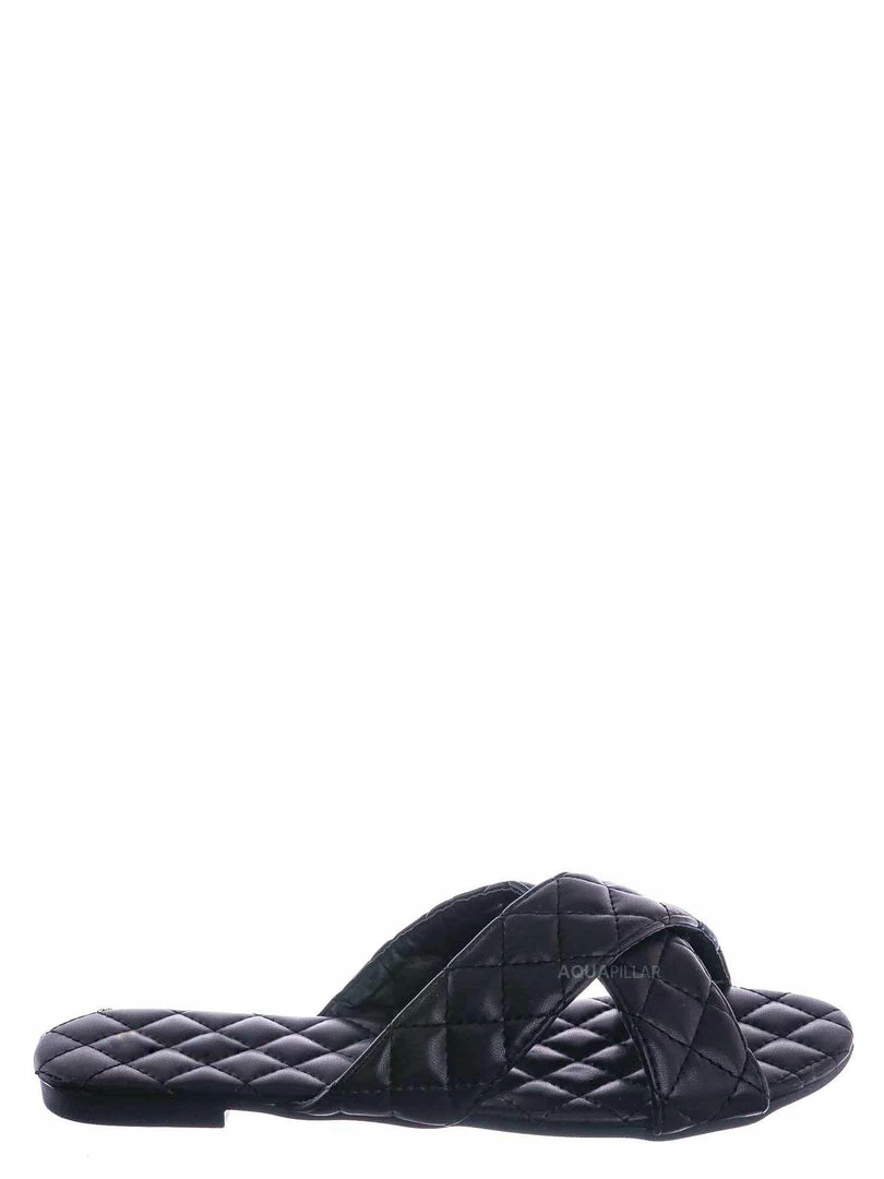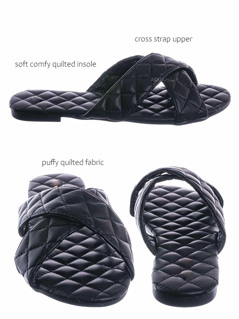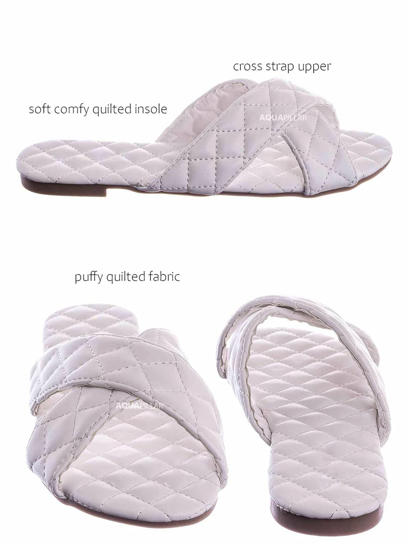 Product Detail : These slides features a puffy quilted strap and insole with double cross strap, easy to slide in construction and opened round toe.
