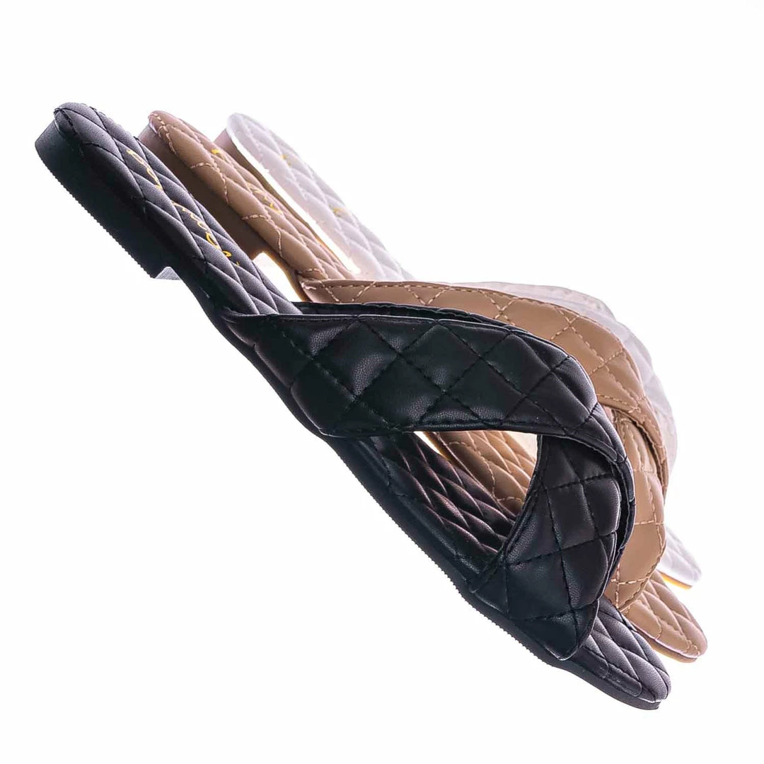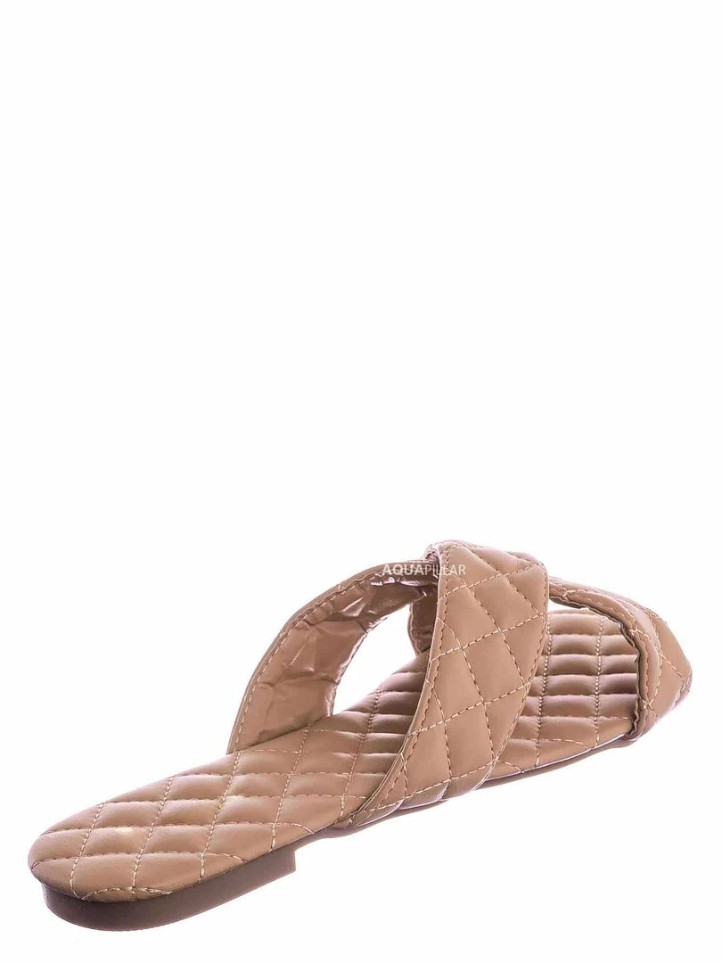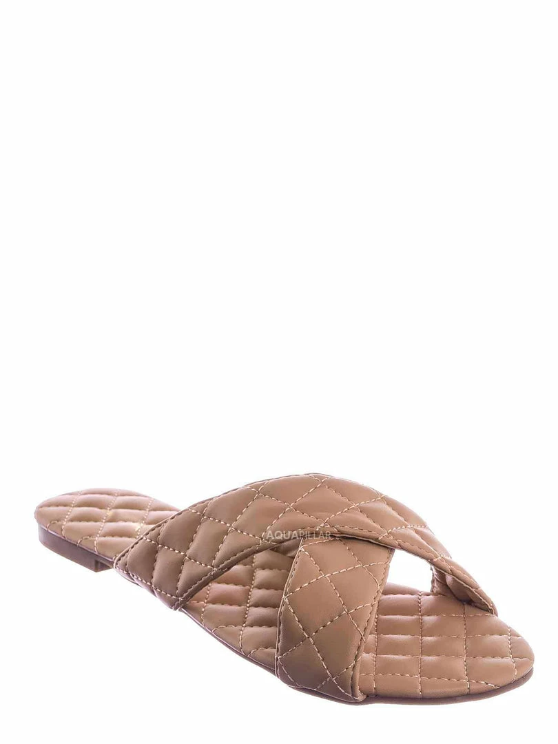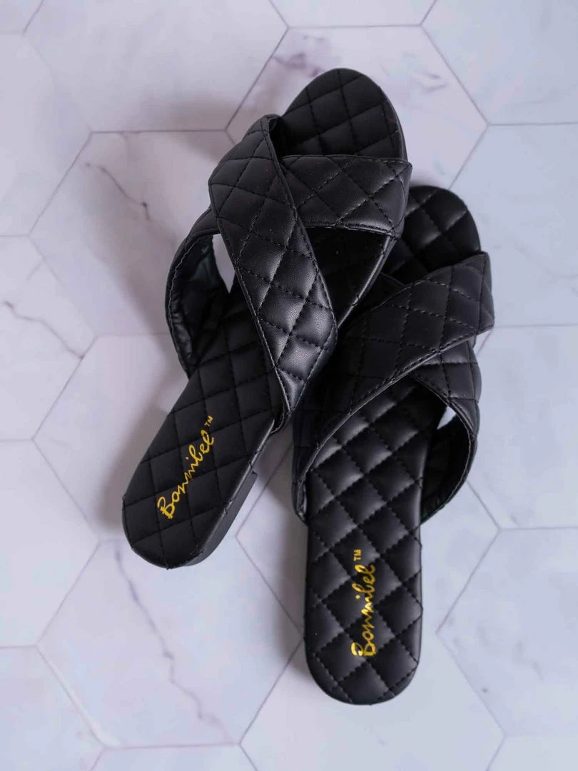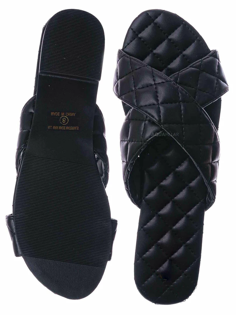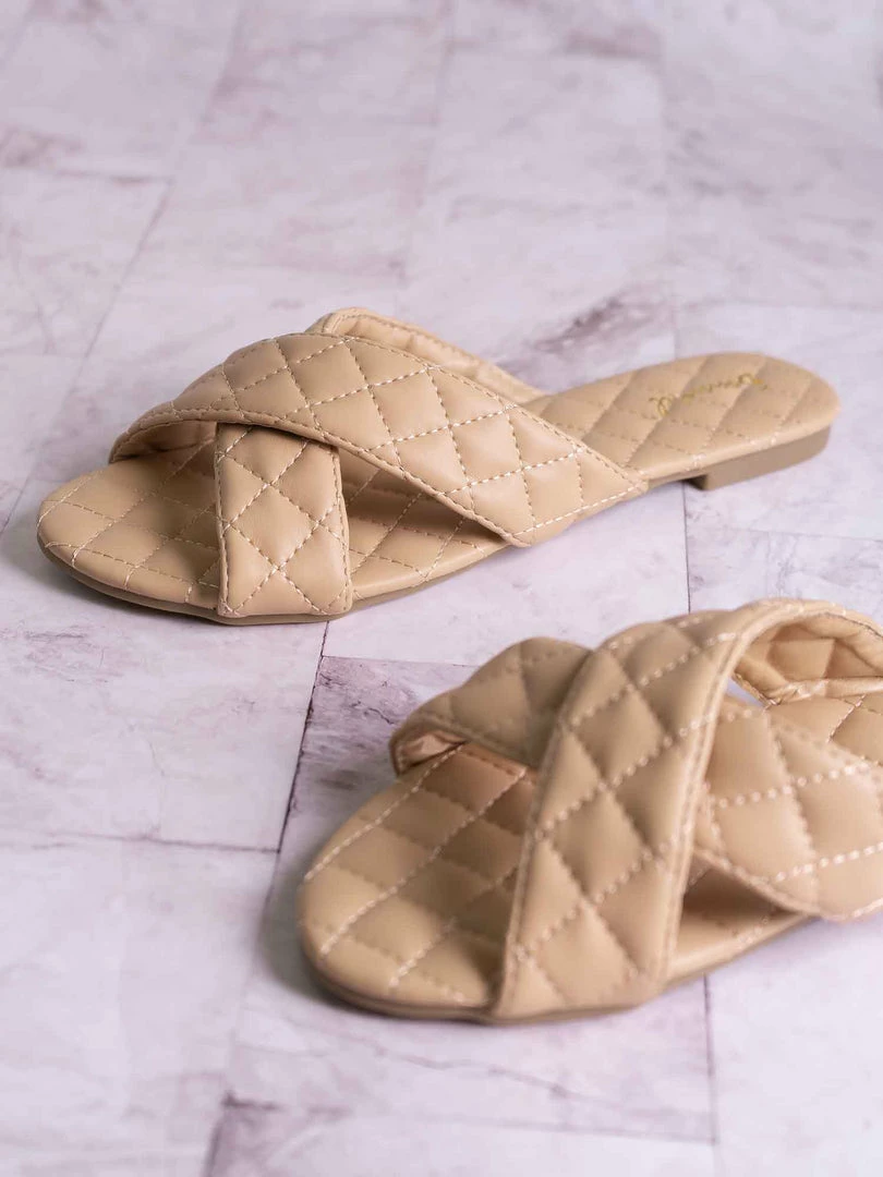 Product Detail : These slides features a puffy quilted strap and insole with double cross strap, easy to slide in construction and opened round toe.
