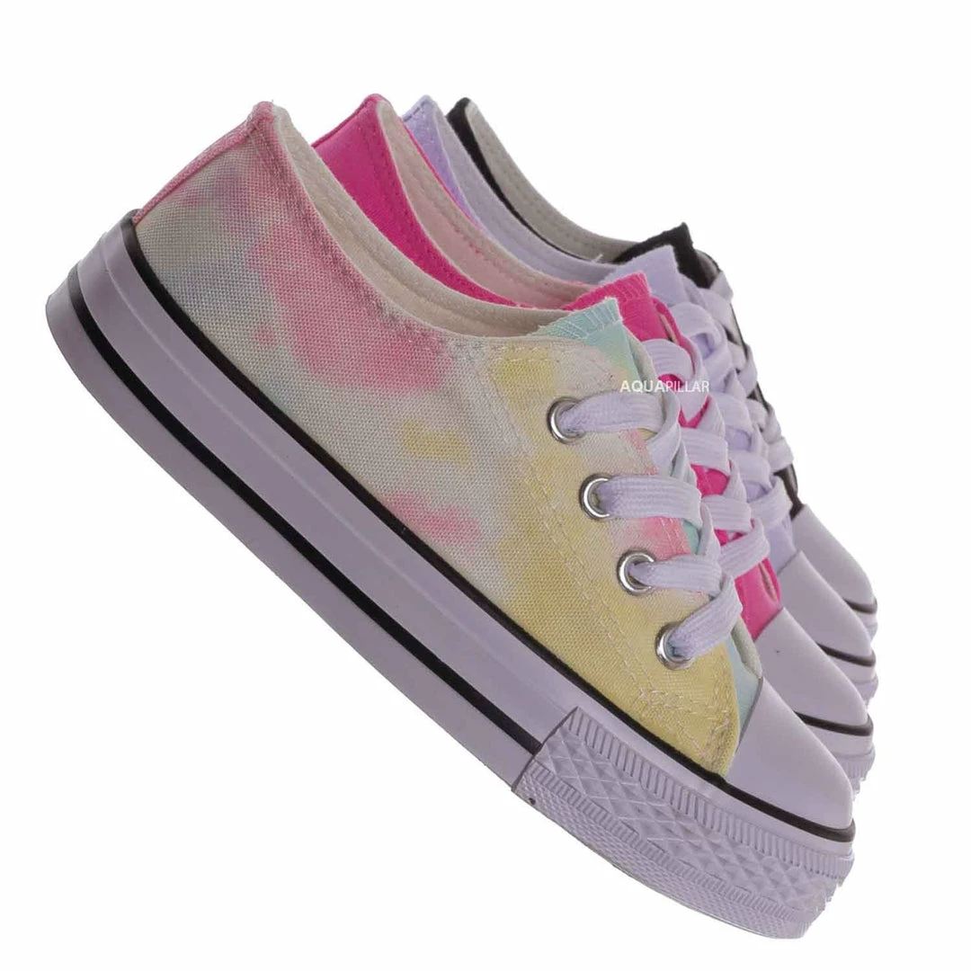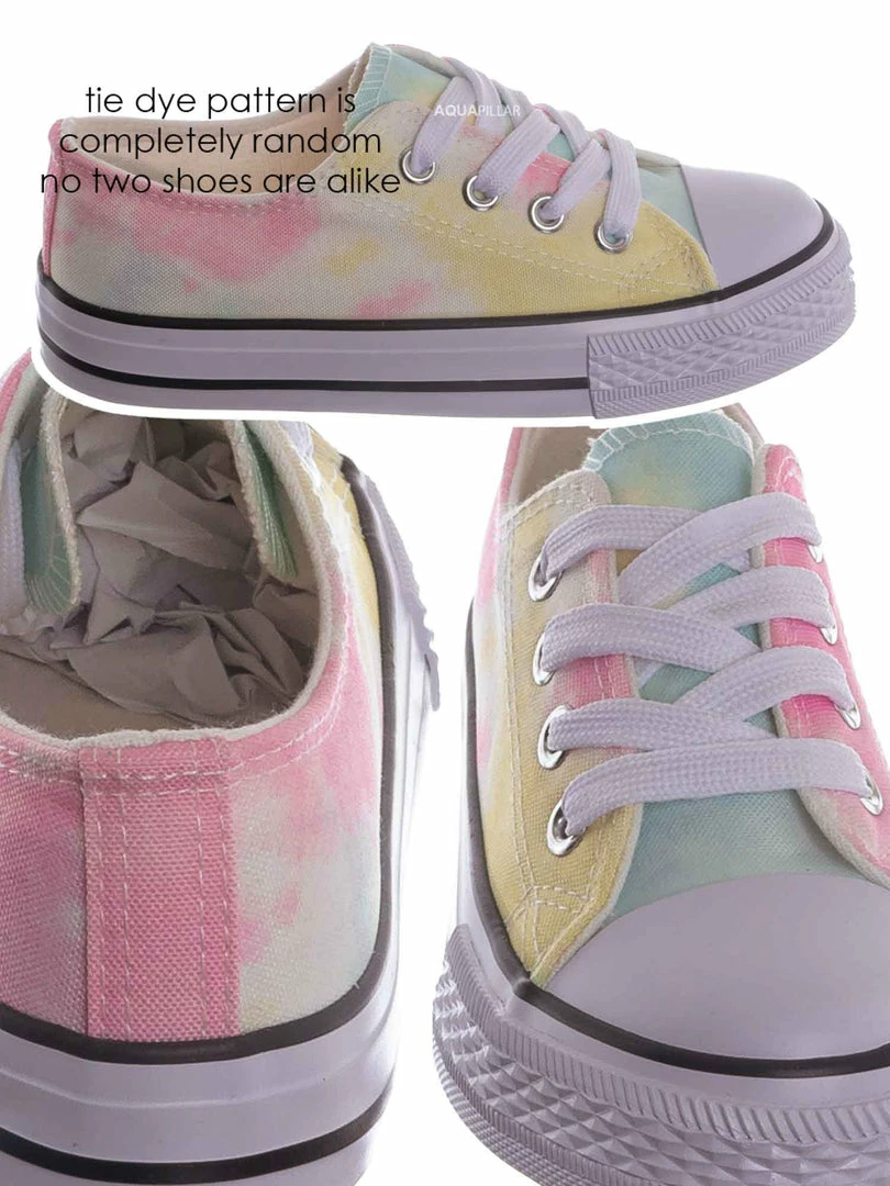 Product Detail : These sneakers for little kids features a classic lace up silhouette thick comfortable rubber platform, easy to slip on or lace up construction and contrasting cap toe. Choose from solid or tie dye. Tie dye selection are random, no two shoes has the same color distribution.
